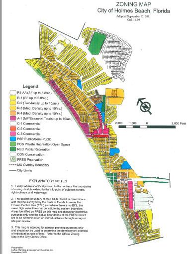 Below is the current Holmes Beach Zoning map. I would ALWAYS suggest verifying the zone your property is in by calling Holmes Beach City hall and confirming what they have on record. The map is not 100% accurate from property to property however it does paint a picture for Holmes Beach zones.