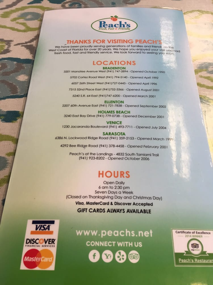 Sorry, the Holmes Beach location of Peach’s has closed. However there are still locations just off Anna Maria Island.