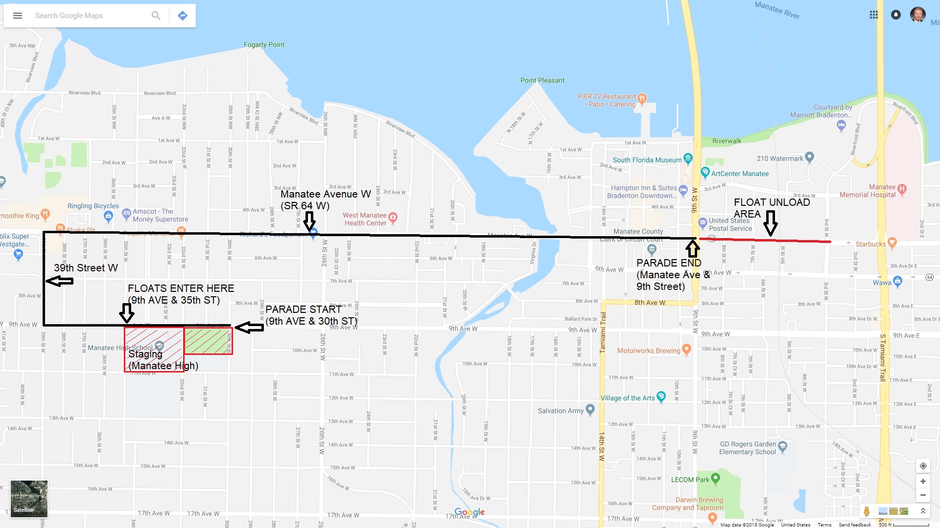 The parade travels 2.4 miles in a 3 hour time span with over 150 illuminated floats/entries. The parade starts at Manatee High School, and then travels to Manatee Avenue where it continues until it reaches Downtown Bradenton.