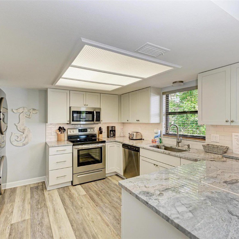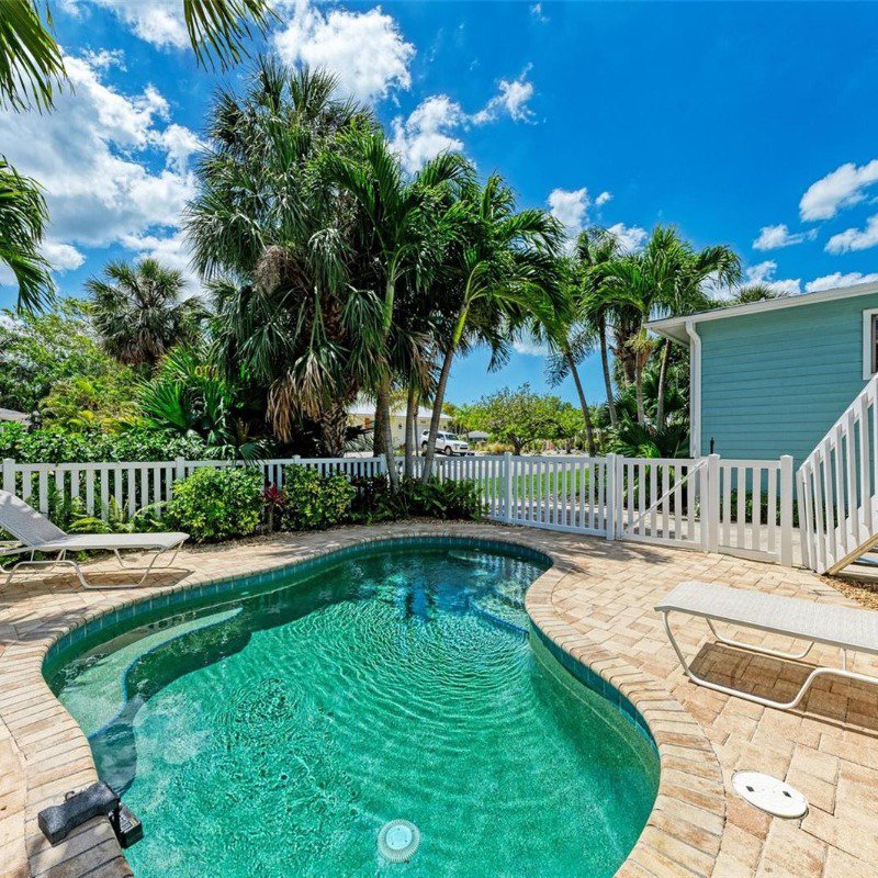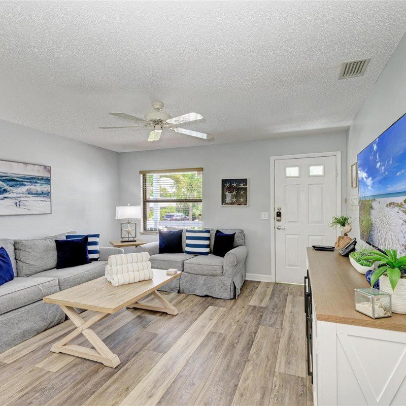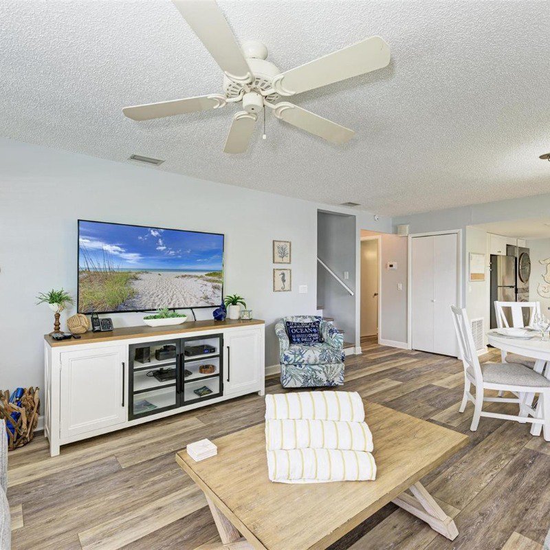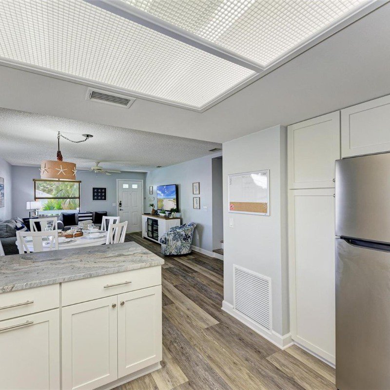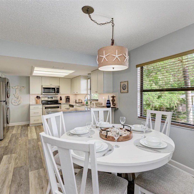 This 2 bed/2 bath picture perfect island dream is ideally situated on a quiet street, just two short blocks from the Gulf Beaches! Elevated, with a private pool and your own garage, you will enjoy relaxing surrounded by coastal charm. The updated, open kitchen with quartz counters, is equipped with stainless steel appliances and ample shaker style white cabinetry. Your guests will enjoy their first floor accommodations with easy access to the updated bathroom with white subway tile surround and updated vanity with Moen faucet. The luxury vinyl large plank flooring throughout is ideal for beach living, and ties the open living and dining room together. Upstairs you will relish the privacy of your primary retreat. The sunlight brightens your spacious room that includes a walk in closet. And your en suite bath has a glass enclosed shower, with tile bench and pebble stone shower flooring. And outdoors, you can relax on your front porch, or cool off in your own pool! Embrace the island life in this lovely land condo, and use it as a short term rental when you are away.