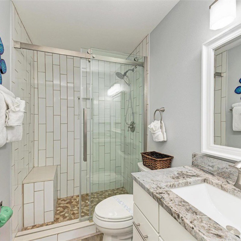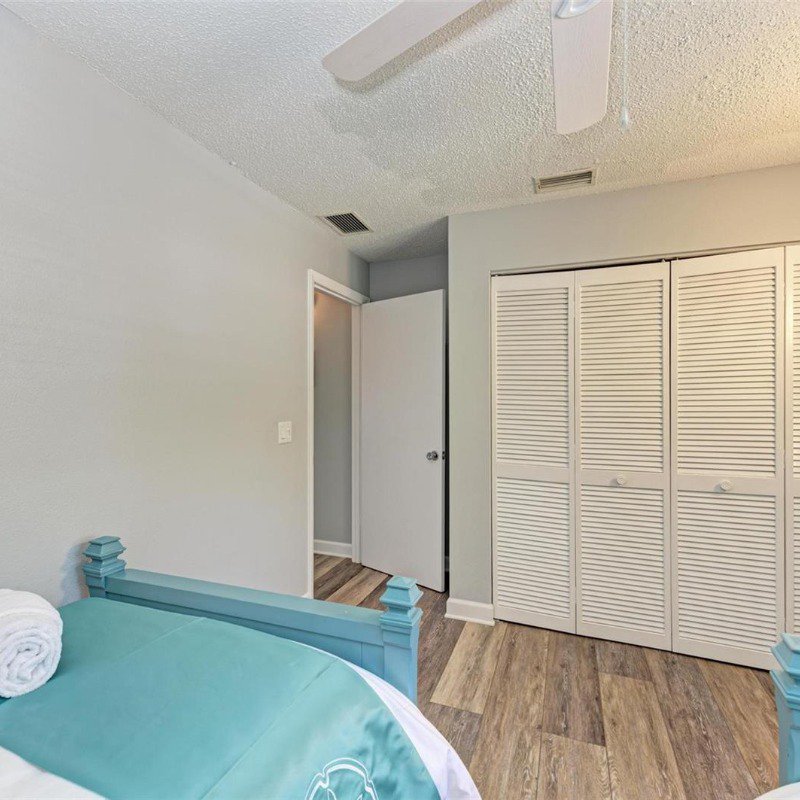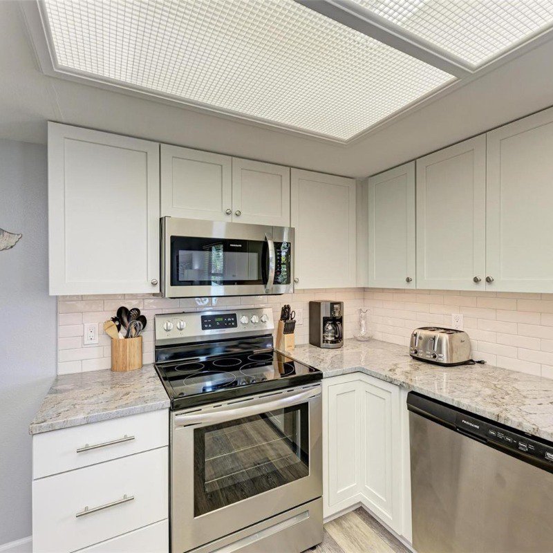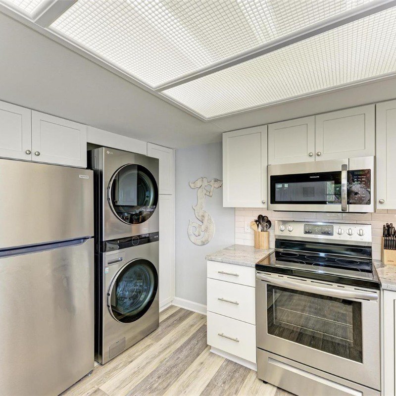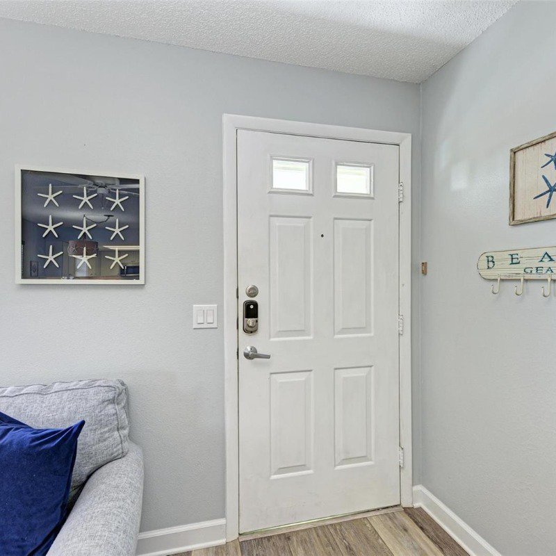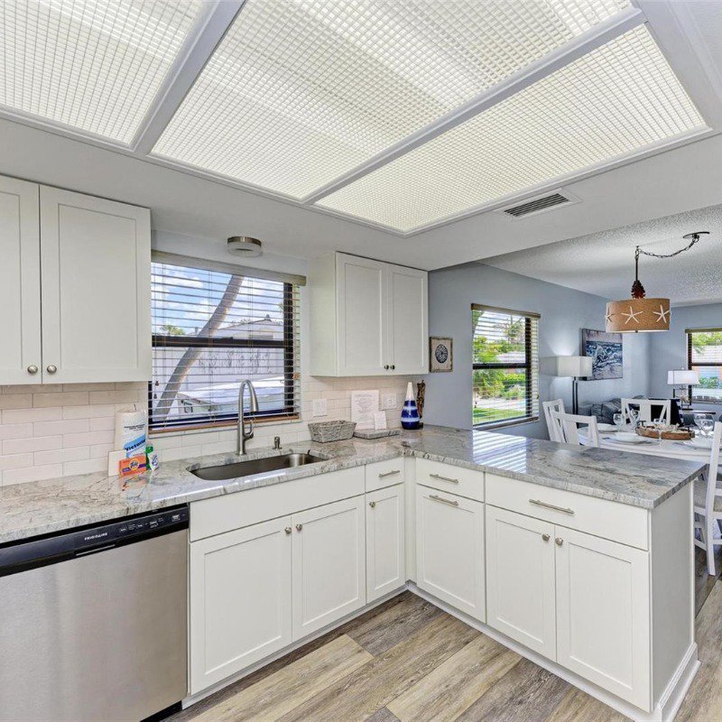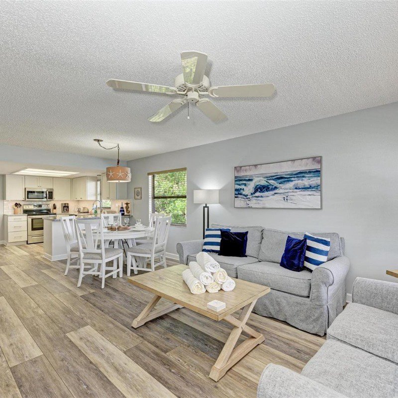 This 2 bed/2 bath picture perfect island dream is ideally situated on a quiet street, just two short blocks from the Gulf Beaches! Elevated, with a private pool and your own garage, you will enjoy relaxing surrounded by coastal charm. The updated, open kitchen with quartz counters, is equipped with stainless steel appliances and ample shaker style white cabinetry. Your guests will enjoy their first floor accommodations with easy access to the updated bathroom with white subway tile surround and updated vanity with Moen faucet. The luxury vinyl large plank flooring throughout is ideal for beach living, and ties the open living and dining room together. Upstairs you will relish the privacy of your primary retreat. The sunlight brightens your spacious room that includes a walk in closet. And your en suite bath has a glass enclosed shower, with tile bench and pebble stone shower flooring. And outdoors, you can relax on your front porch, or cool off in your own pool! Embrace the island life in this lovely land condo, and use it as a short term rental when you are away.