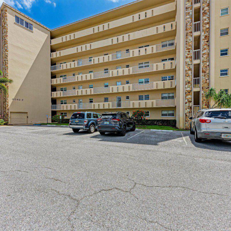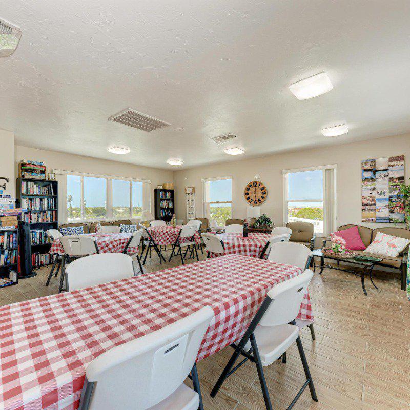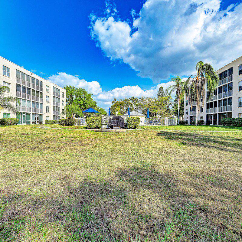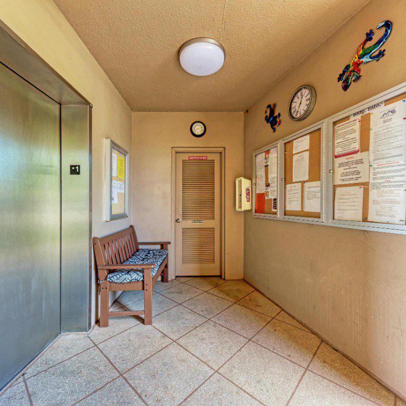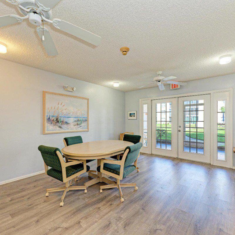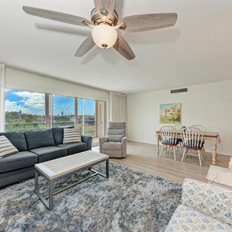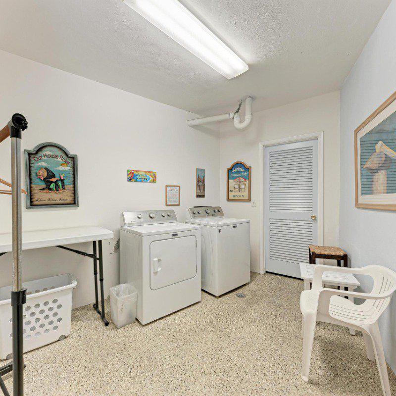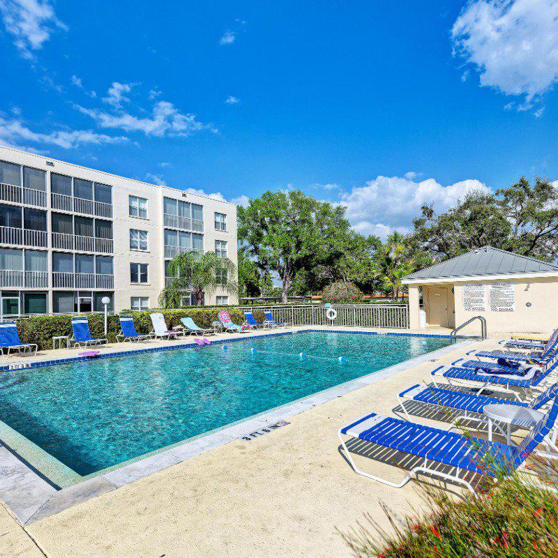 Residents enjoy a washer and dryer conveniently located near the elevator (no cost to use) and access to the Skyroom on the 7th floor—perfect for social gatherings and sunset views. The nearby clubhouse offers a fitness center, billiards room, heated pool, shuffleboard, and bocce courts.