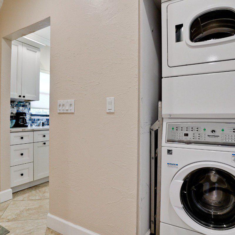 The condo overlooks the tennis courts and features a stylish, updated kitchen with quartz countertops, stainless steel appliances, and an open, light-filled floor plan. Crown molding throughout, all-tile flooring, and a spacious screened lanai enhance the elegant coastal feel. A washer and dryer are conveniently located inside the unit, along with a private owner’s storage room on the ground level.