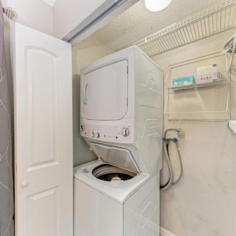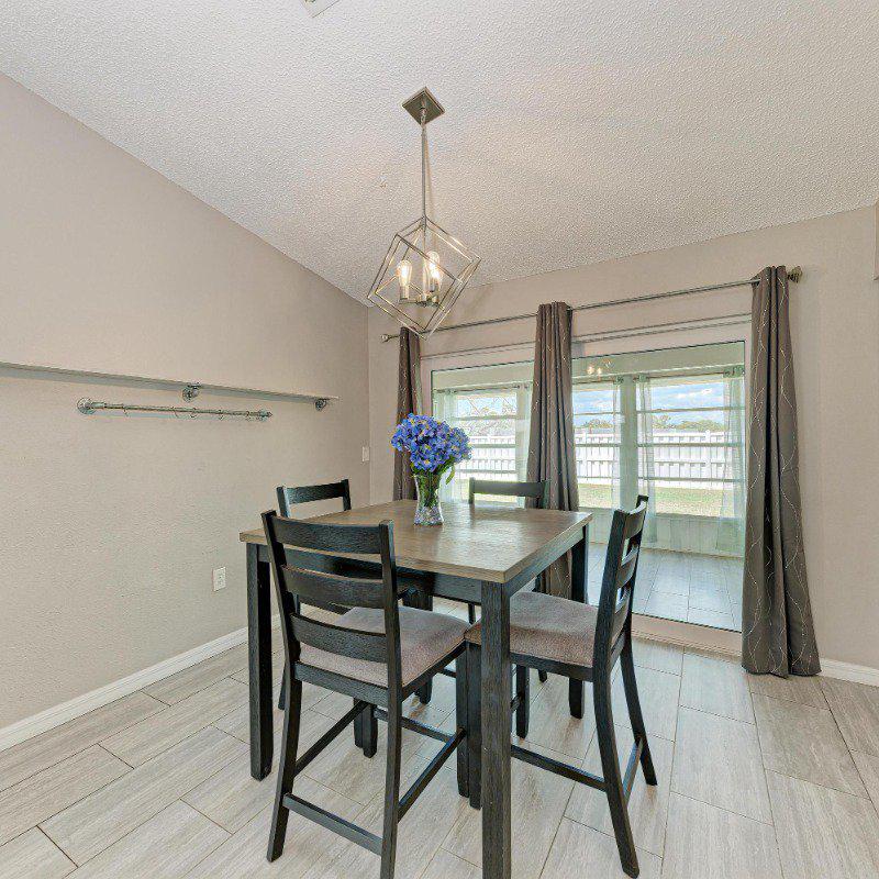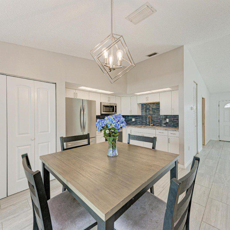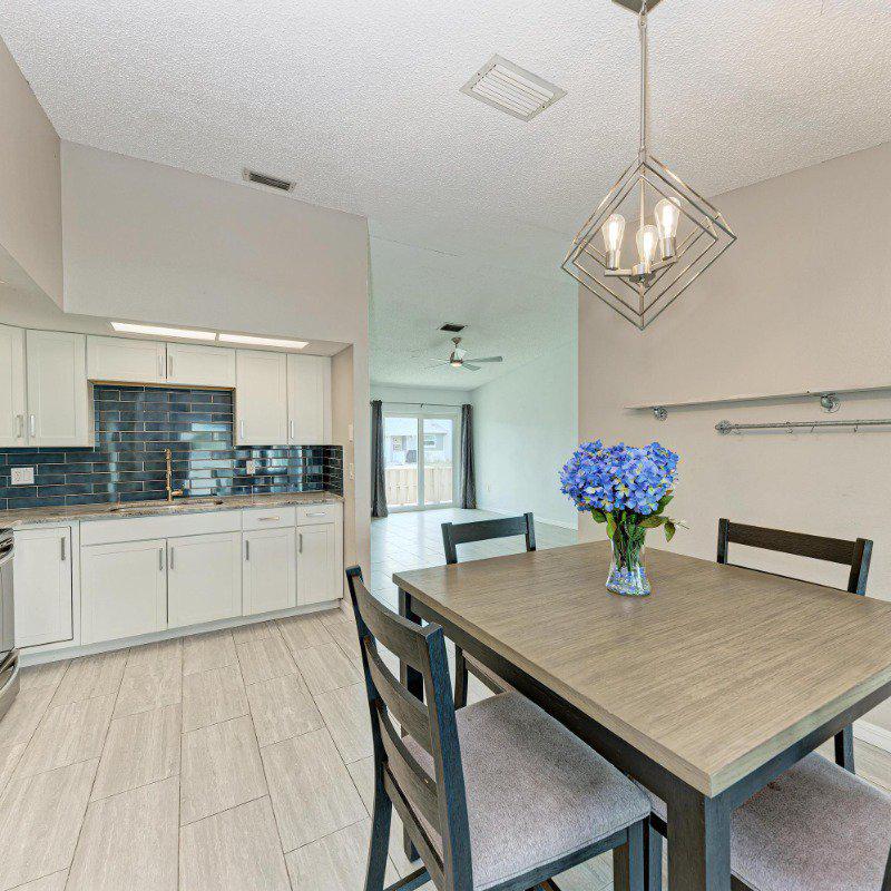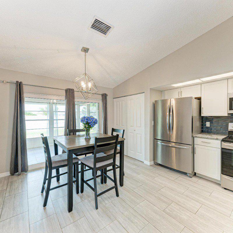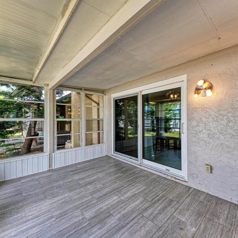 The adjacent eat-in kitchen boasts updated cabinetry, granite countertops, stainless steel appliances, and a convenient laundry closet with a stacked washer and dryer. Sliding doors lead to a bright, glass-enclosed Florida room—perfect as a home office, playroom, or peaceful retreat.