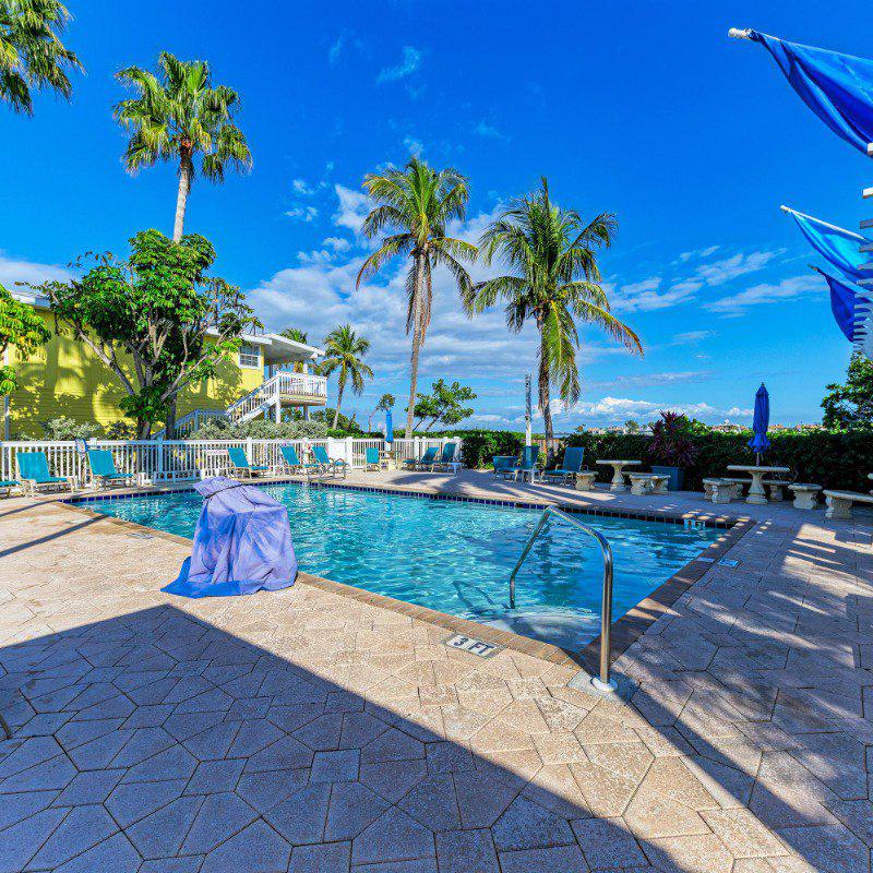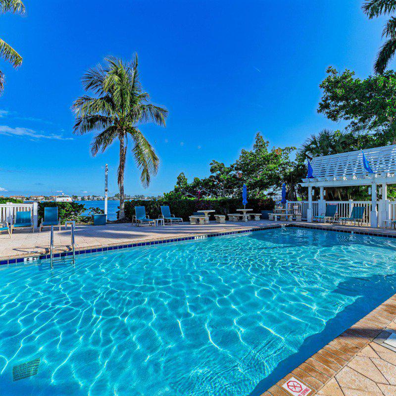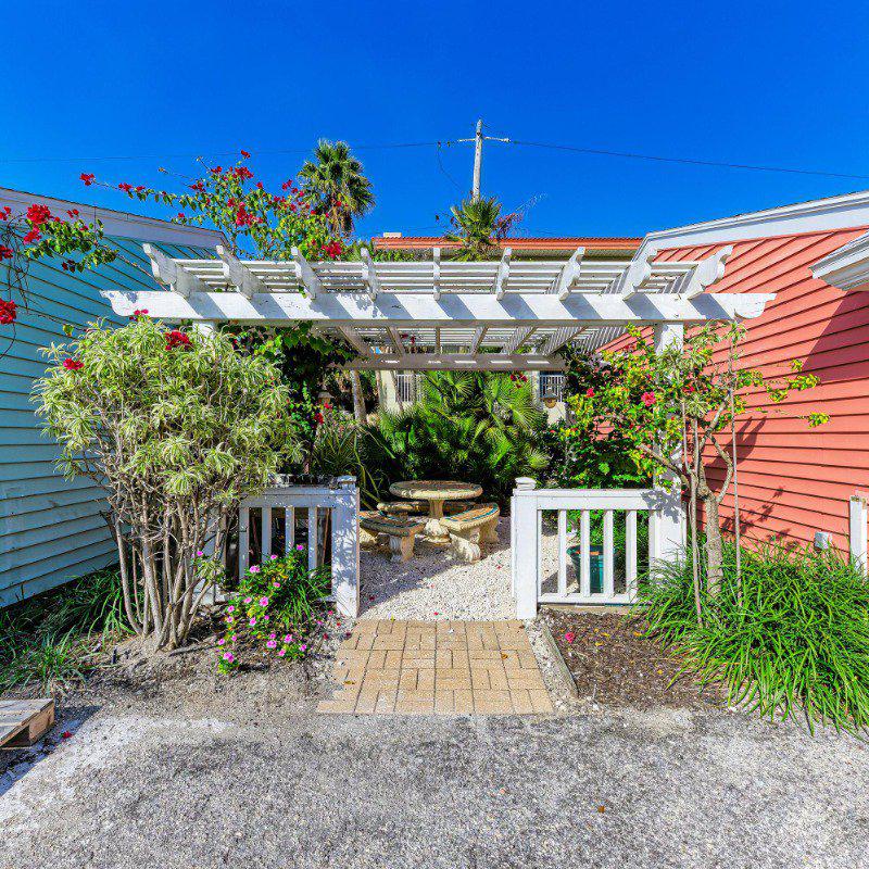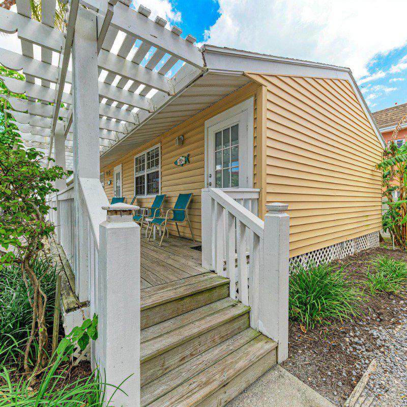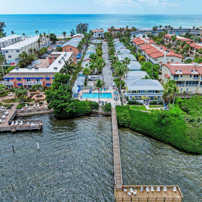 Located within Tradewinds Beach Resort, this charming community captures the essence of Old Florida. Pastel, Key West–style cottages are nestled along a quiet private street, surrounded by lush jasmine and bougainvillea. Residents and guests enjoy a large heated bayfront pool set among swaying palms, along with a fishing pier extending into Sarasota Bay.