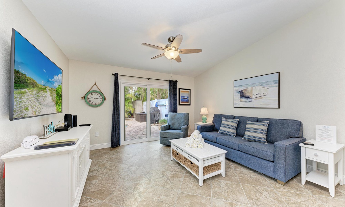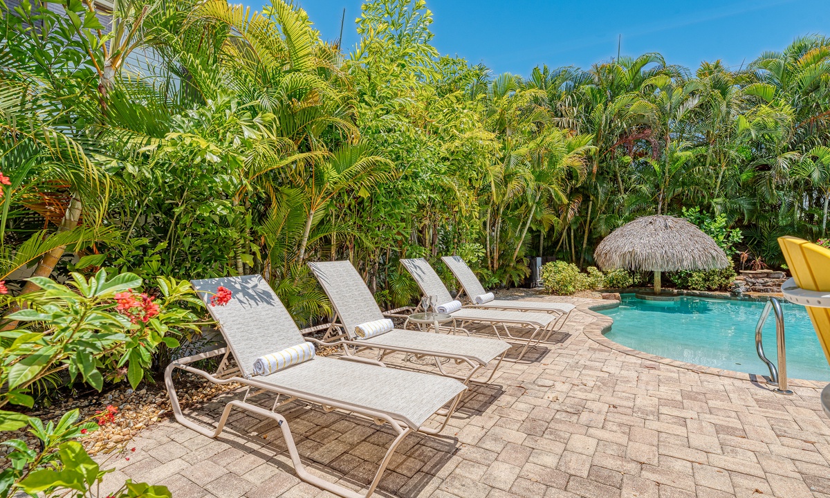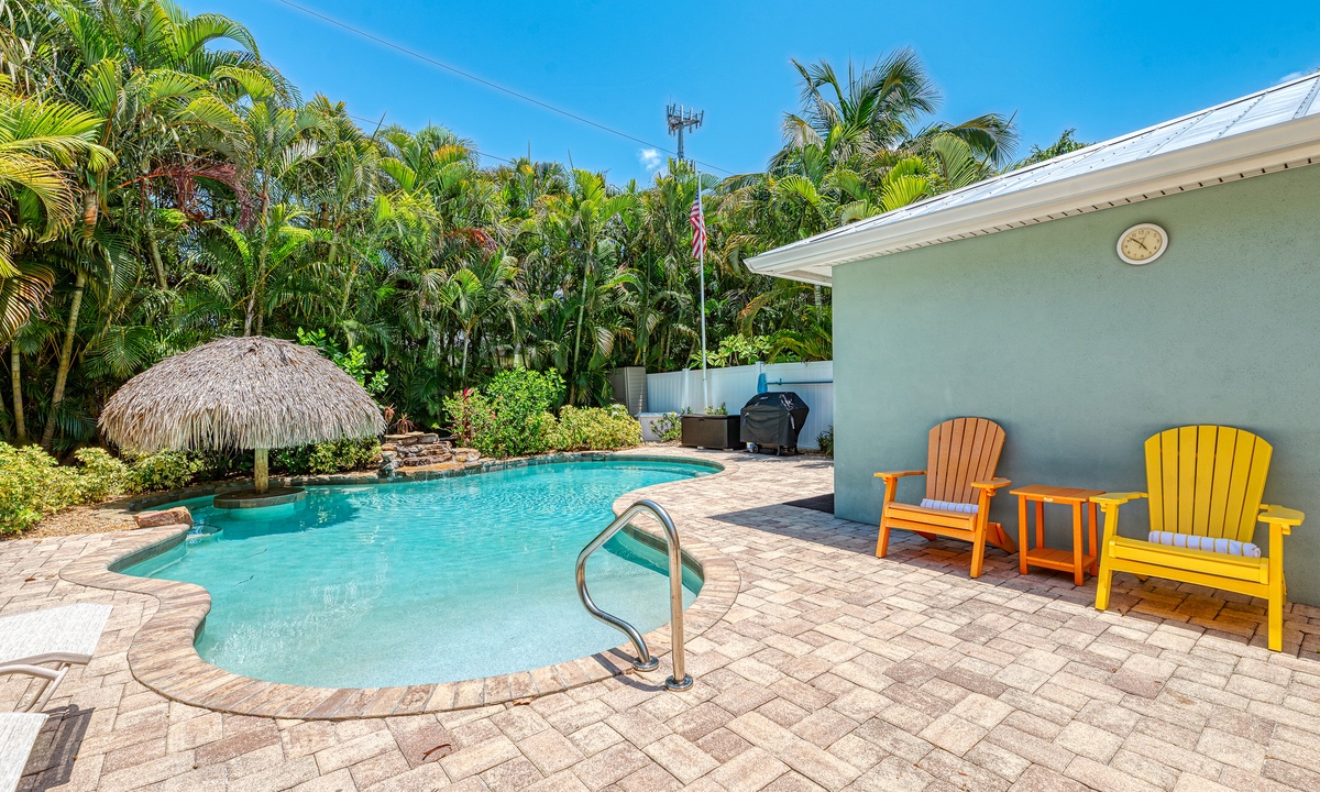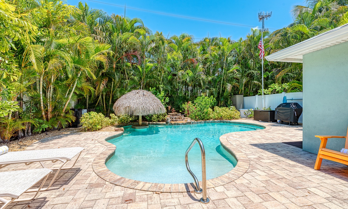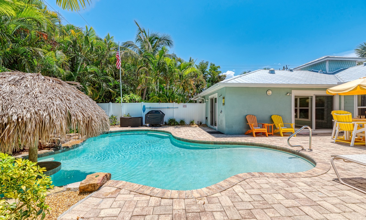 The tiki waterfall heated pool with comfortable pool side furniture will melt your worries away. This ground level property is only a short walk to the beach for all day fun in the water or stroll back later for a magical sunset on the Gulf of America.