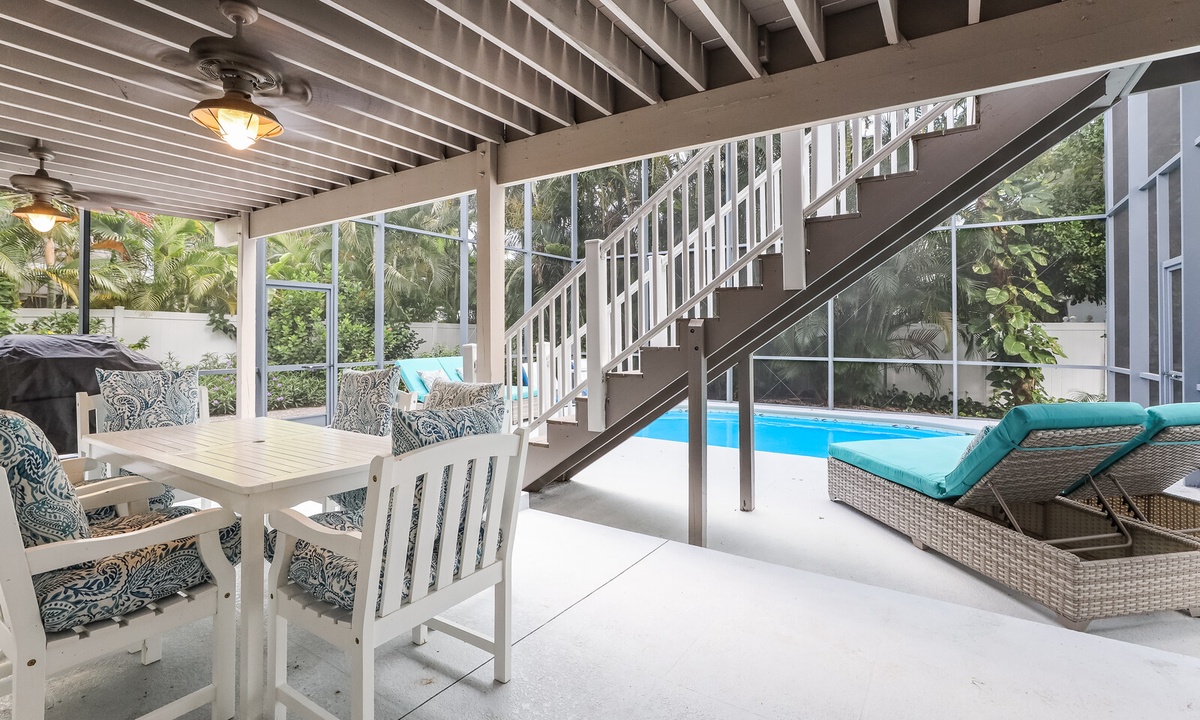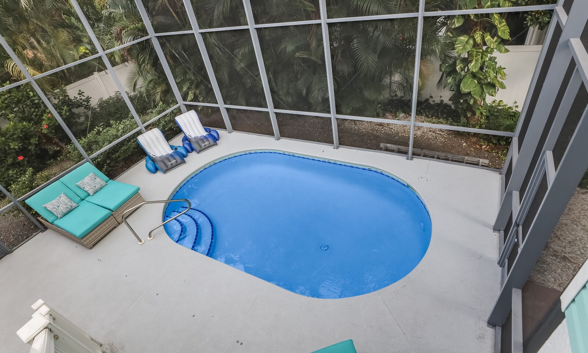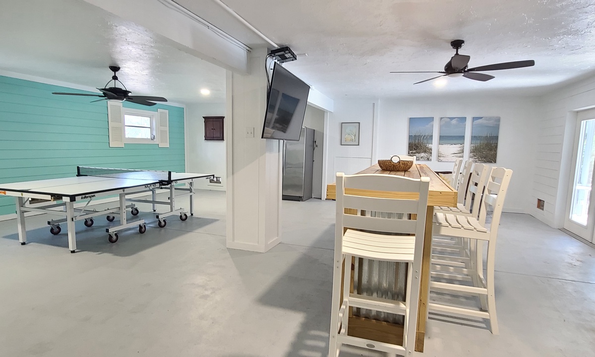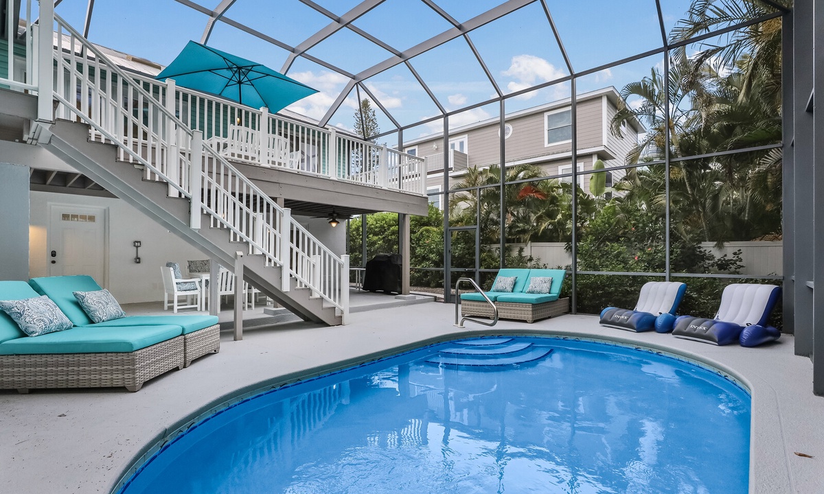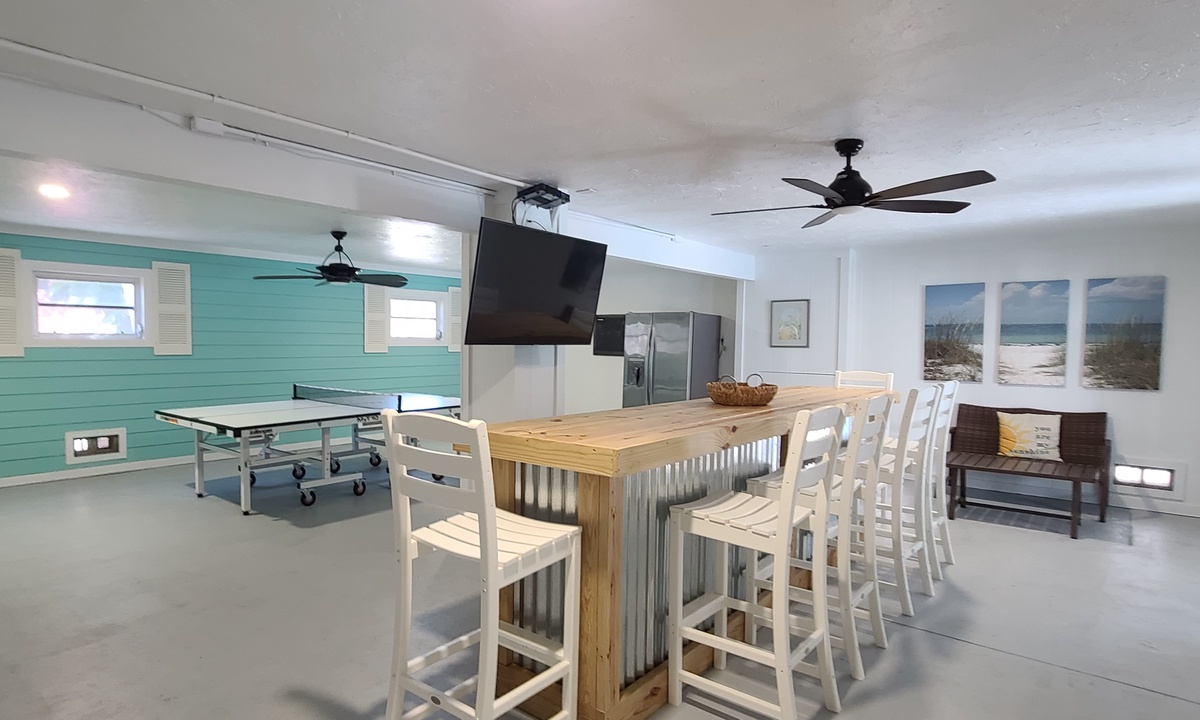 Enjoy lounging in the covered poolside seating area in cushioned outdoor furniture, or splash around in the heated private pool. The perfect place for an afternoon libation or a relaxing book! Also enjoy some time with family and friends in the custom bar and game room with TV, bar seating for 6, a ping pong table, dart board and a comfortable seating area for taking it all in.