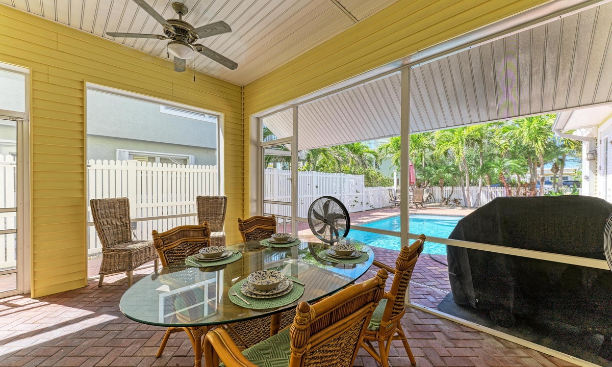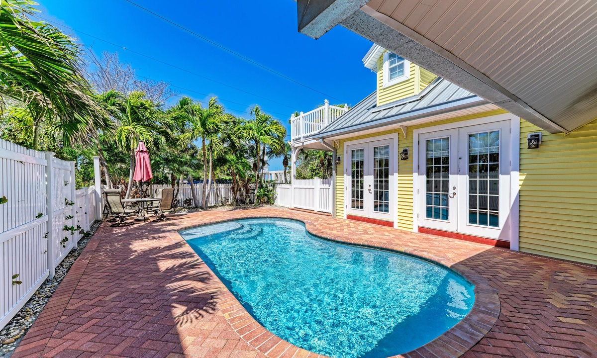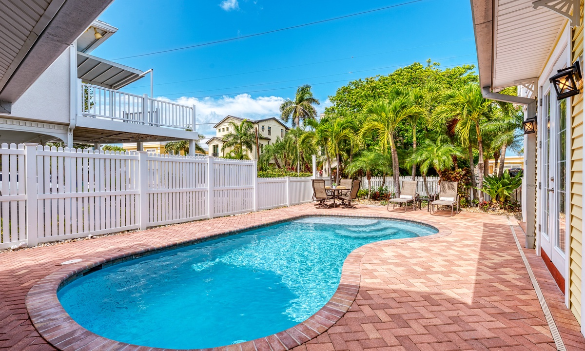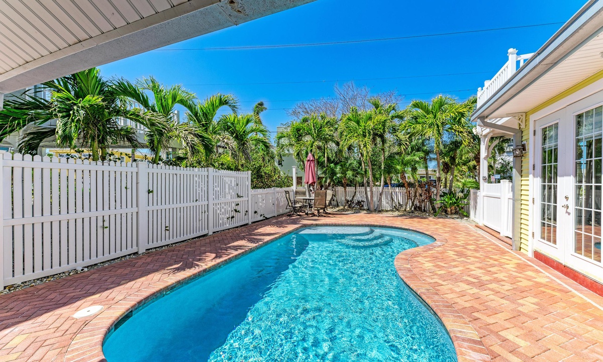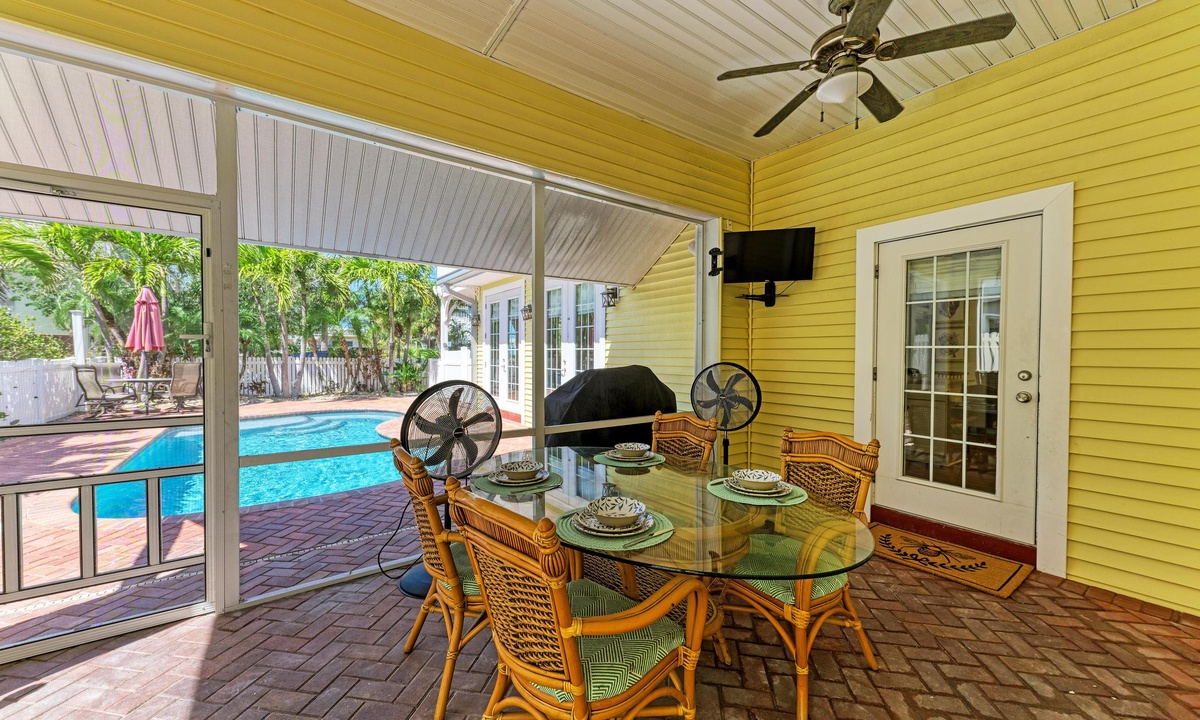 Step through the door and you will feel right at home with all the furnishings and decorations you could want. Cozy seating area, dining room table, kitchen counter seating options, and kitchen area offer a great space to catch up and enjoy your meals and watch your favorite movies. The natural light in this space when you open the blinds will provide you with a true island experience! Through the French doors off the living room, you will find your private pool with lounge chairs, an outdoor shower and a seating table for 4. The propane grill and screened in outdoor kitchen area right off the pool offers guests a great entertaining space! The screened in area has another table for 4, a sink and counter area, as well as a small flatscreen TV. In the back of the home there is a small fire pit!