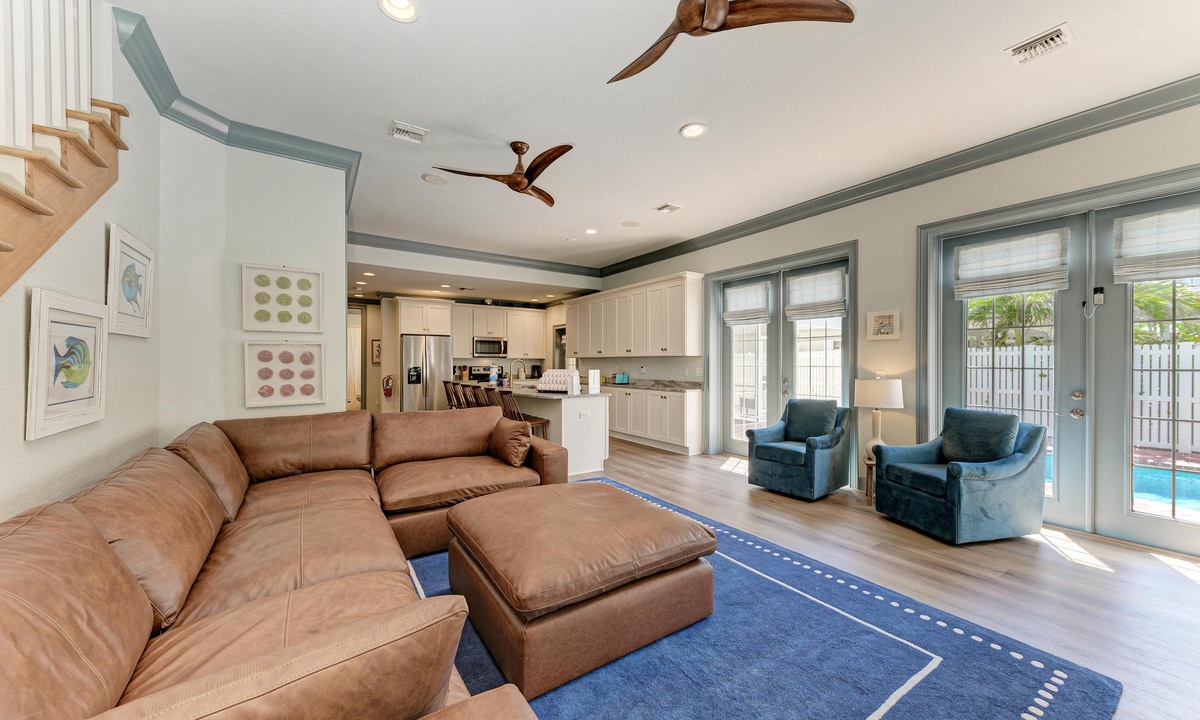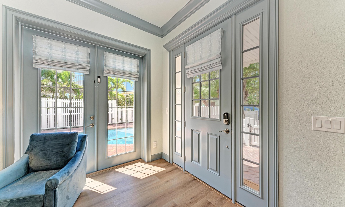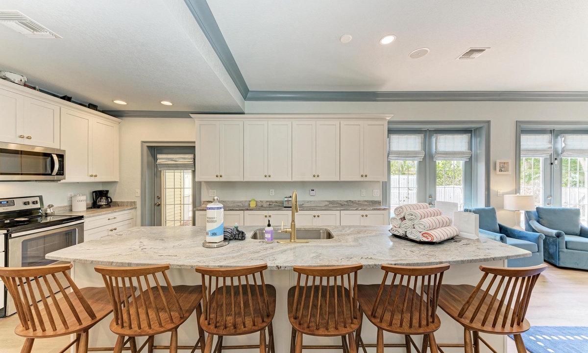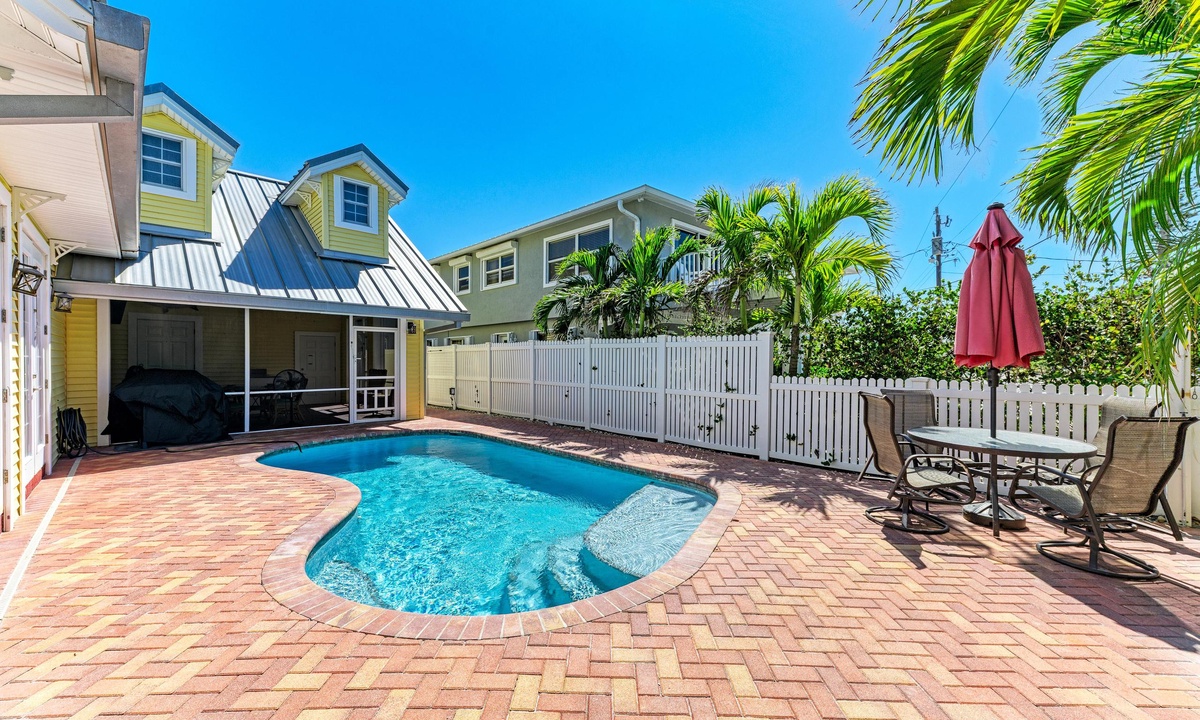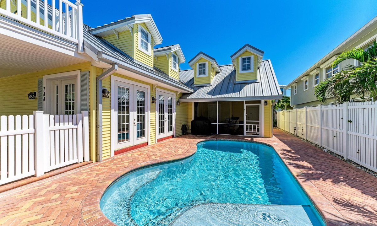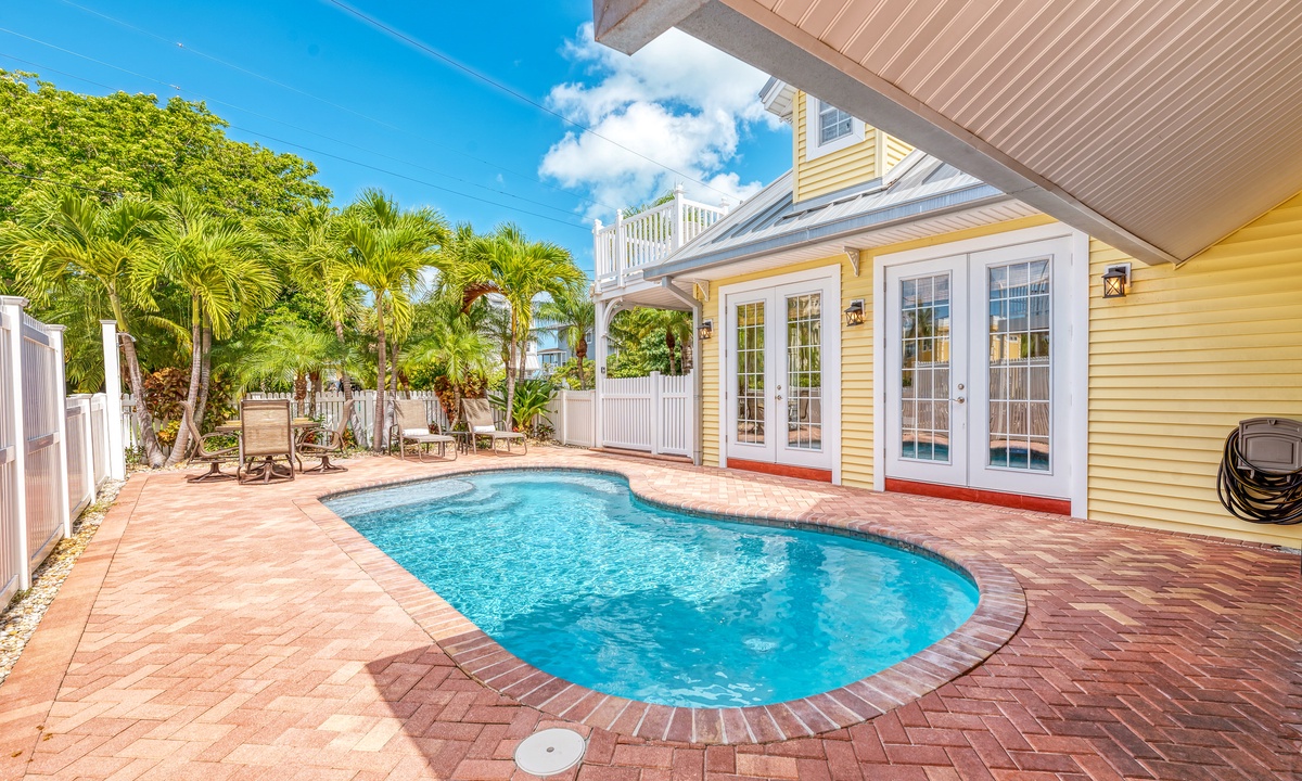 Step through the door and you will feel right at home with all the furnishings and decorations you could want. Cozy seating area, dining room table, kitchen counter seating options, and kitchen area offer a great space to catch up and enjoy your meals and watch your favorite movies. The natural light in this space when you open the blinds will provide you with a true island experience! Through the French doors off the living room, you will find your private pool with lounge chairs, an outdoor shower and a seating table for 4. The propane grill and screened in outdoor kitchen area right off the pool offers guests a great entertaining space! The screened in area has another table for 4, a sink and counter area, as well as a small flatscreen TV. In the back of the home there is a small fire pit!