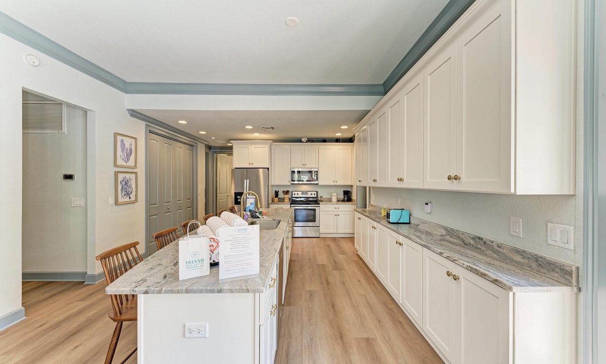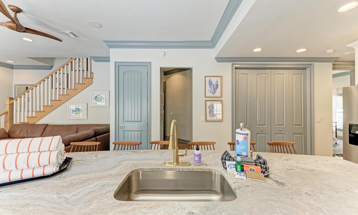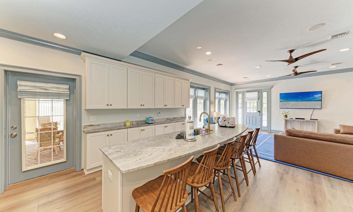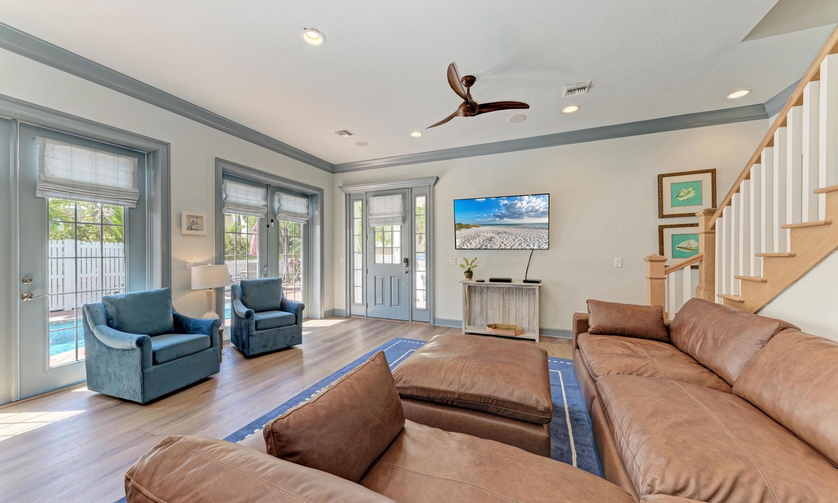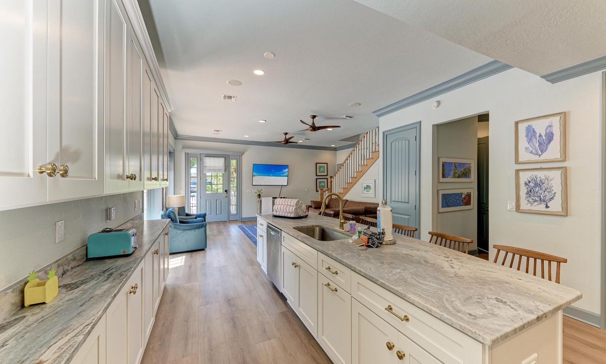 Step through the door and you will feel right at home with all the furnishings and decorations you could want. Cozy seating area, dining room table, kitchen counter seating options, and kitchen area offer a great space to catch up and enjoy your meals and watch your favorite movies. The natural light in this space when you open the blinds will provide you with a true island experience! Through the French doors off the living room, you will find your private pool with lounge chairs, an outdoor shower and a seating table for 4. The propane grill and screened in outdoor kitchen area right off the pool offers guests a great entertaining space! The screened in area has another table for 4, a sink and counter area, as well as a small flatscreen TV. In the back of the home there is a small fire pit!