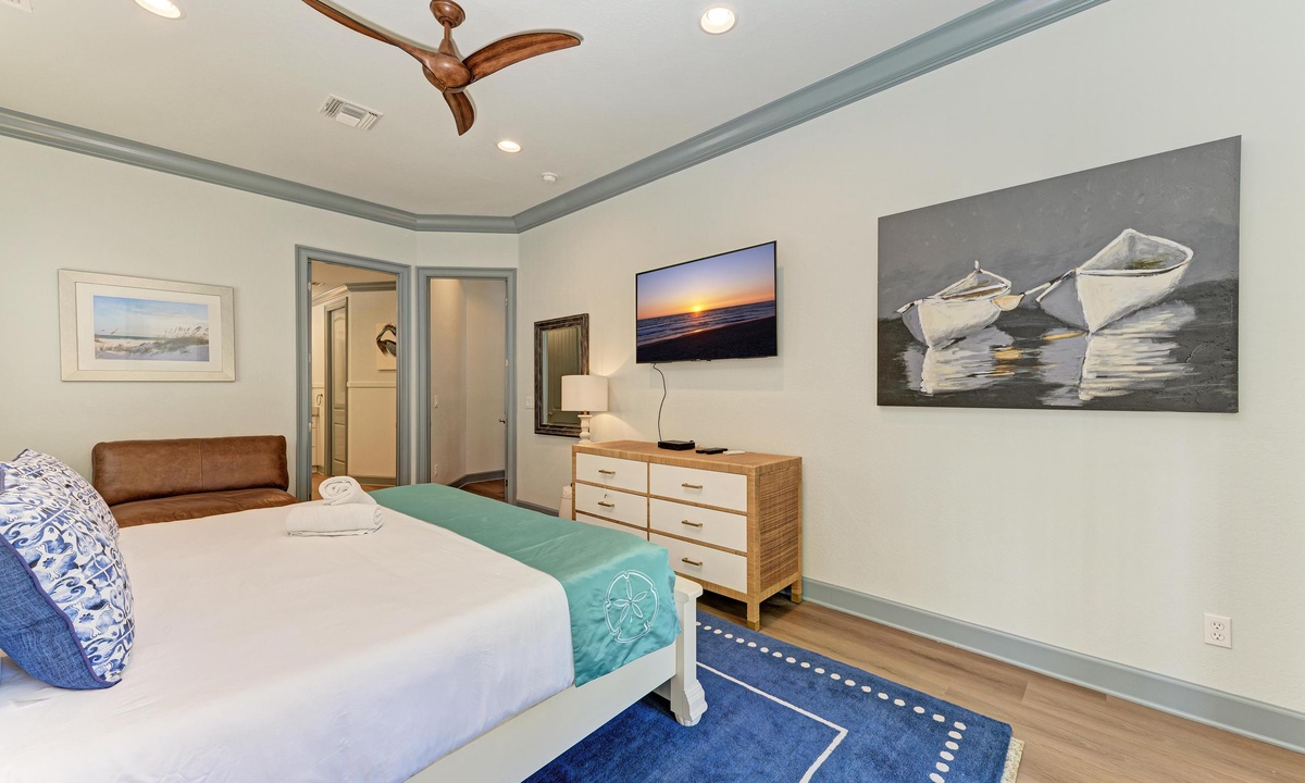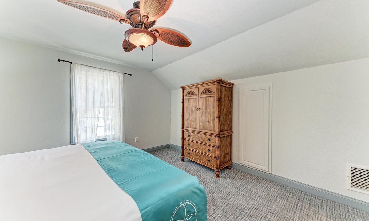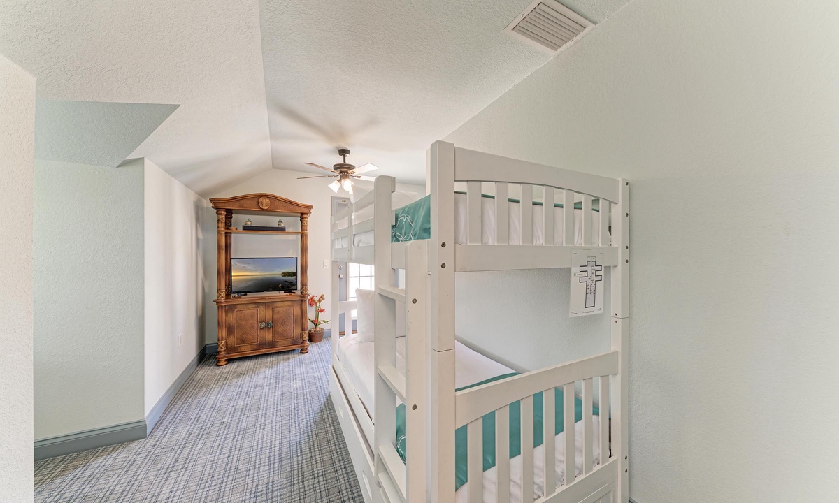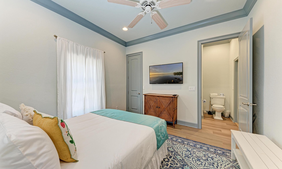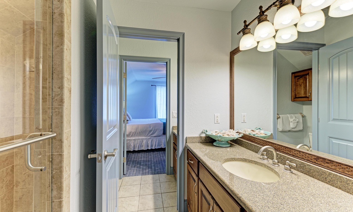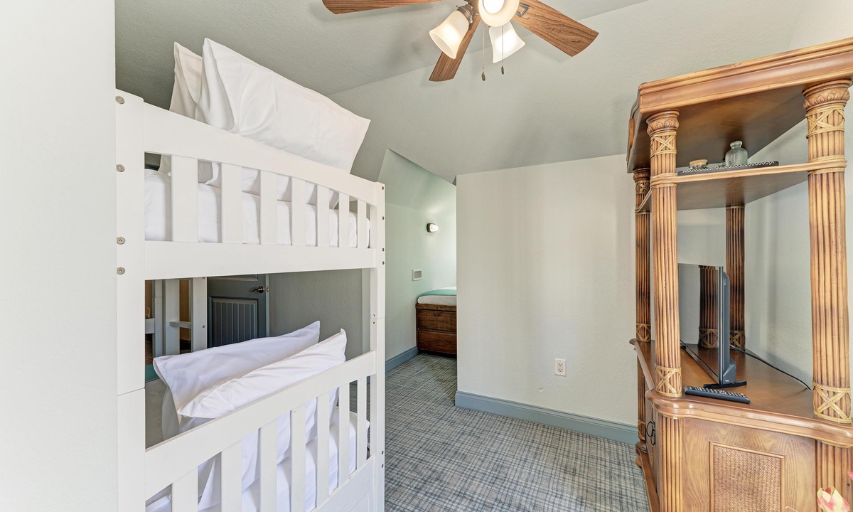 Head upstairs and you will find two bedrooms and one bathroom. The first bedroom contains bunk beds, and a small flatscreen TV. There is access to the upstairs porch through this bedroom – a great spot to wind down and catch a glimpse of the sunset. There is also a full bedroom with a King bed with an attached full bathroom.