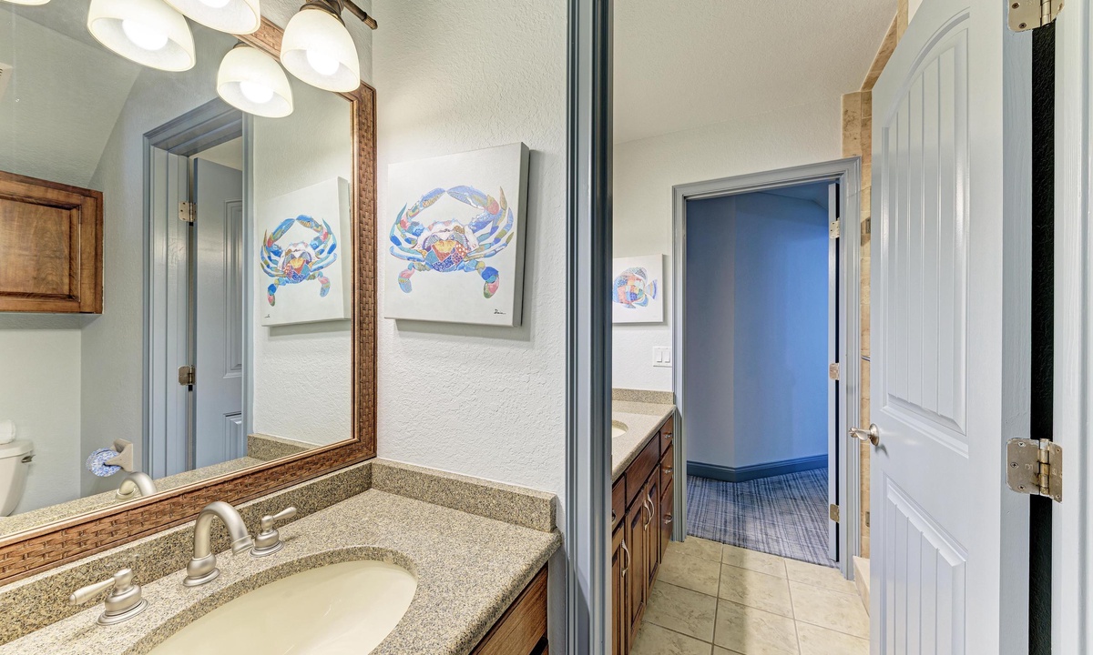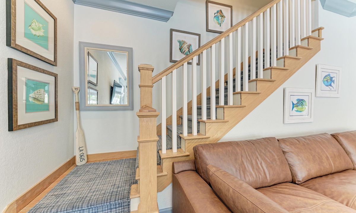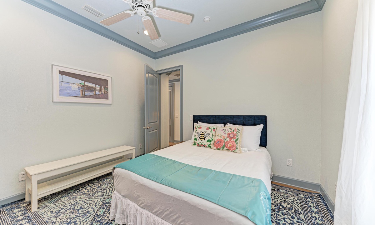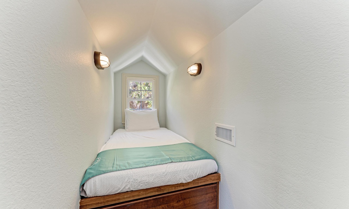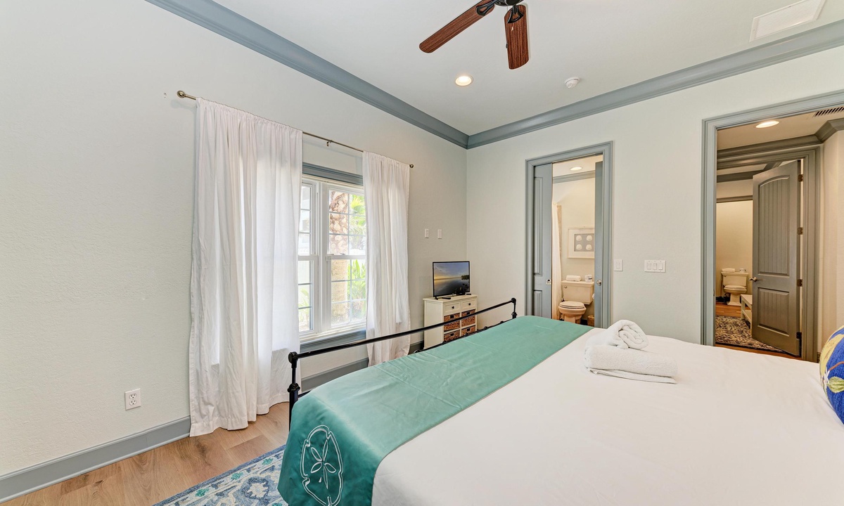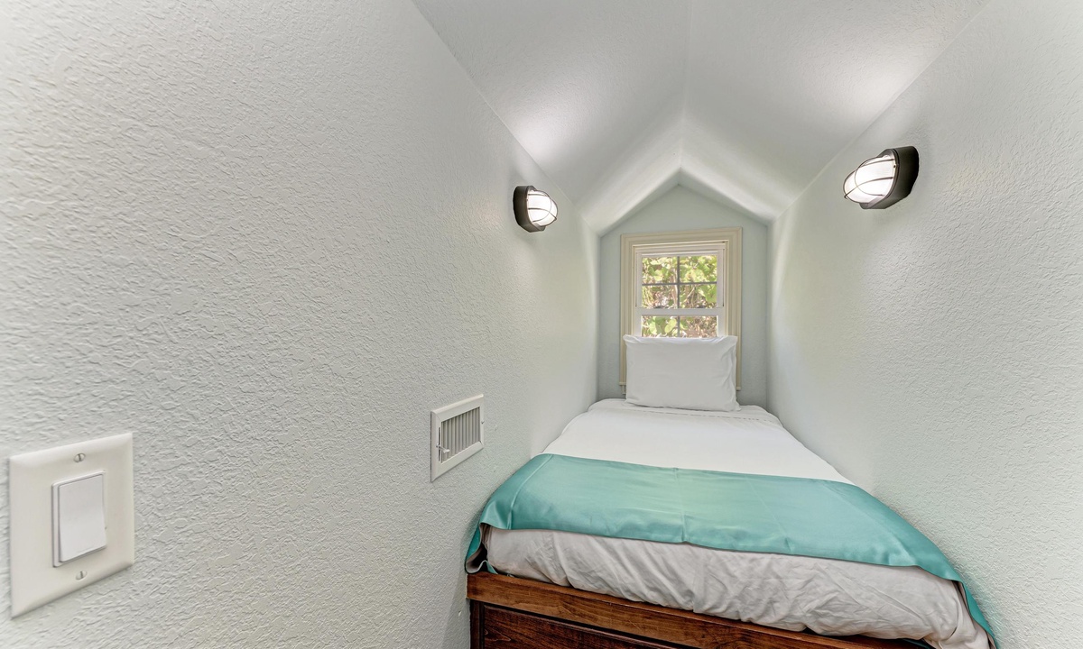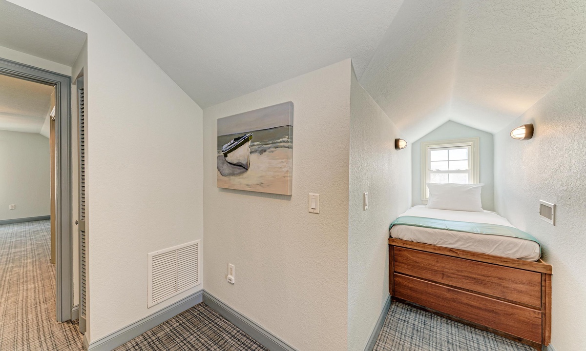 Head upstairs and you will find two bedrooms and one bathroom. The first bedroom contains bunk beds, and a small flatscreen TV. There is access to the upstairs porch through this bedroom – a great spot to wind down and catch a glimpse of the sunset. There is also a full bedroom with a King bed with an attached full bathroom.