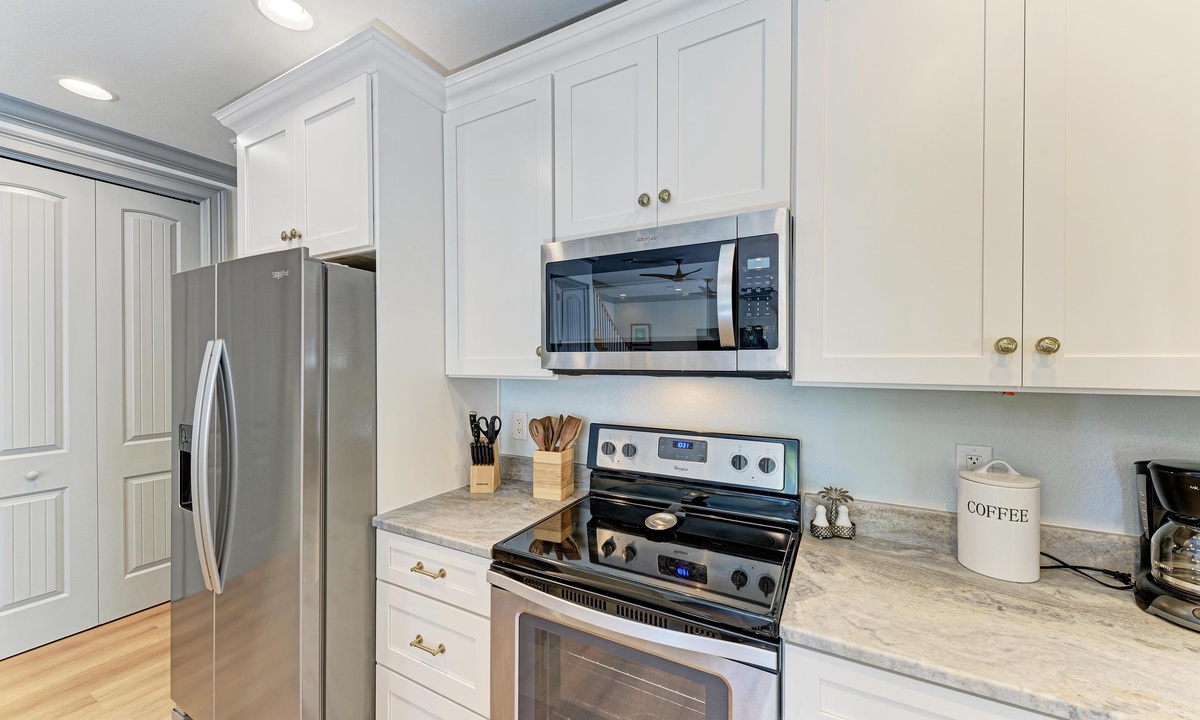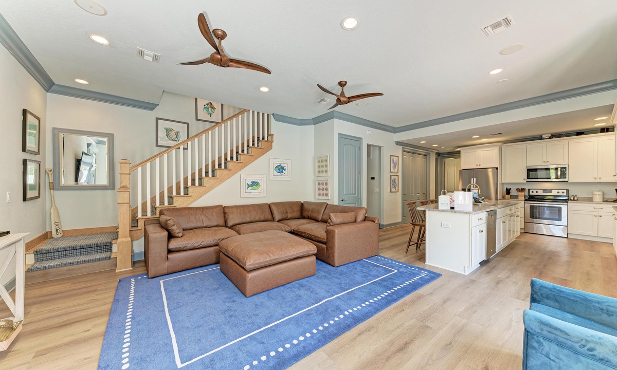 The downstairs area of this home contains the oversized master bedroom and bathroom with a large walk-in closet, as well as two other bedrooms and 2 bathrooms, one with a King bed and the other with a Queen bed. Off the master bedroom there is access to the porch through the French Doors. The washer and dryer are also downstairs off the kitchen, making doing laundry a breeze! The kitchen provides guests all the amenities they need to feel at home including all stainless-steel appliances and granite countertops.