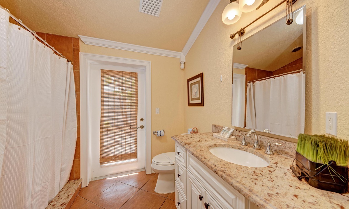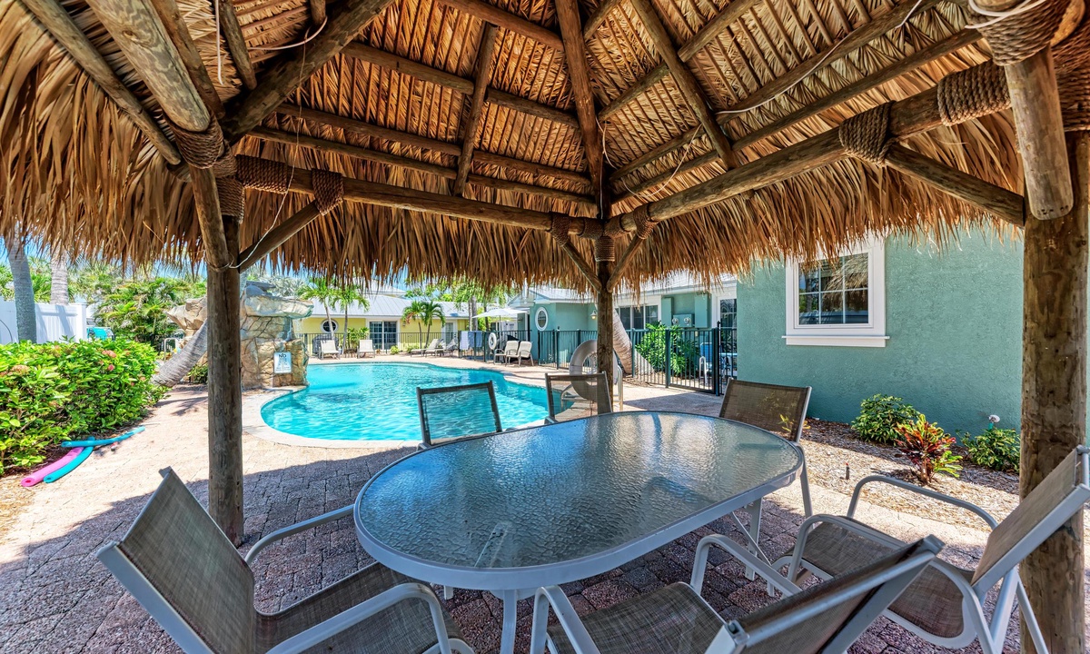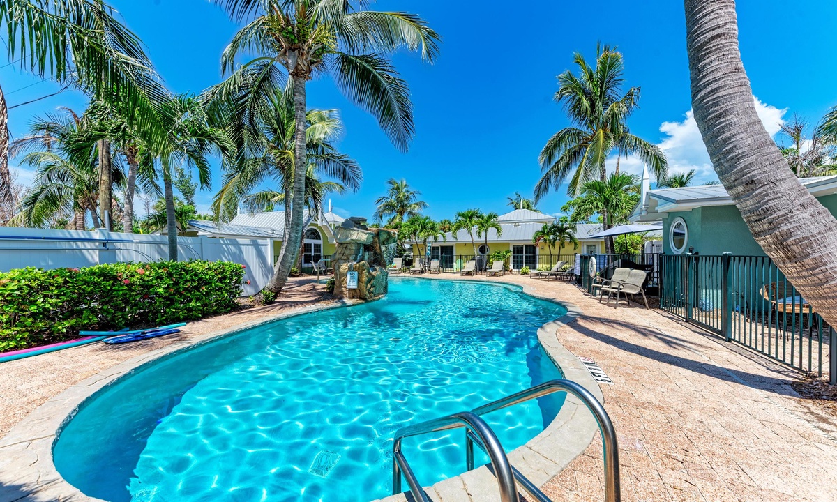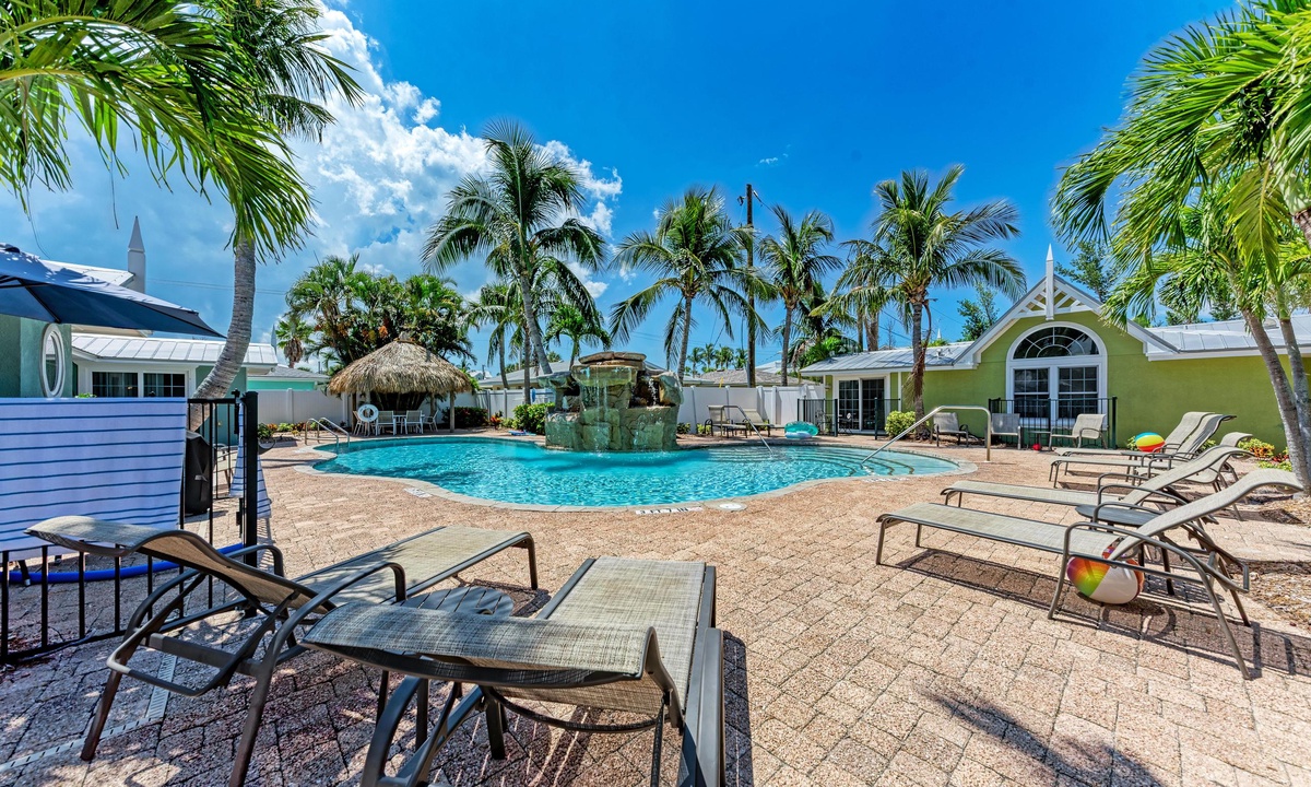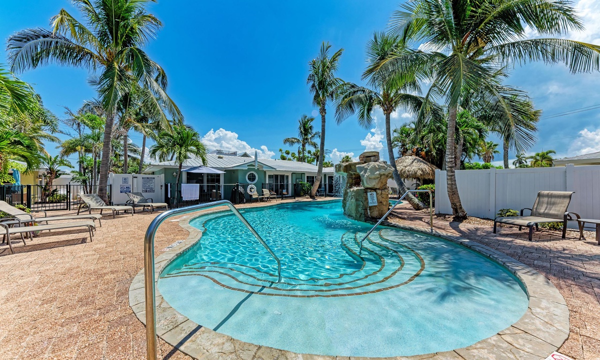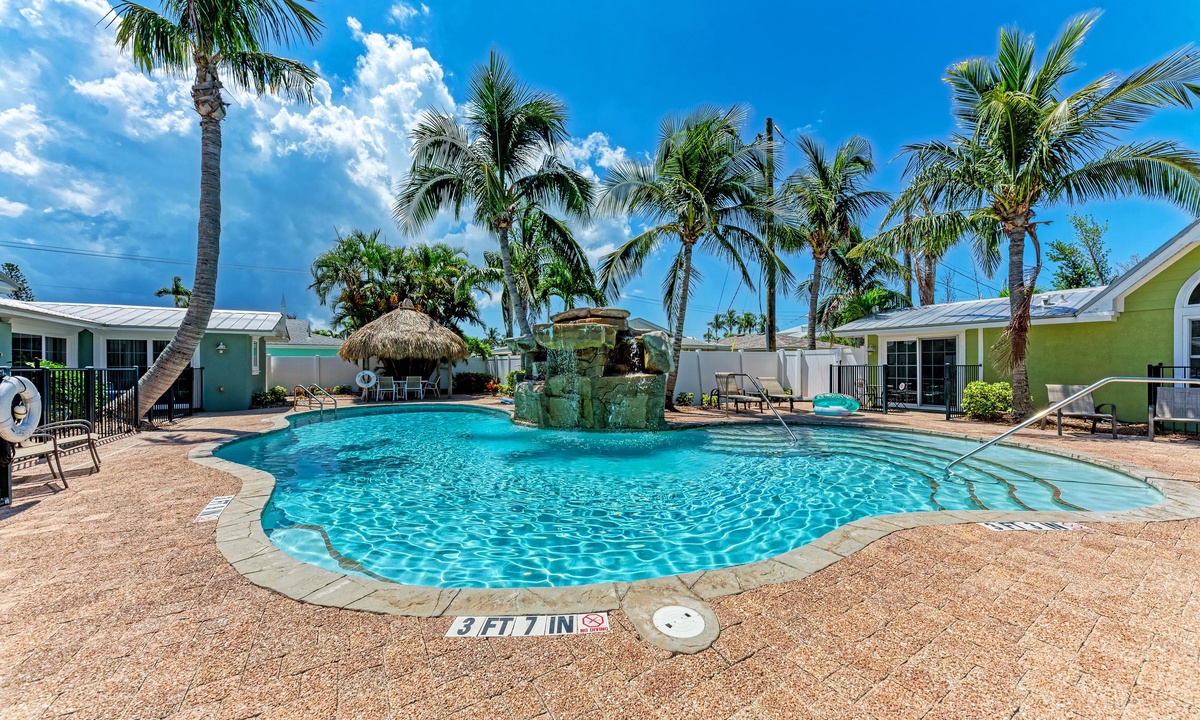 BLUE LAGOON - 2 bedrooms, 2 baths with a huge Tropical pool and 10' waterfall right outside your back door. The pretty upgraded kitchen offers granite counter-tops, stainless appliances and ample counter space for preparing meals or just hanging around enjoying a drink together. There is wireless internet access, shared BBQ and so much more for your vacation enjoyment.