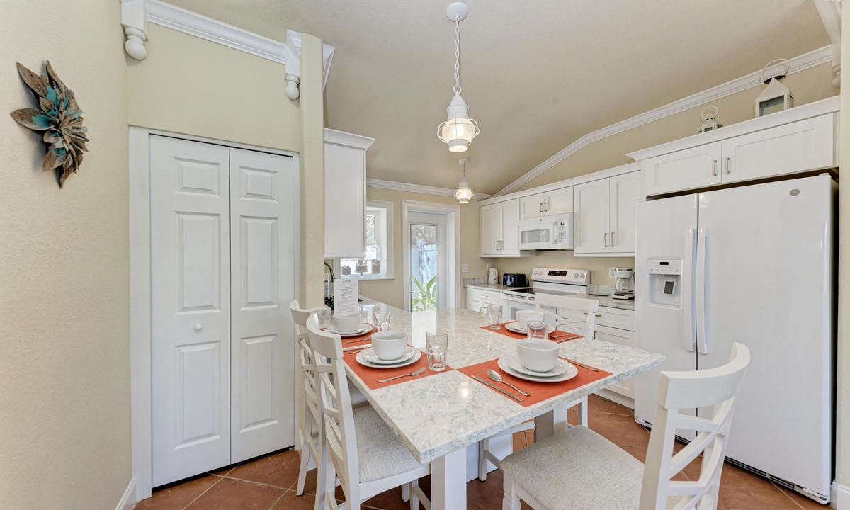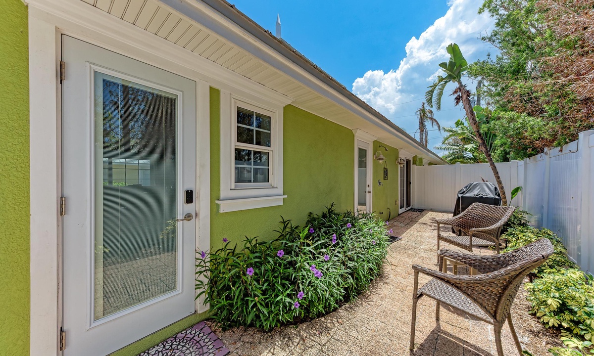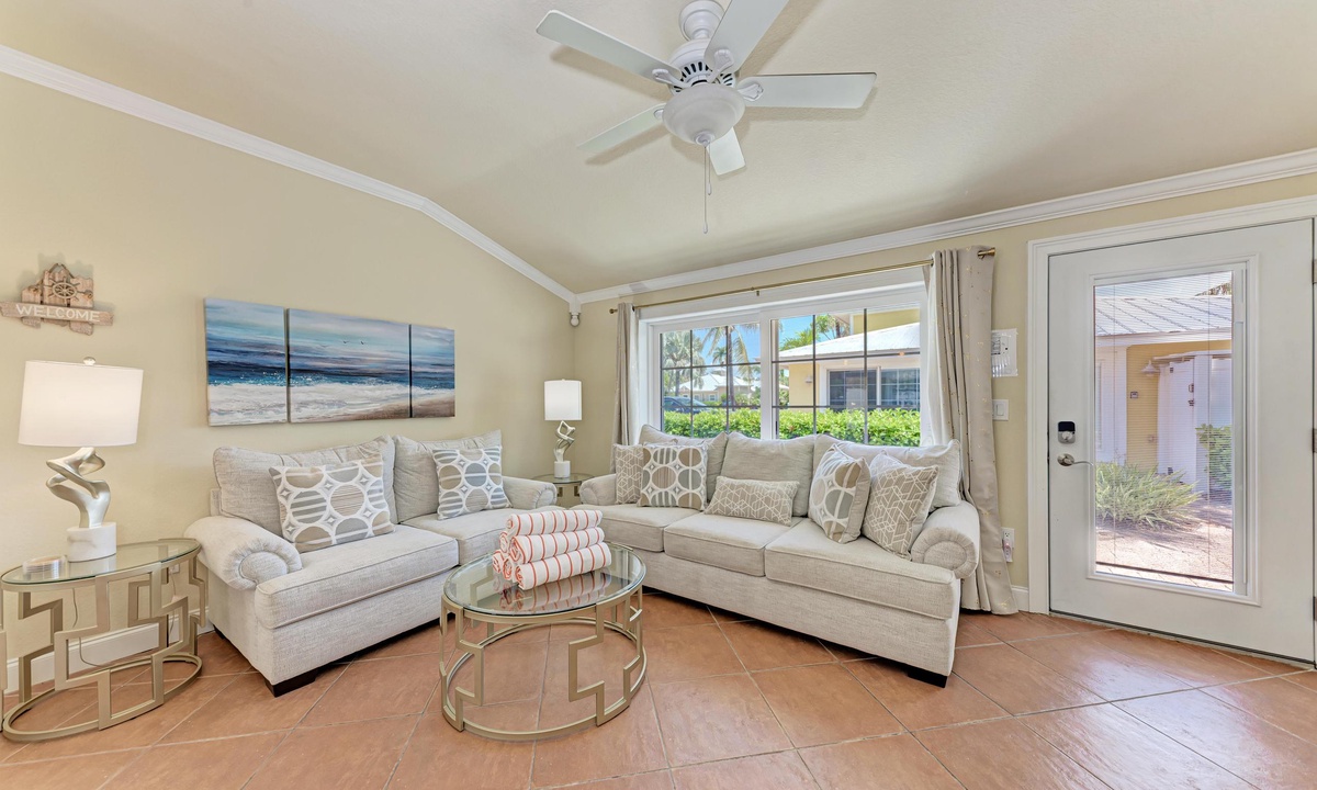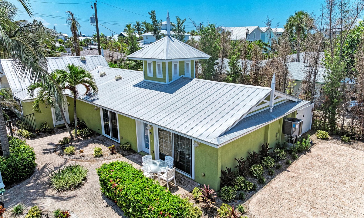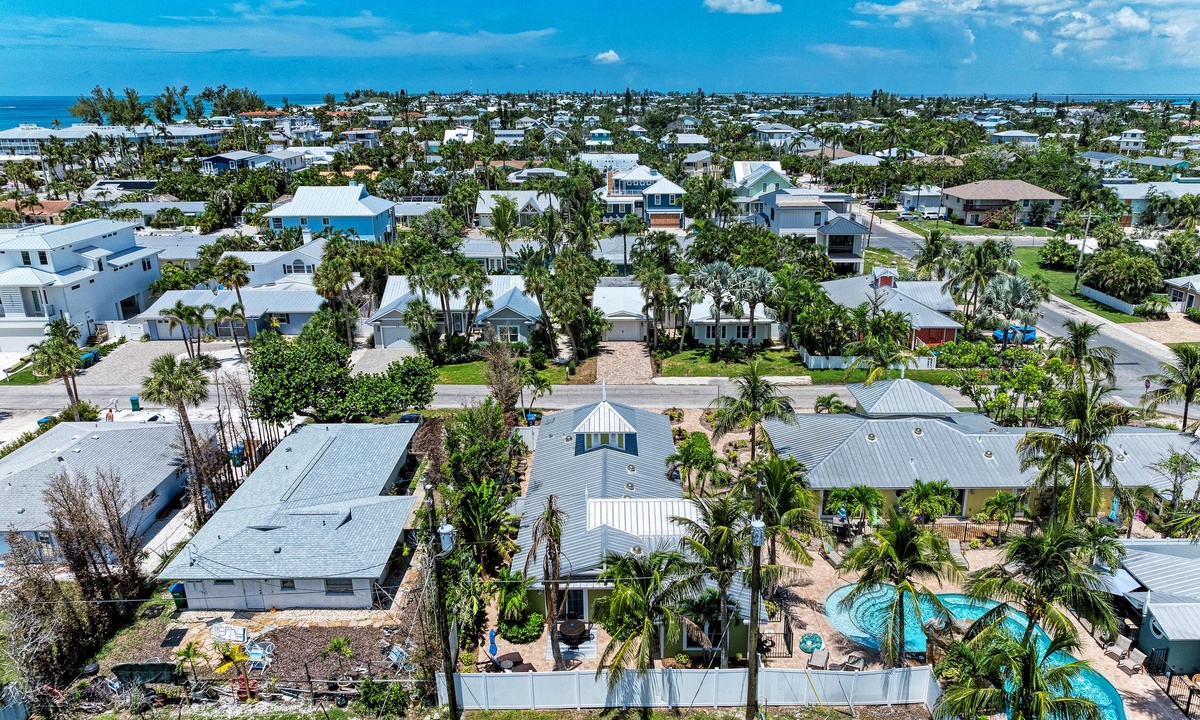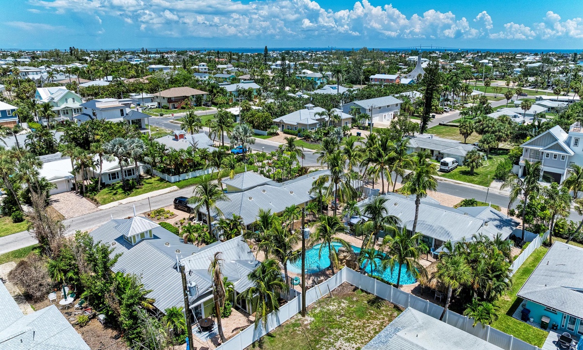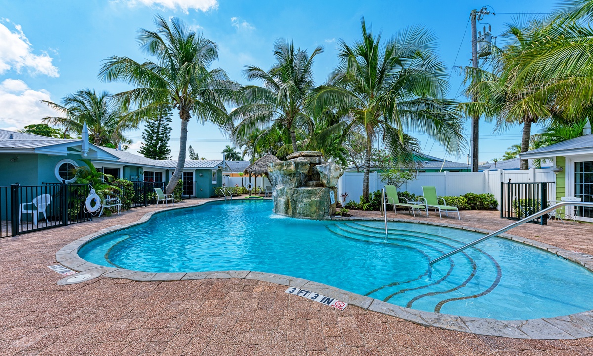BLUE LAGOON - One of Anna Maria Island's favorite vacation rental villas is ready for your next get-a-way! 2 bedrooms, 2 baths with a huge Tropical pool and 10' waterfall right outside your back door. Fully upgraded in 2025, the villa includes all new appliances, new furniture, custom-built ins with abundant storage in both bedrooms and quartz countertops throughout that reflect the colors of the sand and sea. There is ample counter space in the kitchen for preparing meals or just hanging around enjoying a drink together with seating for 4. There is a grill in your private cozy back patio area and seating on the front patio for 4 to dine alfresco.