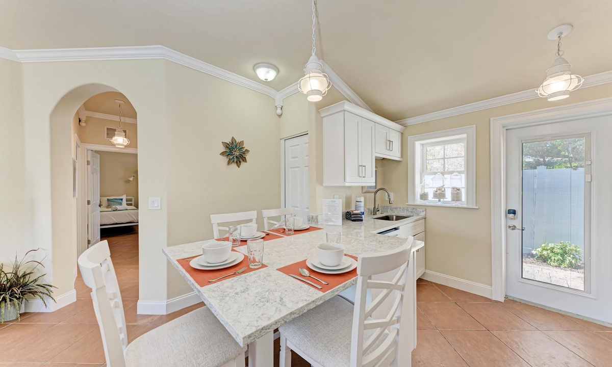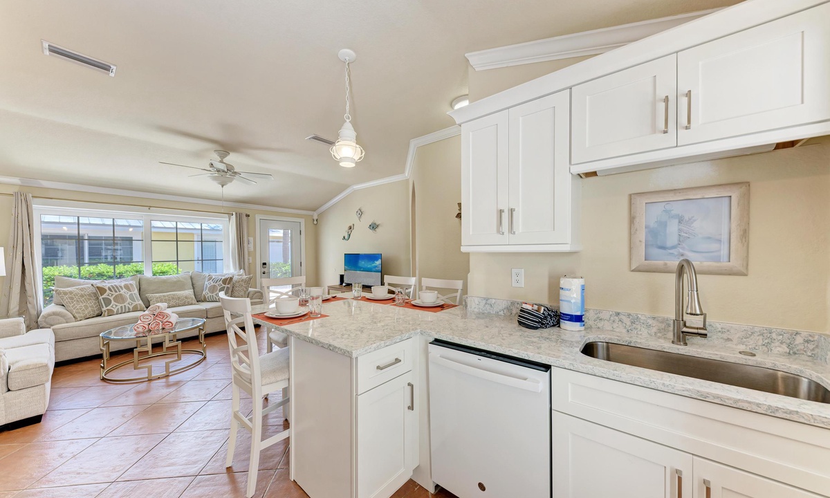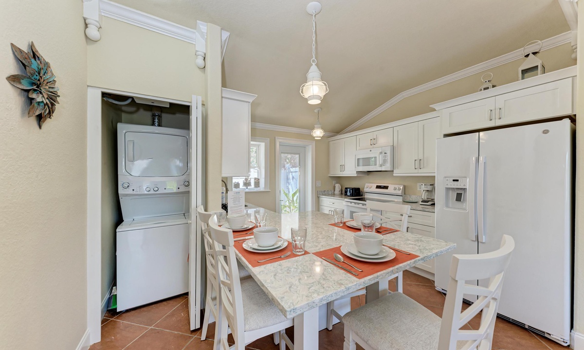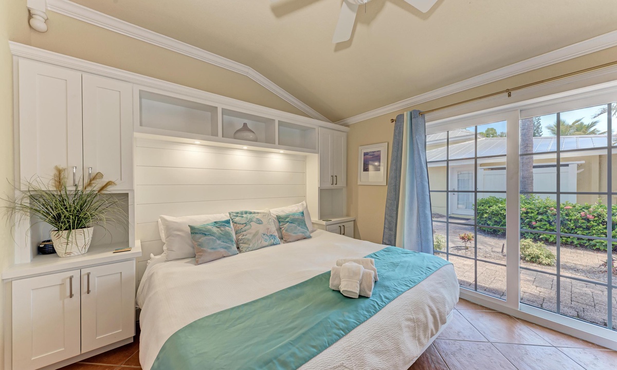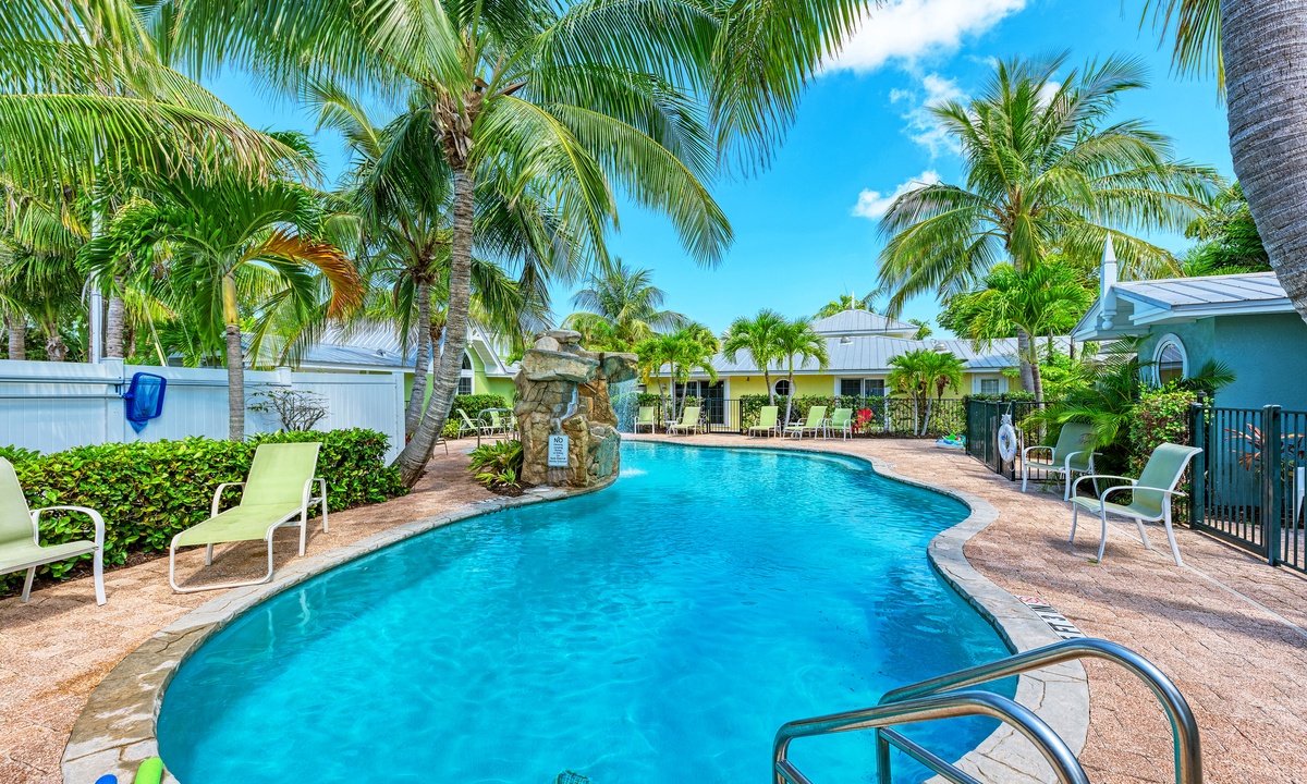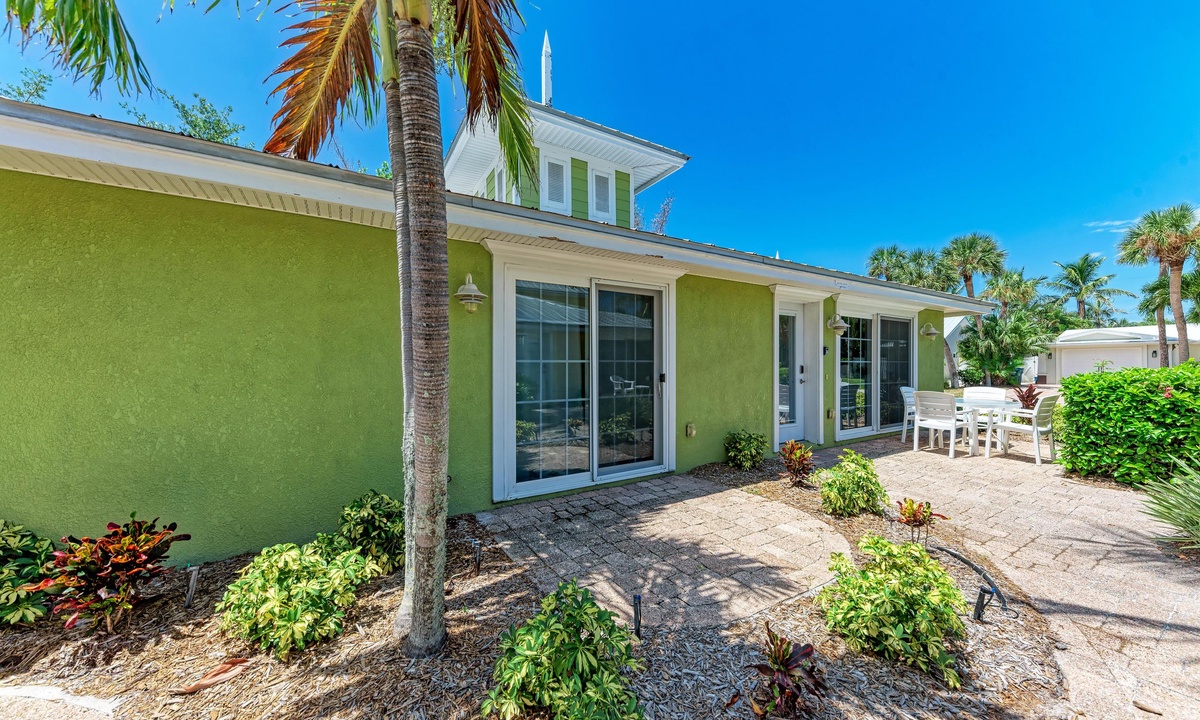 BLUE LAGOON - One of Anna Maria Island's favorite vacation rental villas is ready for your next get-a-way! 2 bedrooms, 2 baths with a huge Tropical pool and 10' waterfall right outside your back door. Fully upgraded in 2025, the villa includes all new appliances, new furniture, custom-built ins with abundant storage in both bedrooms and quartz countertops throughout that reflect the colors of the sand and sea. There is ample counter space in the kitchen for preparing meals or just hanging around enjoying a drink together with seating for 4. There is a grill in your private cozy back patio area and seating on the front patio for 4 to dine alfresco.
