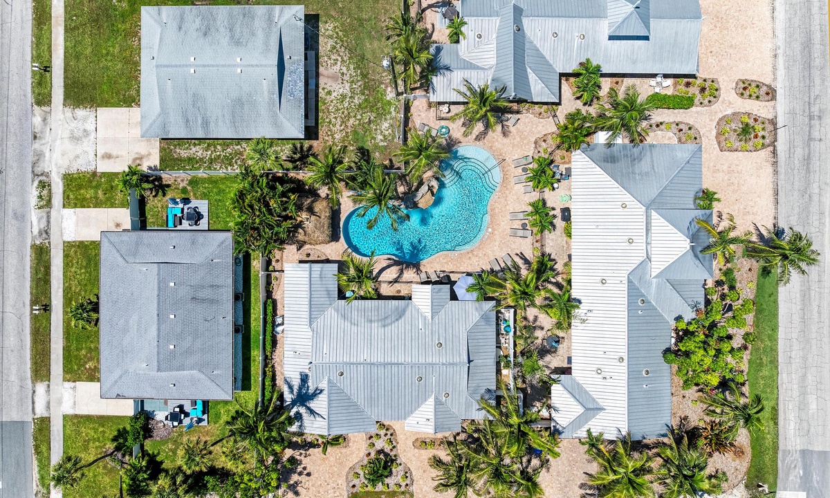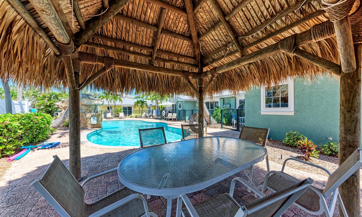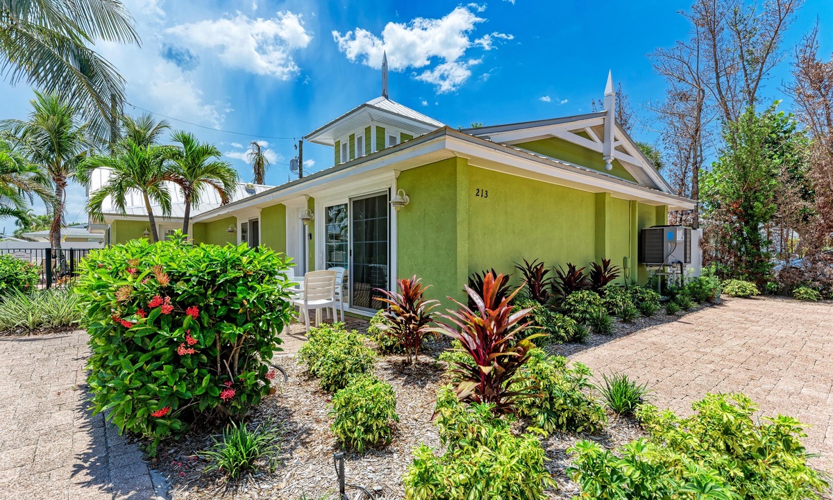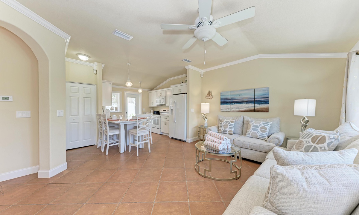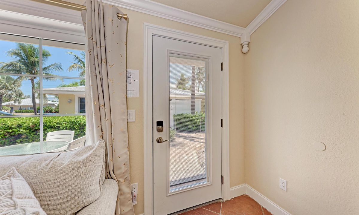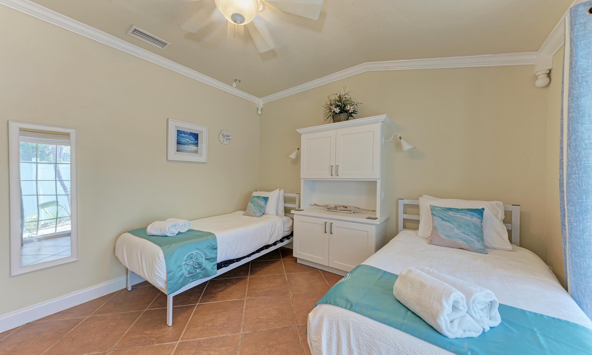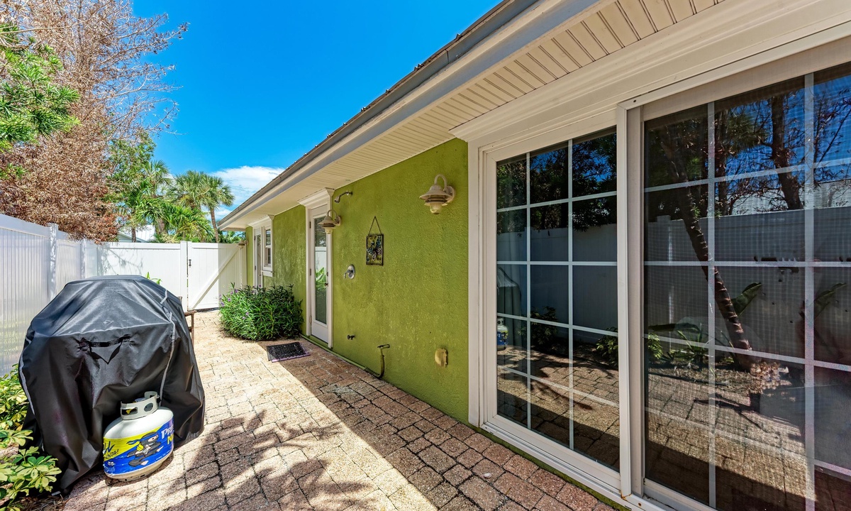 BLUE LAGOON - One of Anna Maria Island's favorite vacation rental villas is ready for your next get-a-way! 2 bedrooms, 2 baths with a huge Tropical pool and 10' waterfall right outside your back door. Fully upgraded in 2025, the villa includes all new appliances, new furniture, custom-built ins with abundant storage in both bedrooms and quartz countertops throughout that reflect the colors of the sand and sea. There is ample counter space in the kitchen for preparing meals or just hanging around enjoying a drink together with seating for 4. There is a grill in your private cozy back patio area and seating on the front patio for 4 to dine alfresco.