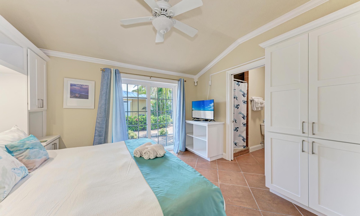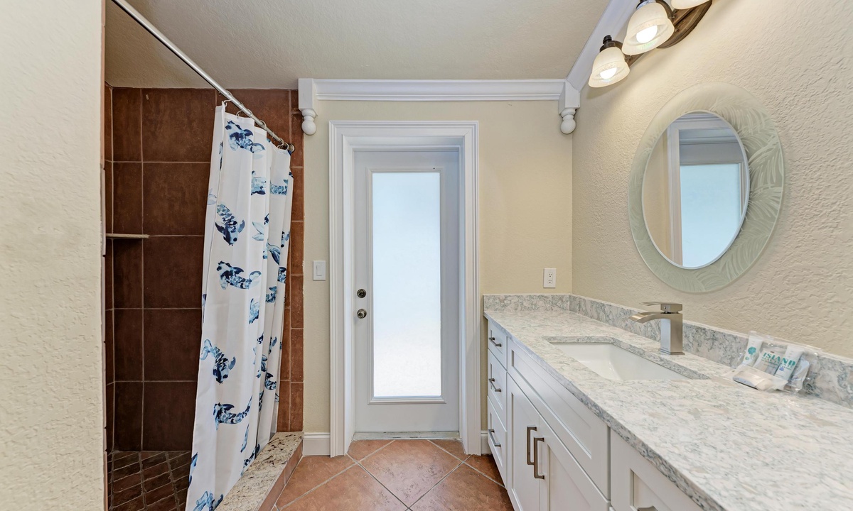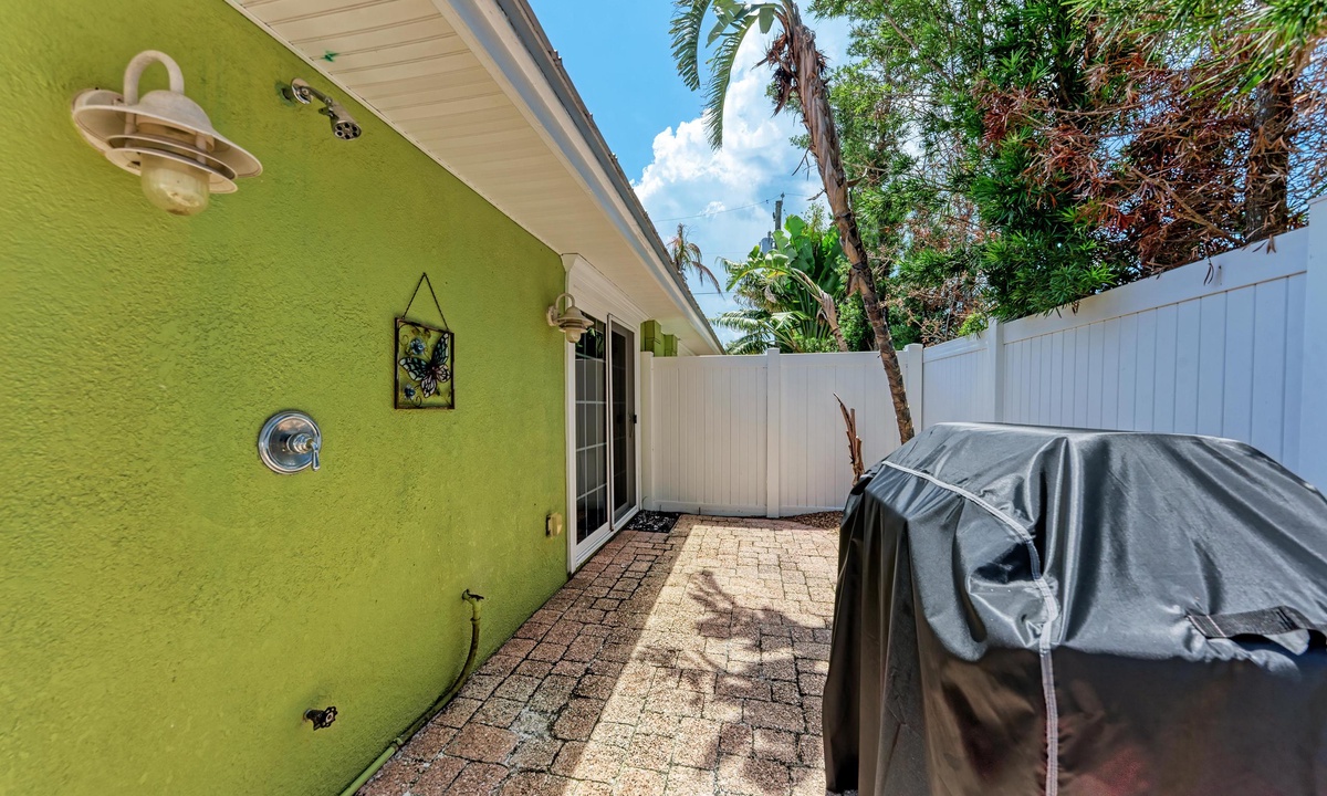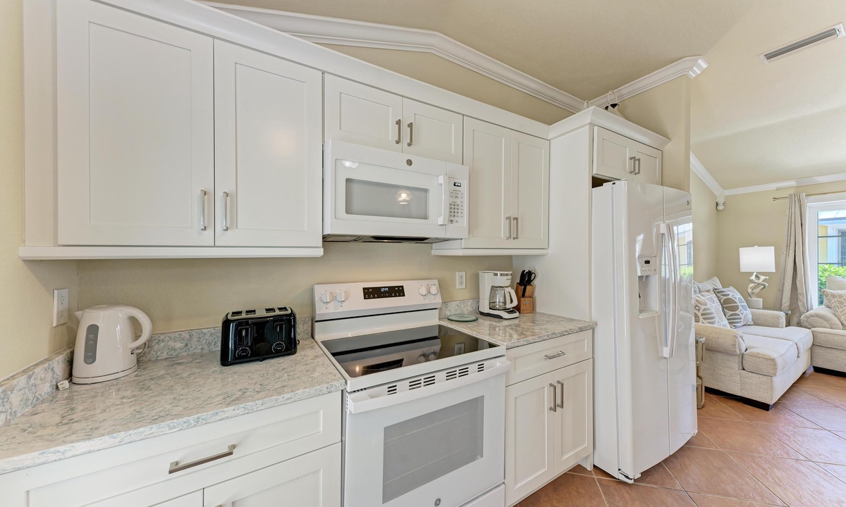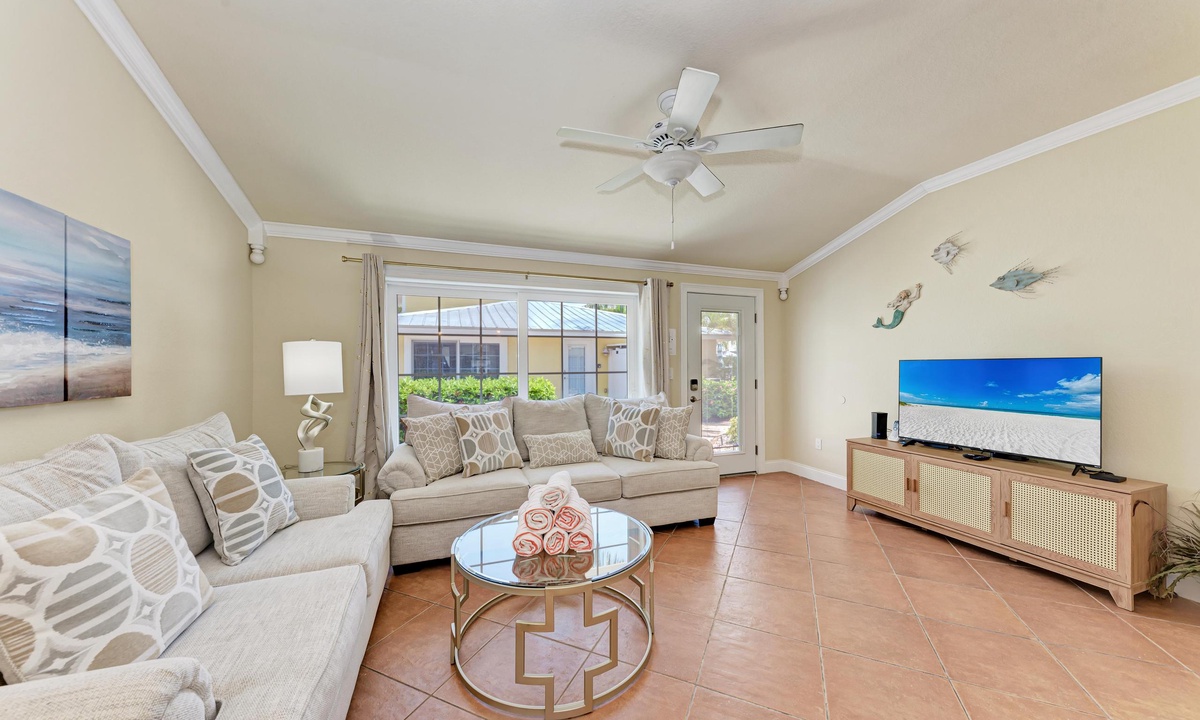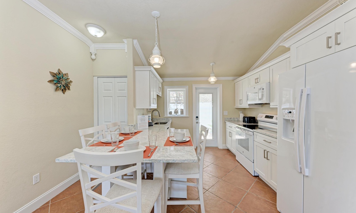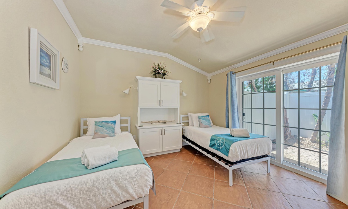BLUE LAGOON - One of Anna Maria Island's favorite vacation rental villas is ready for your next get-a-way! 2 bedrooms, 2 baths with a huge Tropical pool and 10' waterfall right outside your back door. Fully upgraded in 2025, the villa includes all new appliances, new furniture, custom-built ins with abundant storage in both bedrooms and quartz countertops throughout that reflect the colors of the sand and sea. There is ample counter space in the kitchen for preparing meals or just hanging around enjoying a drink together with seating for 4. There is a grill in your private cozy back patio area and seating on the front patio for 4 to dine alfresco.