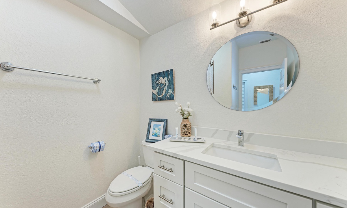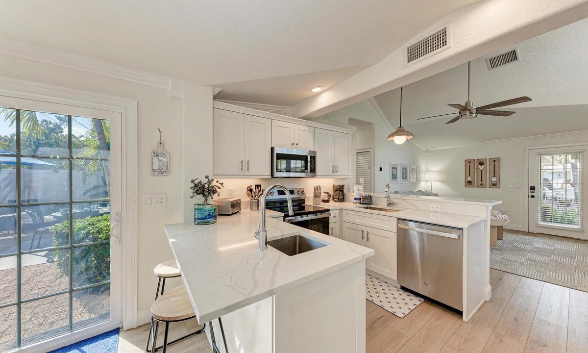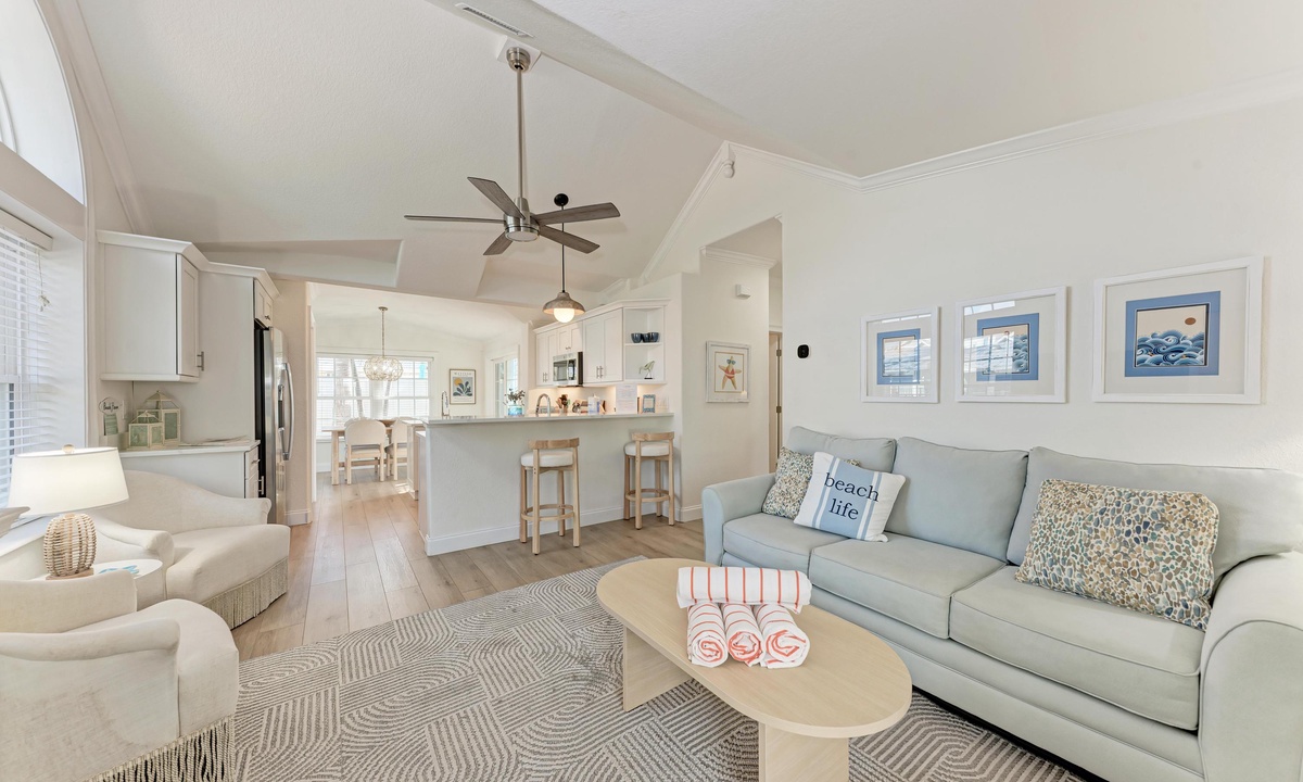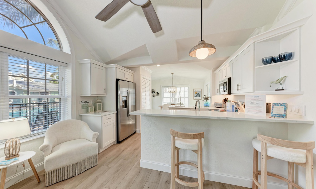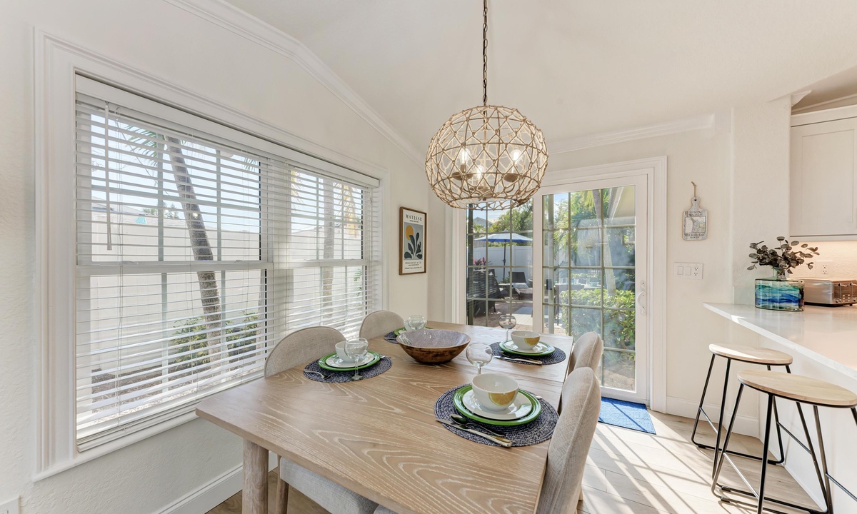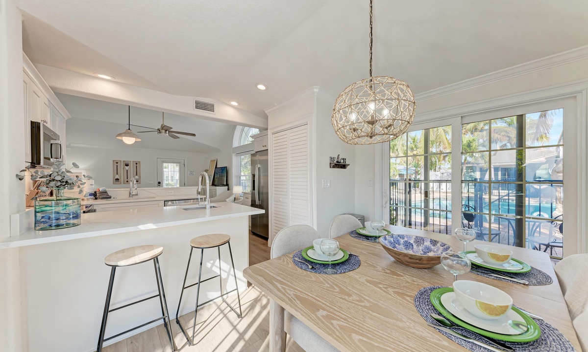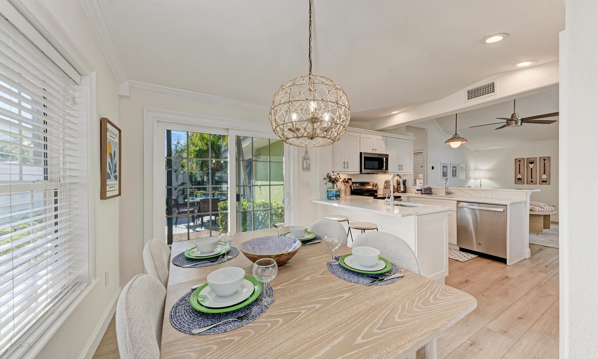 The pretty upgraded kitchen offer granite countertops, white appliances and ample counter space for prepare meals or just hanging around enjoying a drink together. The dining room has ample seating for the entire group.