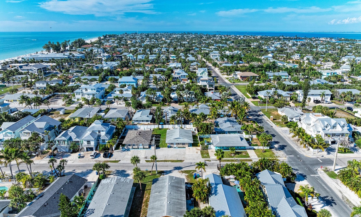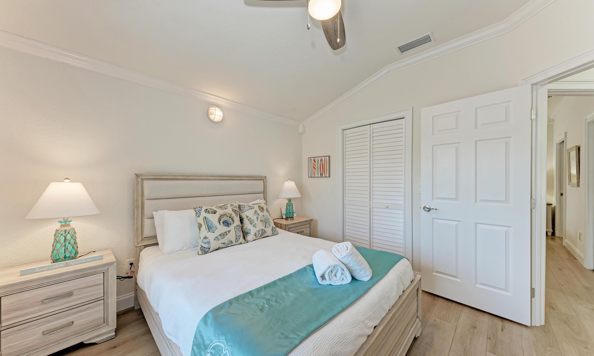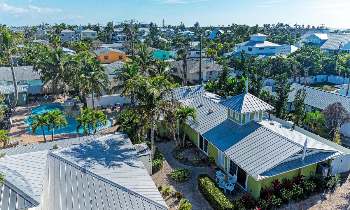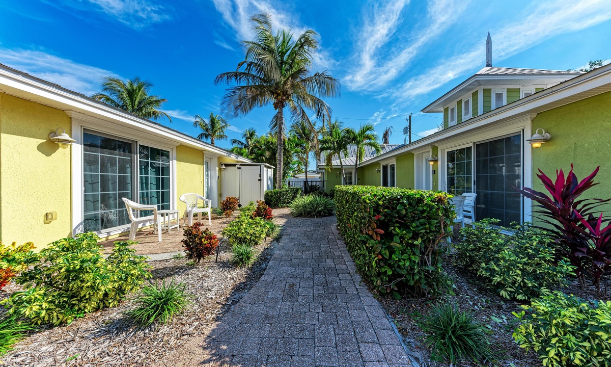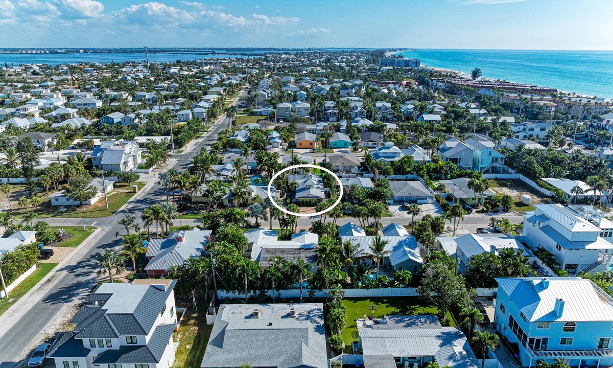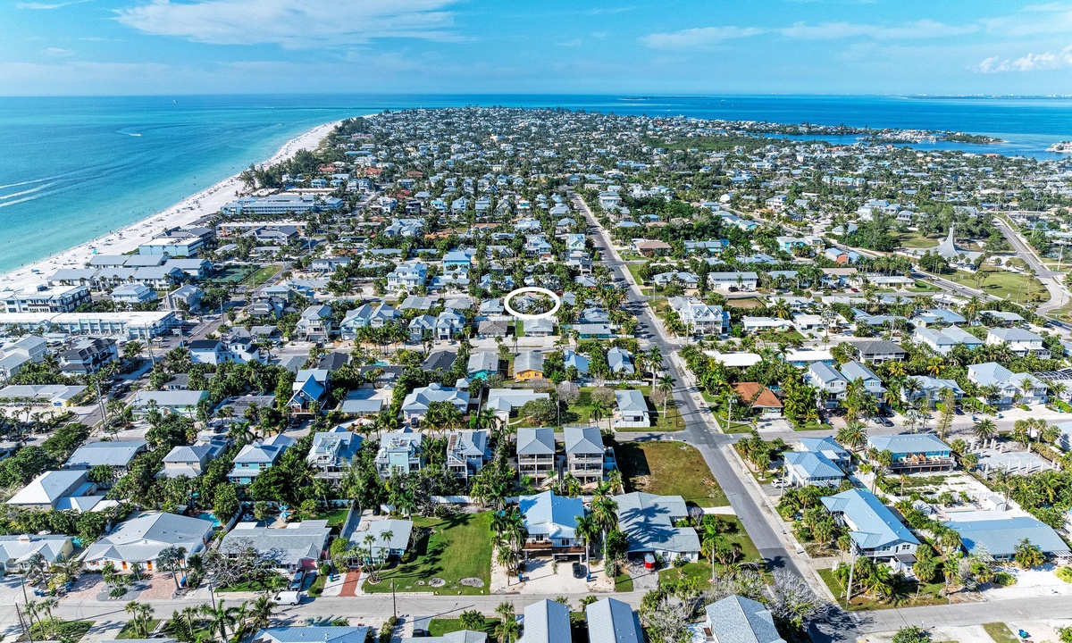 Just a short stroll block to the white sandy beach in Holmes Beach on Anna Maria Island. The free trolley is also just a quick walk away.
