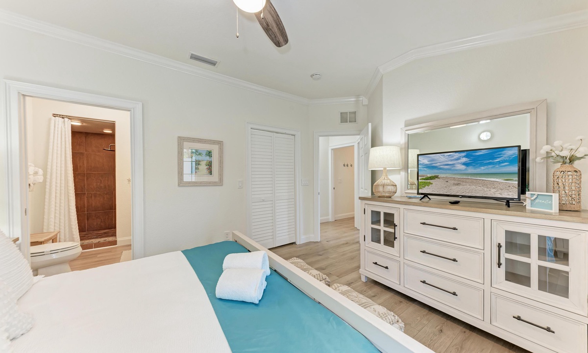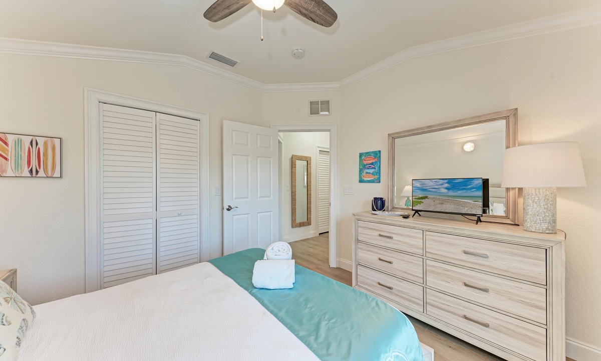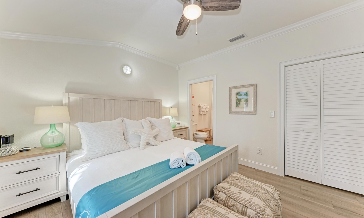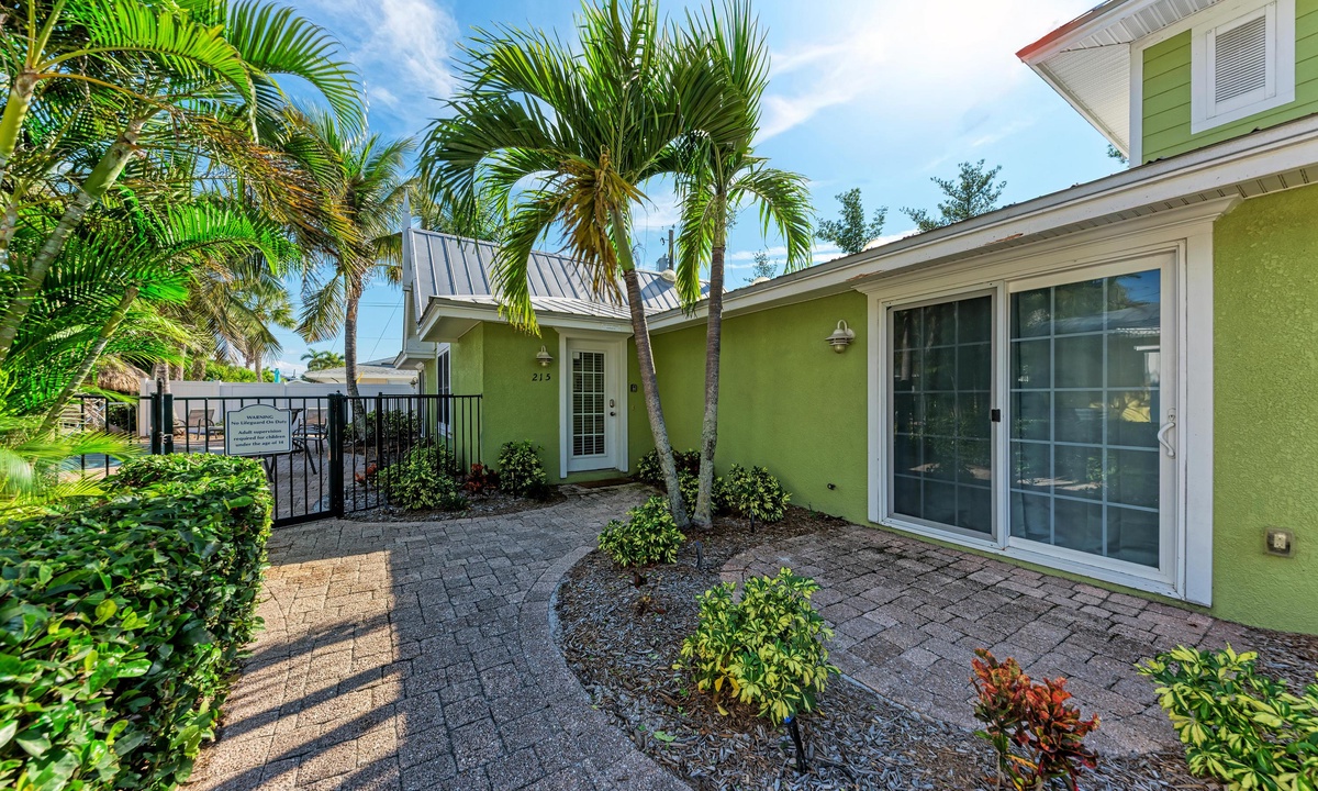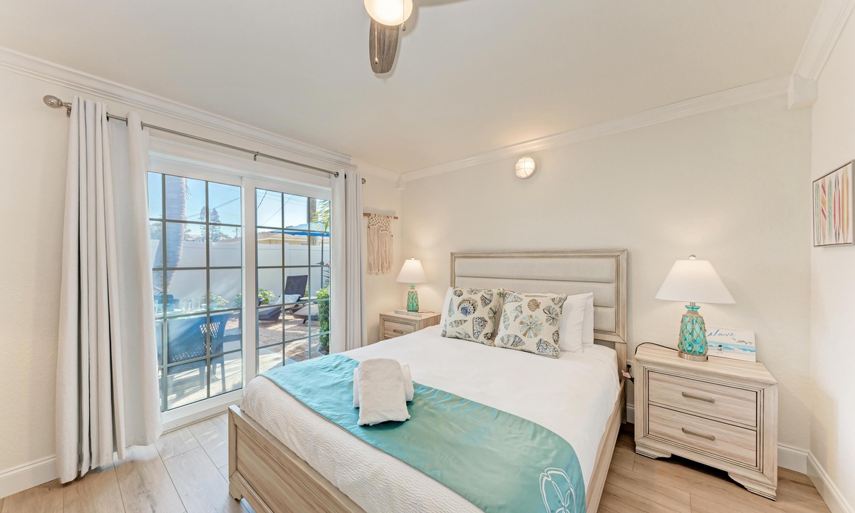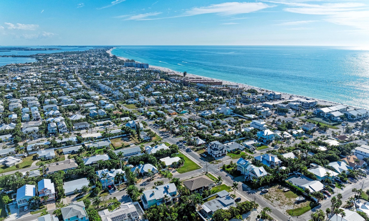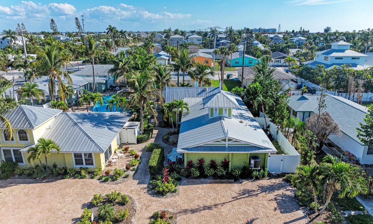 Just a short stroll block to the white sandy beach in Holmes Beach on Anna Maria Island. The free trolley is also just a quick walk away.