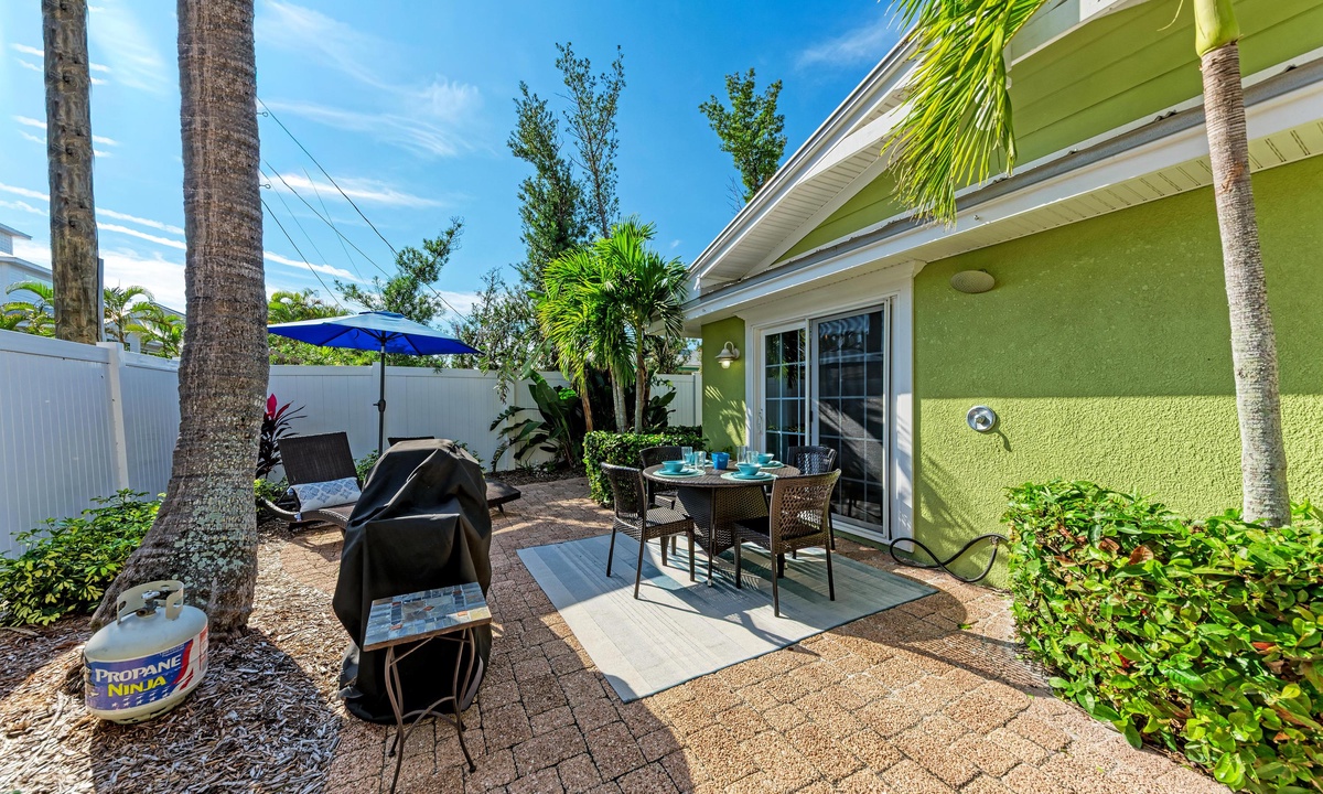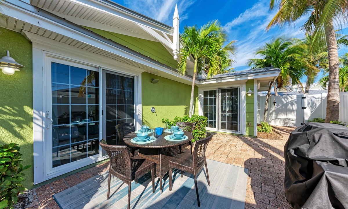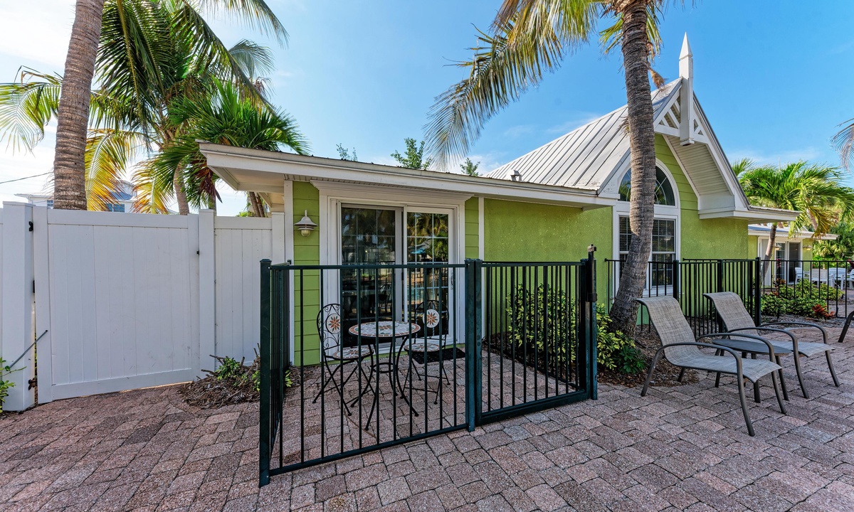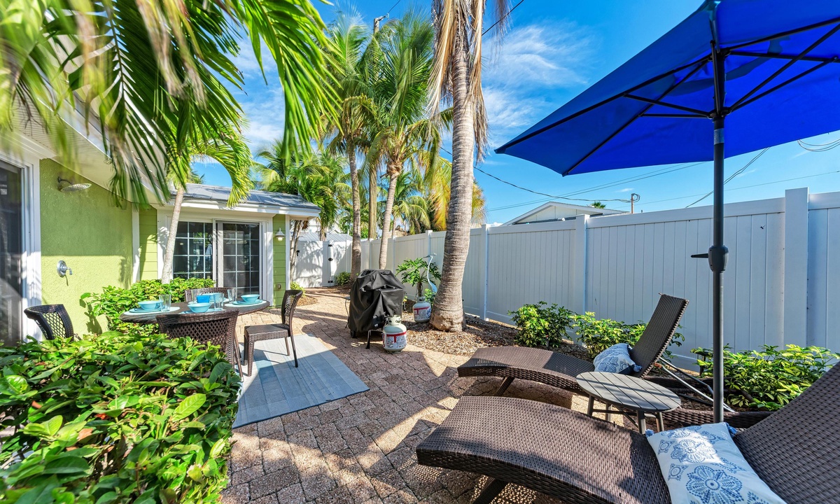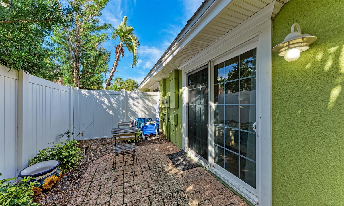 Enjoy your private patio with lounge chairs after a long day at the beach or pool.