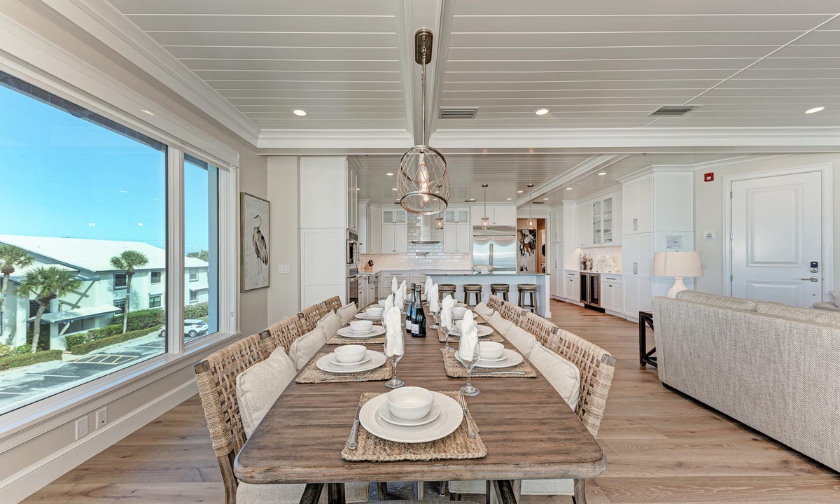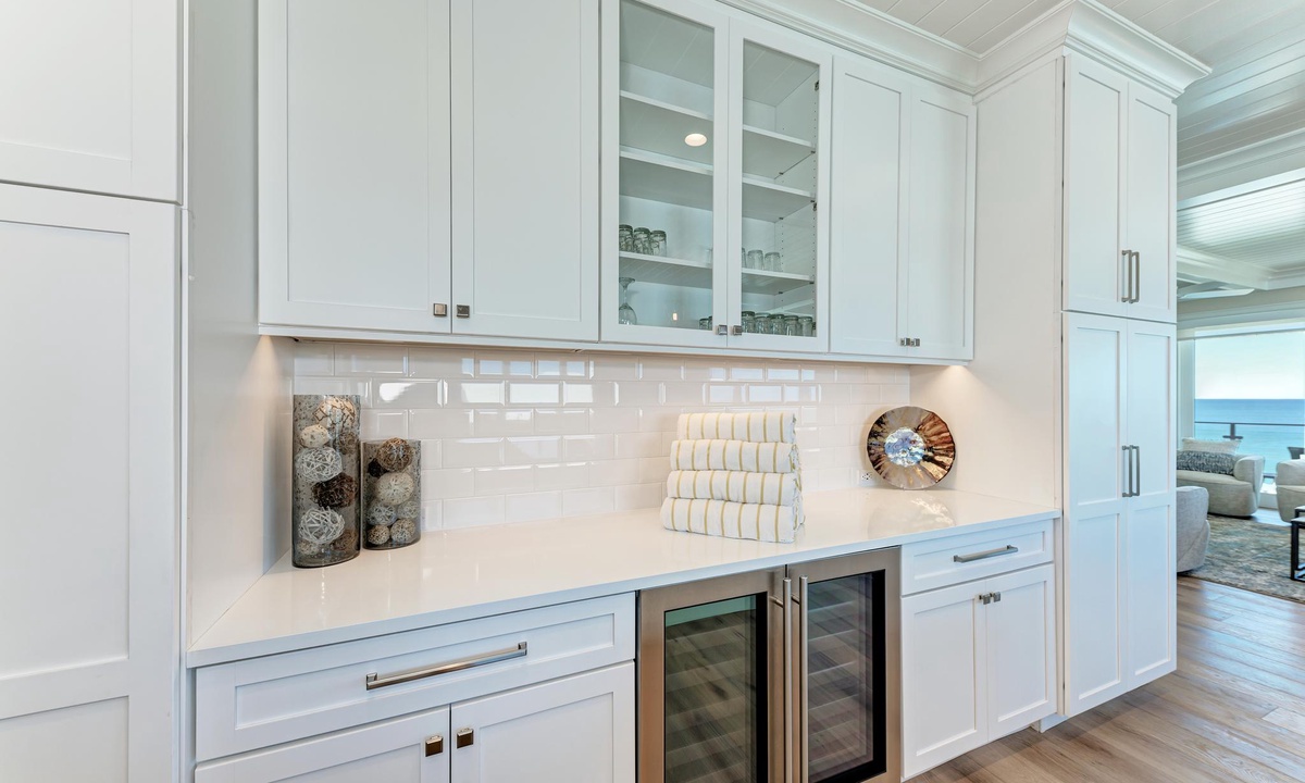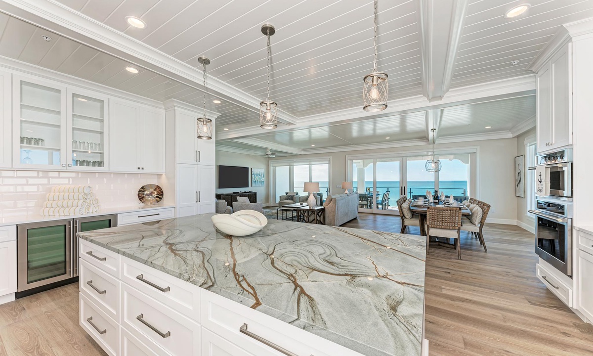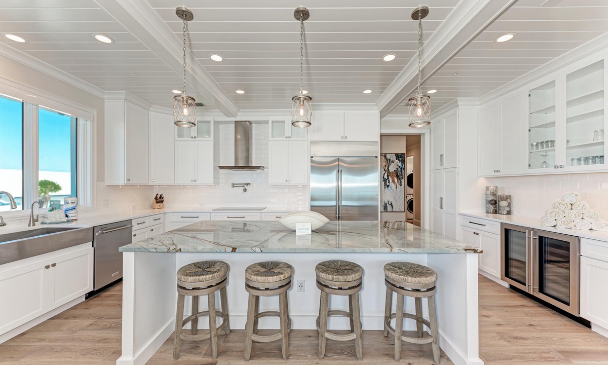 The kitchen and dining areas are very accommodating. In the kitchen find all the basics including a dishwasher, stainless appliances, induction stovetop, coffee maker, and gorgeous custom counters and cabinetry as well as a double door wine fridge as well. The dining room offers a more formal dining area with ten seats, or find seating for four at the breakfast counter.