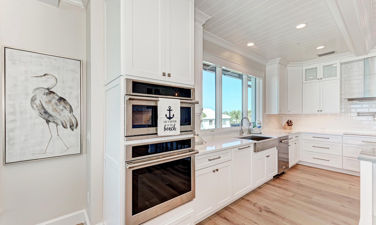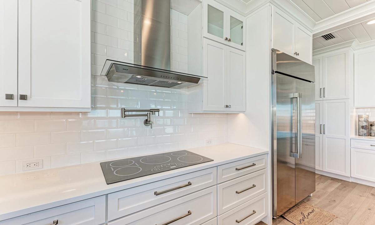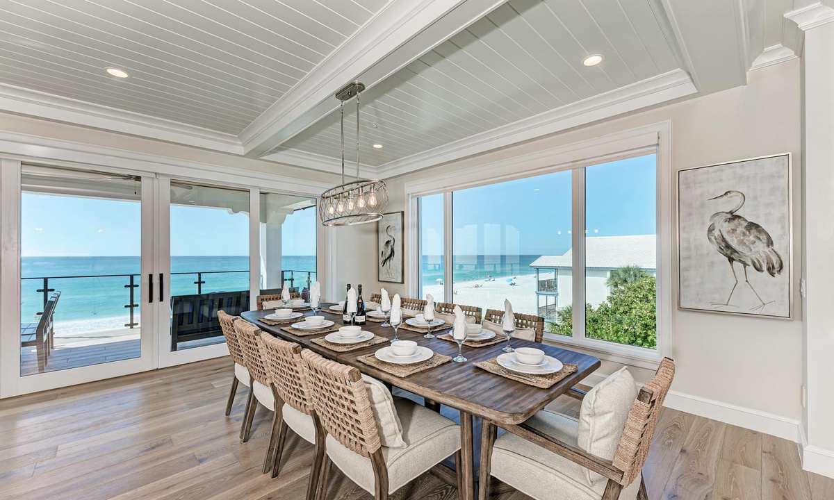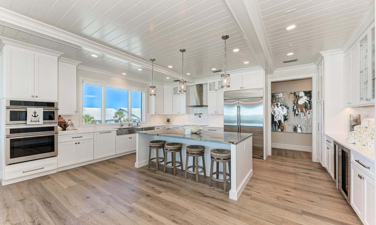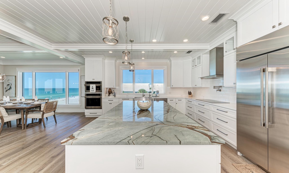 The kitchen and dining areas are very accommodating. In the kitchen find all the basics including a dishwasher, stainless appliances, induction stovetop, coffee maker, and gorgeous custom counters and cabinetry as well as a double door wine fridge as well. The dining room offers a more formal dining area with ten seats, or find seating for four at the breakfast counter.