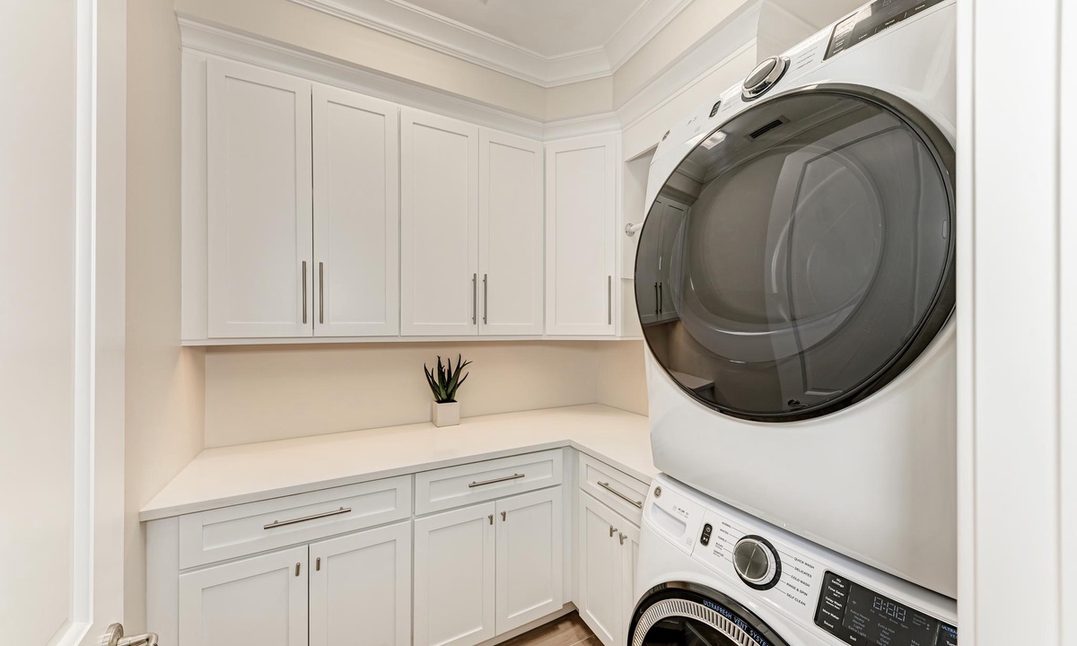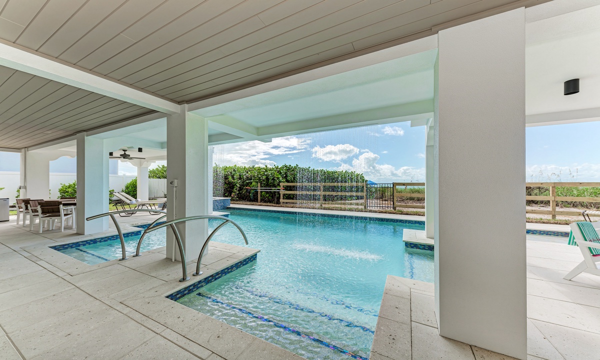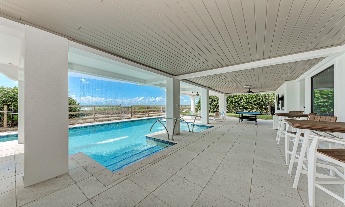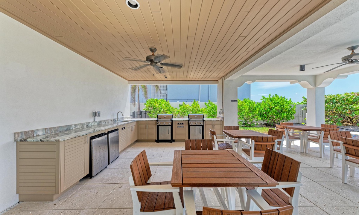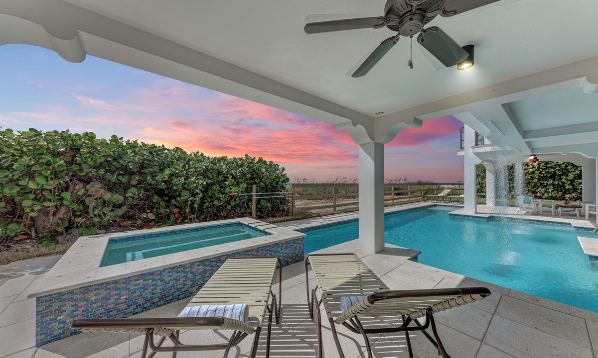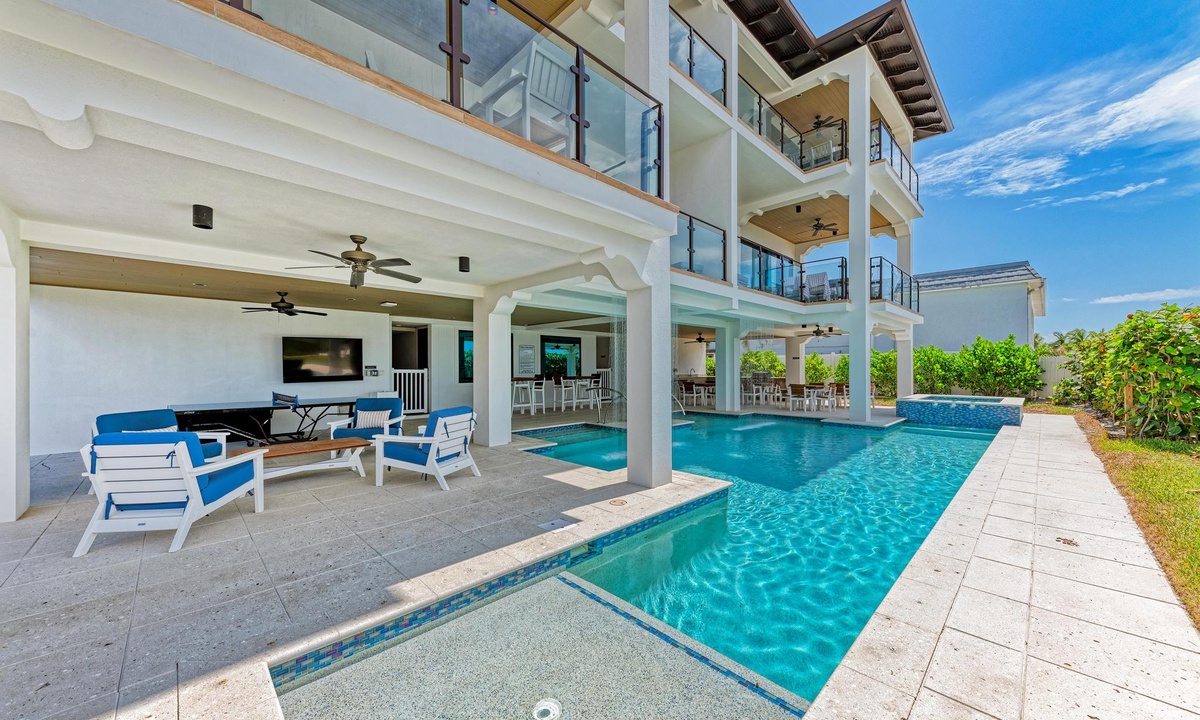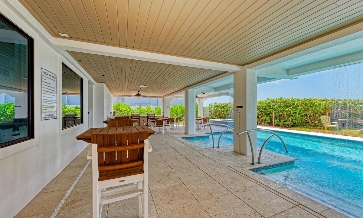 The kitchen is equipped with stainless steel appliances including a dishwasher, induction stovetop, double door wine fridge, and the dining room table seats up to ten. There is also a breakfast bar seating four perfect for a quick lunch or snack. Dine al fresco on the open covers balcony that is fully furnished and waiting for you. The open balcony looks directly over the electric heated community pool with water feature and spa heated with gas, and has plenty of seating for getting into relaxation mode. Large windows let in great natural light during the day making for a real Florida feel.