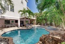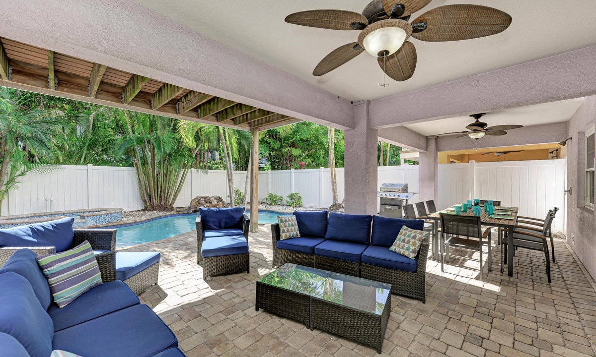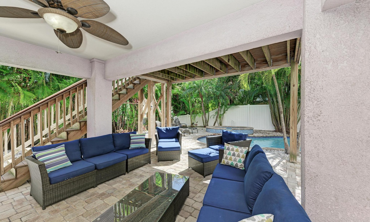 Off the dining room exit through the French doors to the sun deck and take the stairs into your private backyard oasis. In the backyard, everyone can relax in paradise! Enjoy the heated pool and spa with a beautiful and unique waterfall feature. Enjoy conversation in the covered outdoor lounge area or cook up a feast on the propane grill while dining al fresco!
