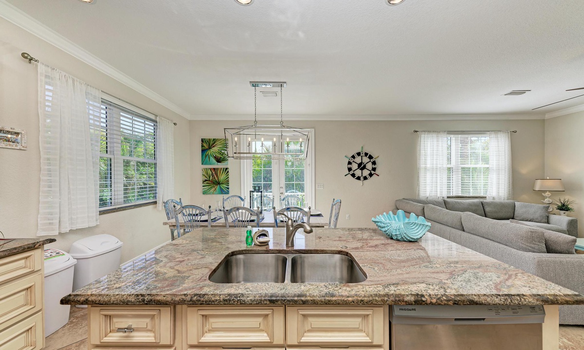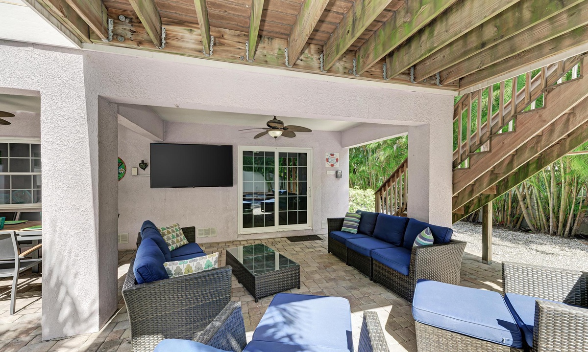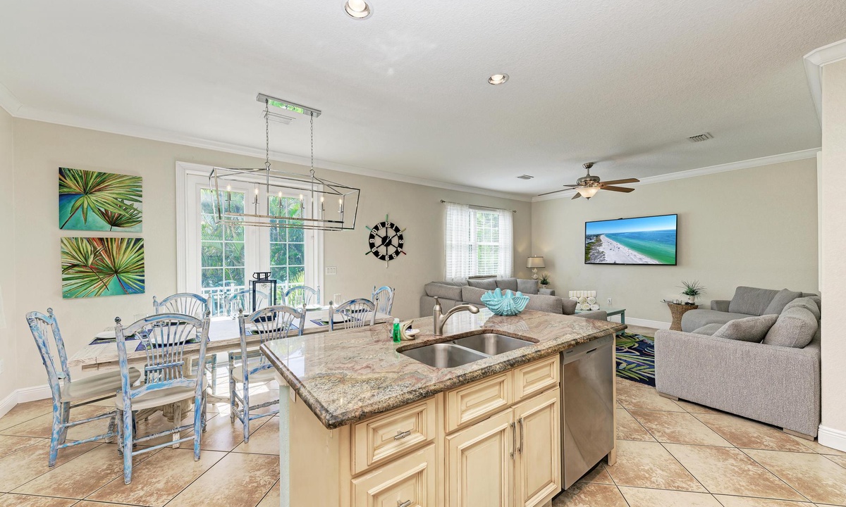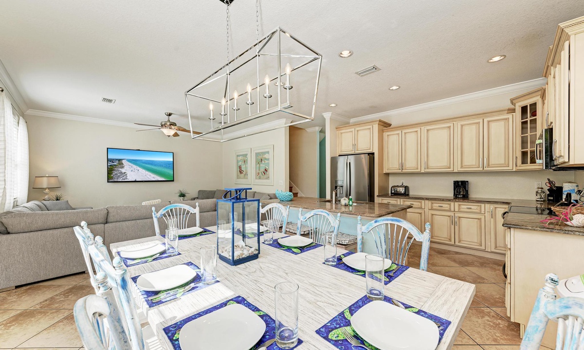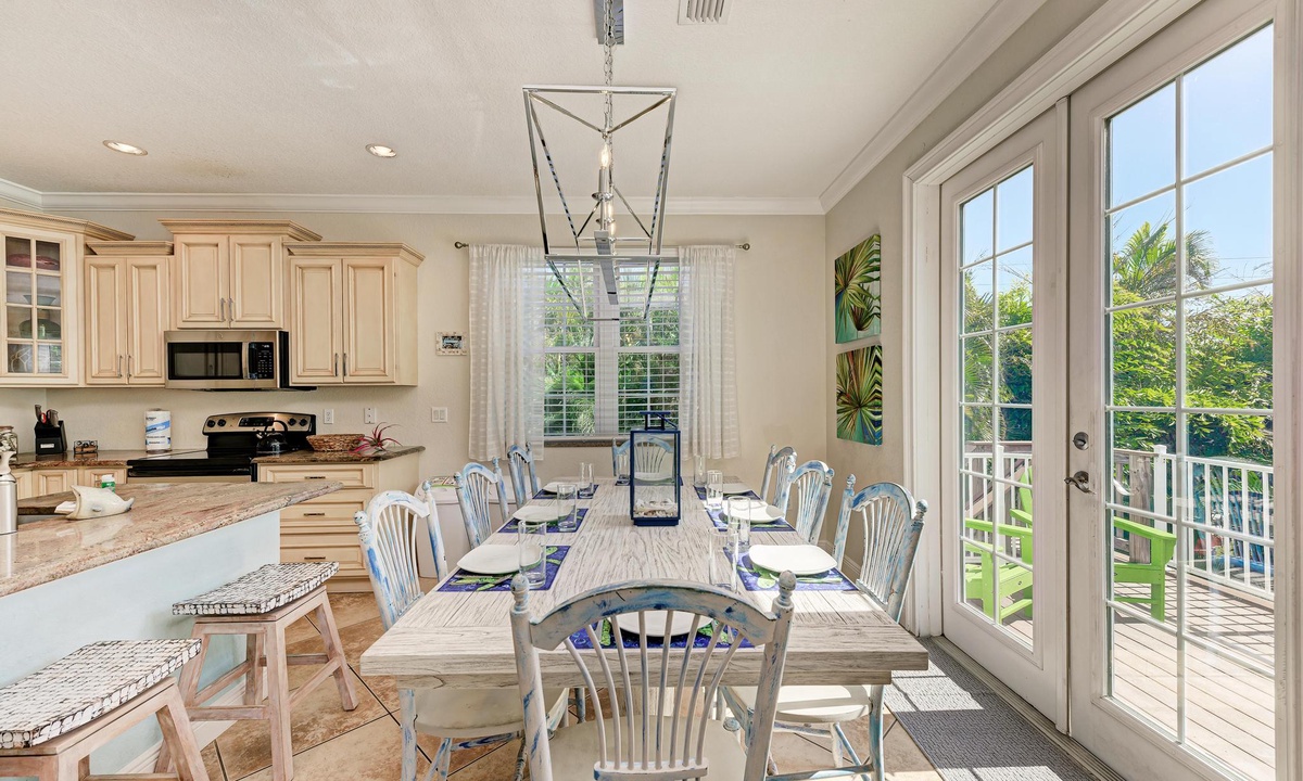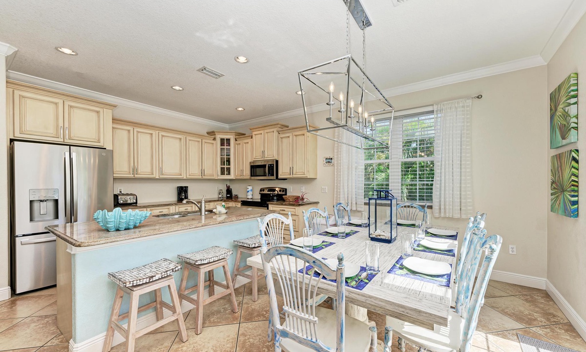 The open floor plan of this Anna Maria Island vacation rental home makes for the perfect space to gather and entertain your friends and loved ones. Feel relaxed and comfortable in the living room with a flat-screen television, wireless internet, and comfortable furniture. In the dining room, you'll find seating for eight guests with three stools at the kitchen breakfast counter. The kitchen at "Casa Morado" is fully equipped with all the basics you are used to having at home including stainless steel appliances, a dishwasher, and gorgeous countertops.