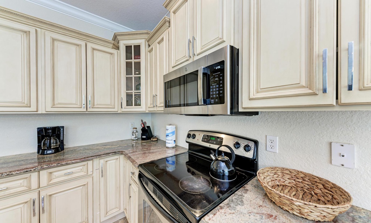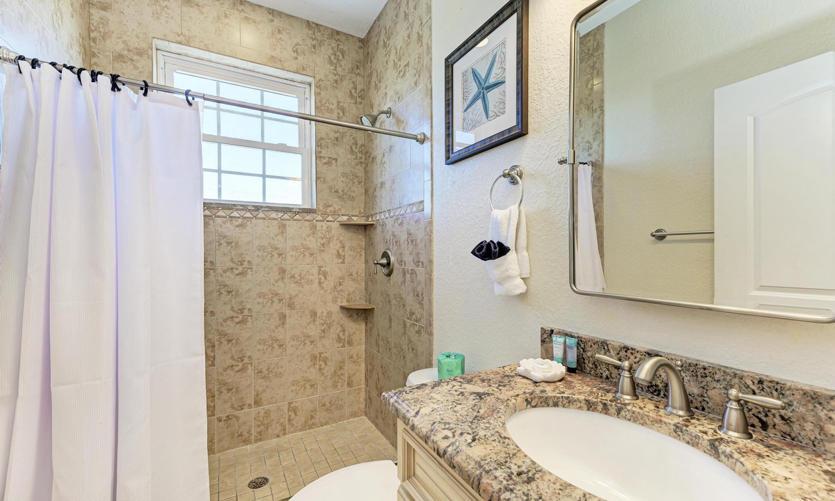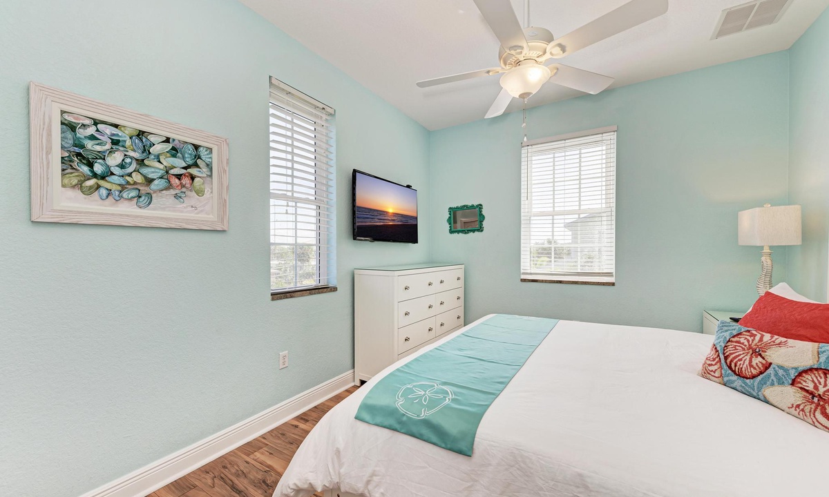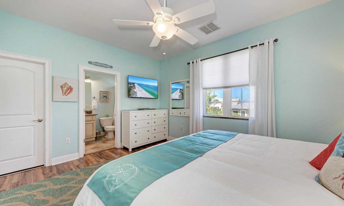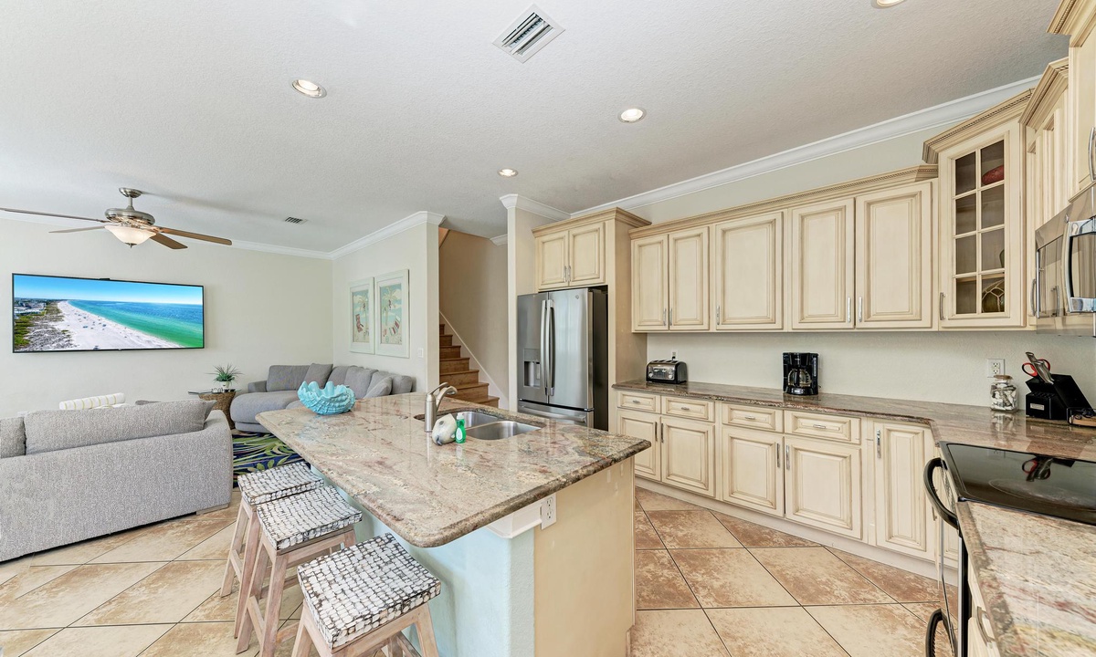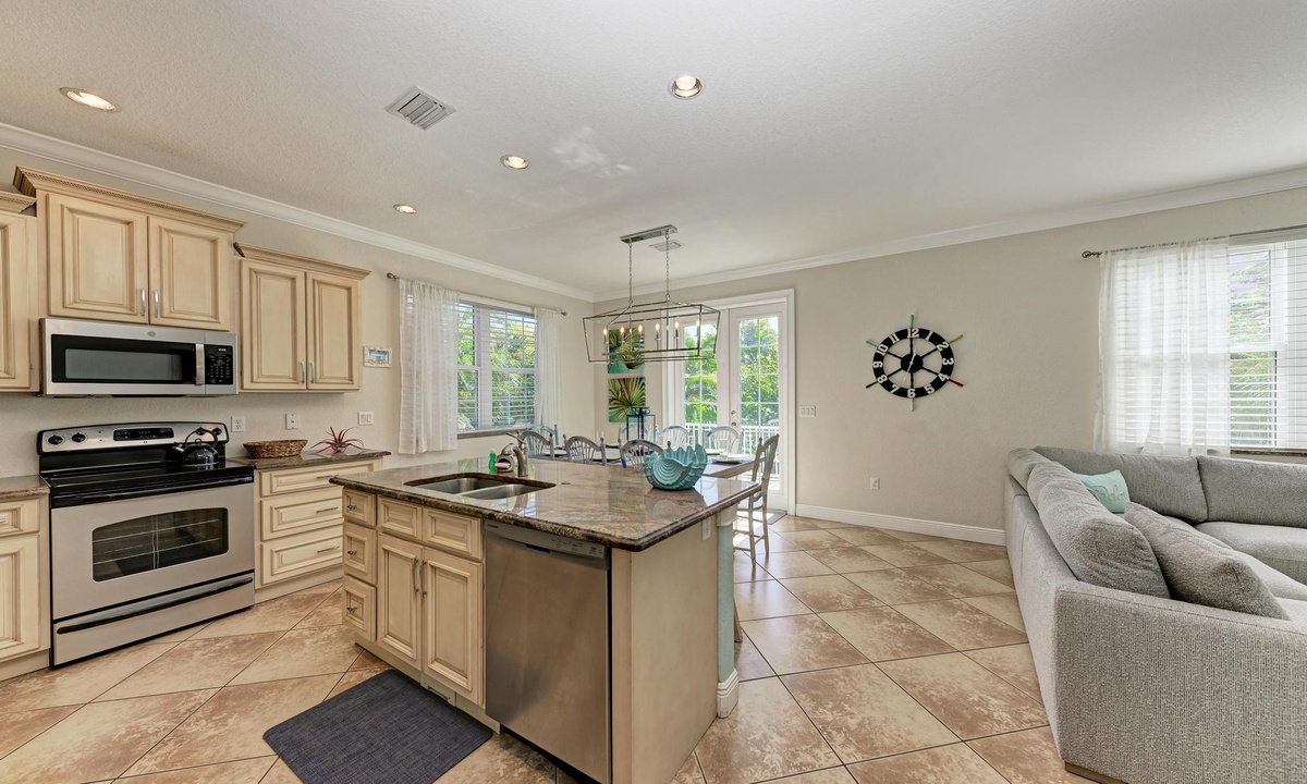 The open floor plan of this Anna Maria Island vacation rental home makes for the perfect space to gather and entertain your friends and loved ones. Feel relaxed and comfortable in the living room with a flat-screen television, wireless internet, and comfortable furniture. In the dining room, you'll find seating for eight guests with three stools at the kitchen breakfast counter. The kitchen at "Casa Morado" is fully equipped with all the basics you are used to having at home including stainless steel appliances, a dishwasher, and gorgeous countertops.