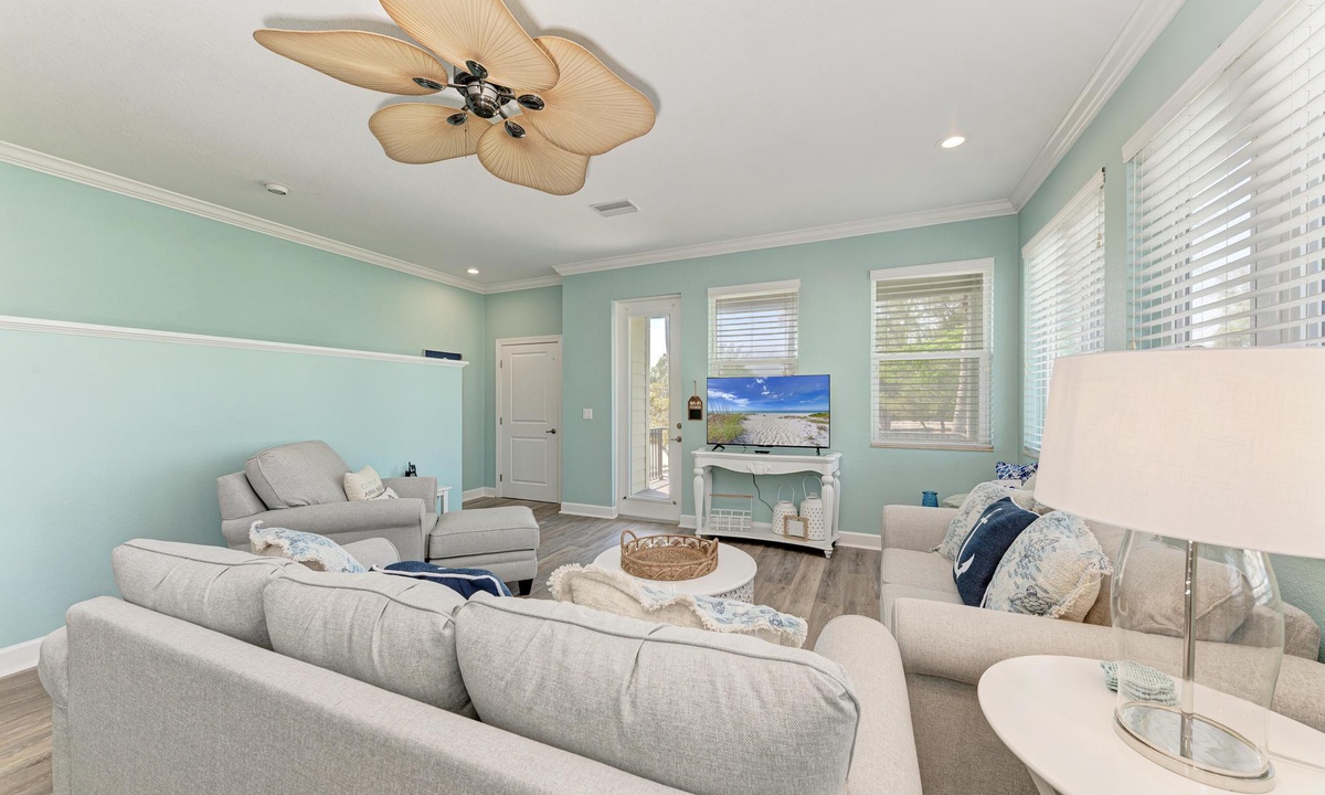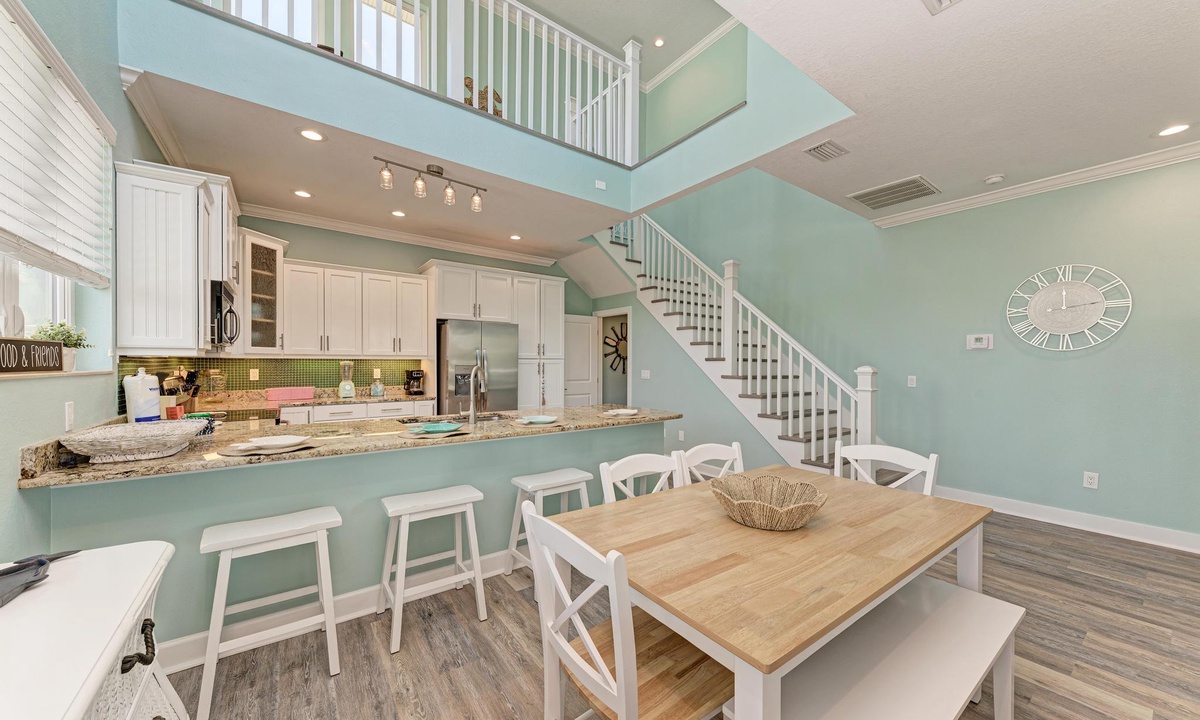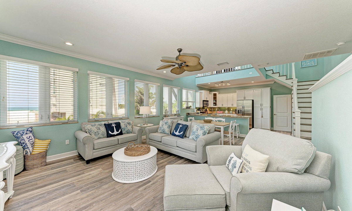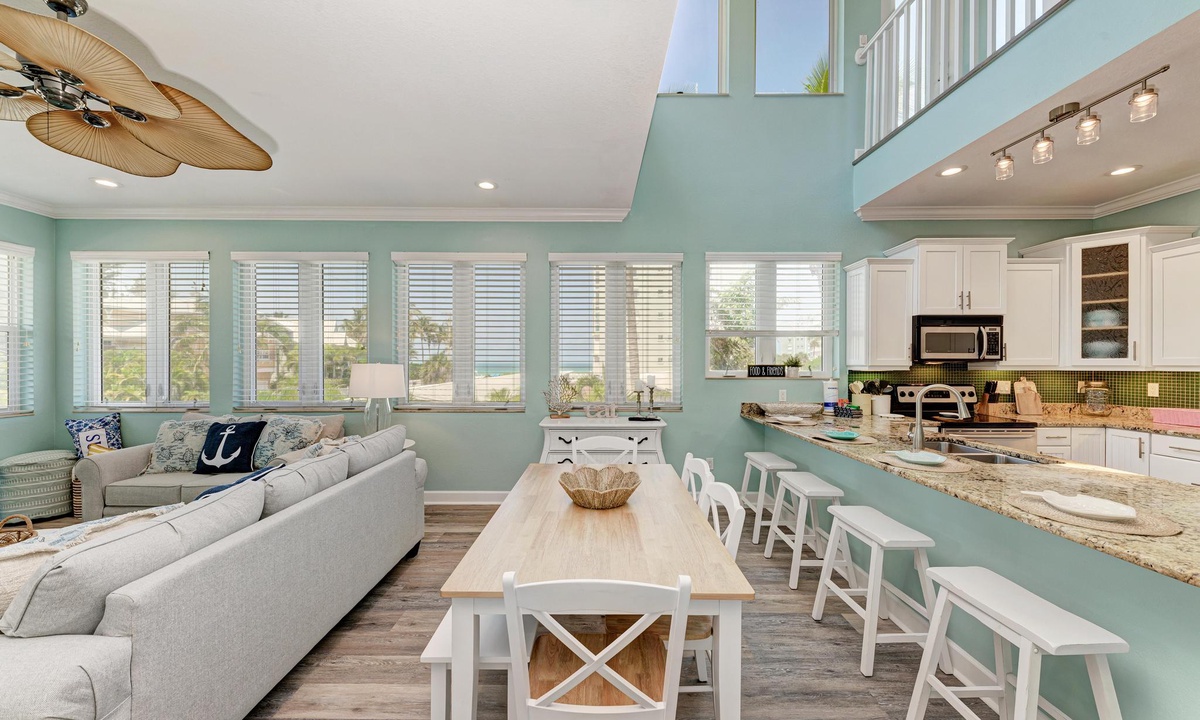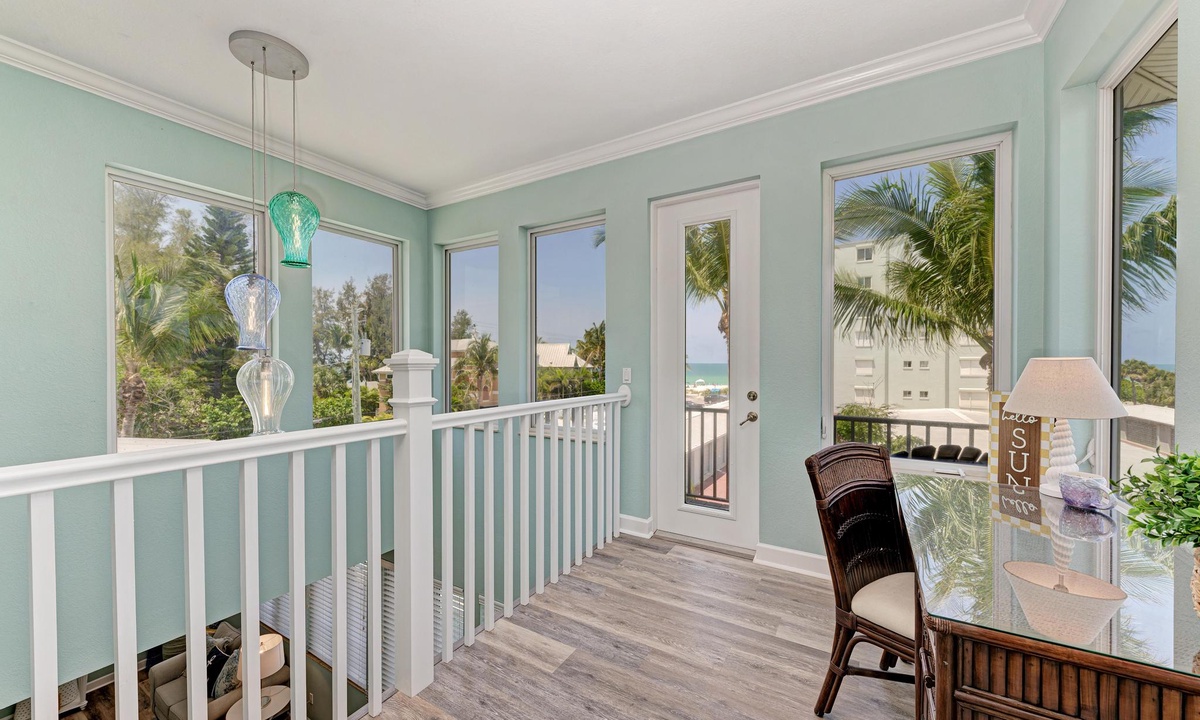 The 3rd floor loft is a ready work station with balcony and the best views in the house! The 2nd and 3rd levels have wall to wall windows that offer picturesque beach views and two exterior balconies to enjoy sunrise and sunset during your stay! The 2nd level balcony also has seating for 4 to dine or to enjoy your morning coffee or to relax with a glass of wine.