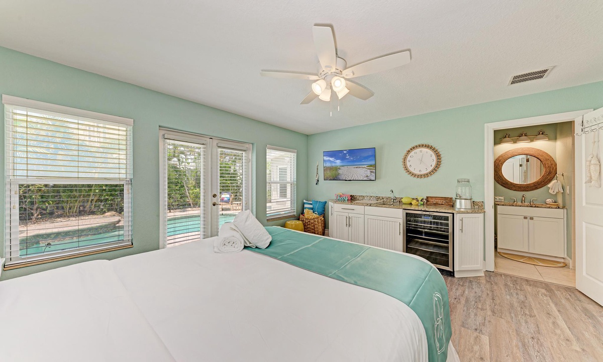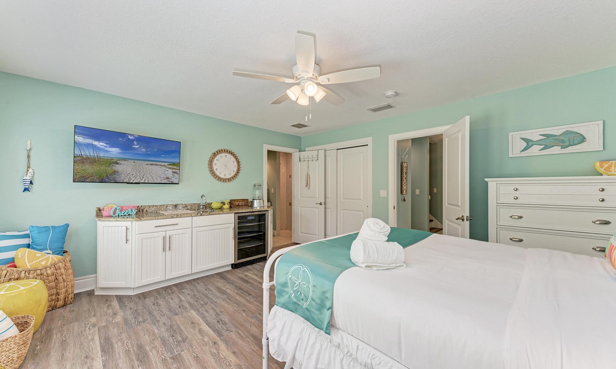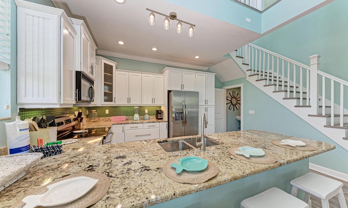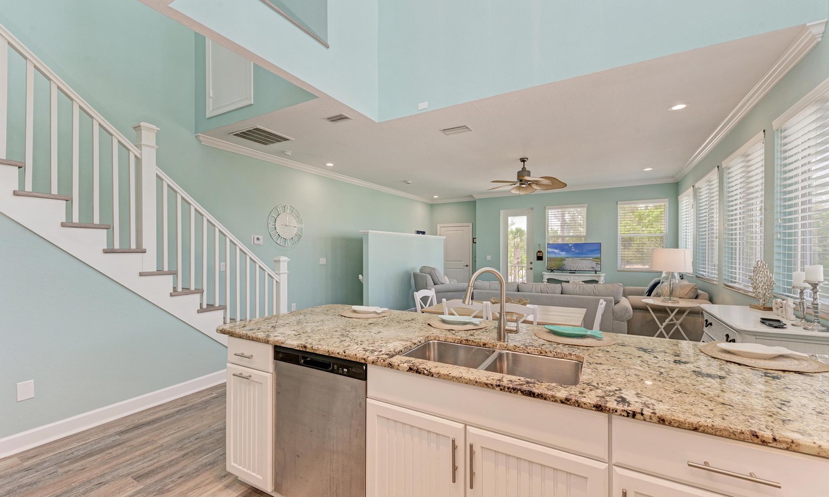 Renovated in April 2024, all bedrooms are conveniently located on the main entry level and offer a king bed in the master, a queen bed in the guest room and 2 twin beds in the third bedroom. The master bedroom and the queen room both have a private bathroom and walk out to the outdoor private gated pool area. The twin bedroom walks out to a secluded outdoor patio. Upstairs you will find high vaulted ceilings over the open floor plan family area that includes a cozy living room, dining for 6, and an open galley style kitchen with island that seats 4. There is also a half bathroom off the kitchen. All bedrooms and living room include new flat screen smart TV's.