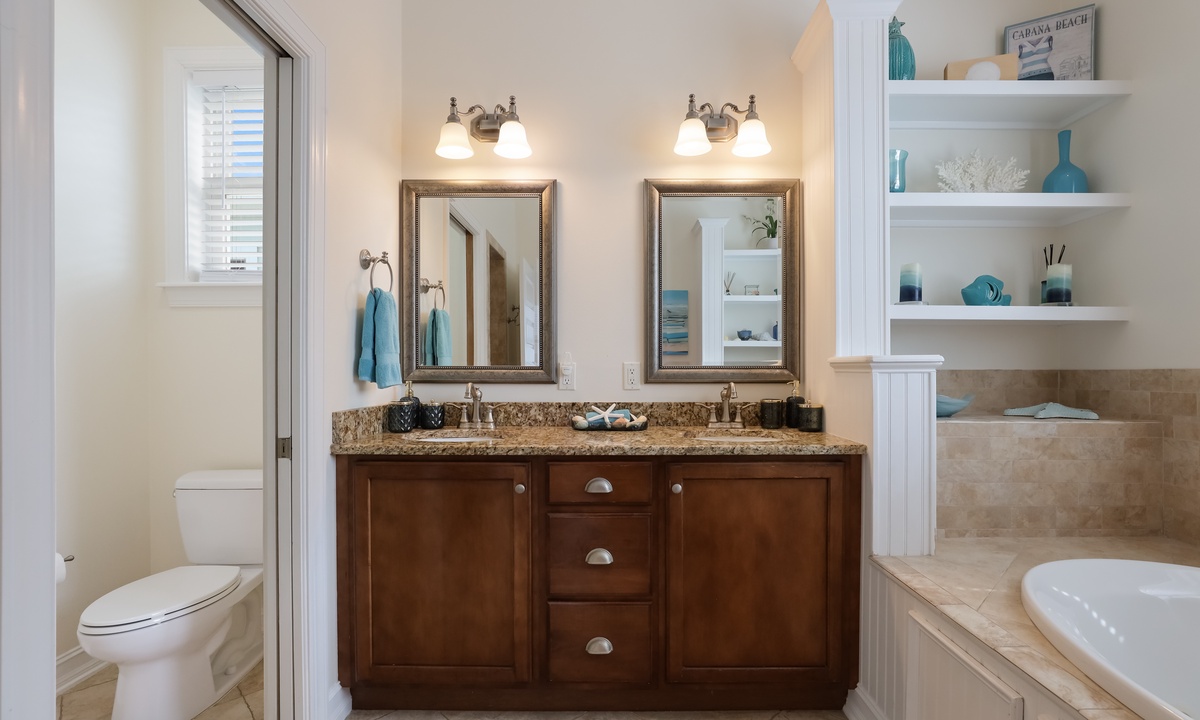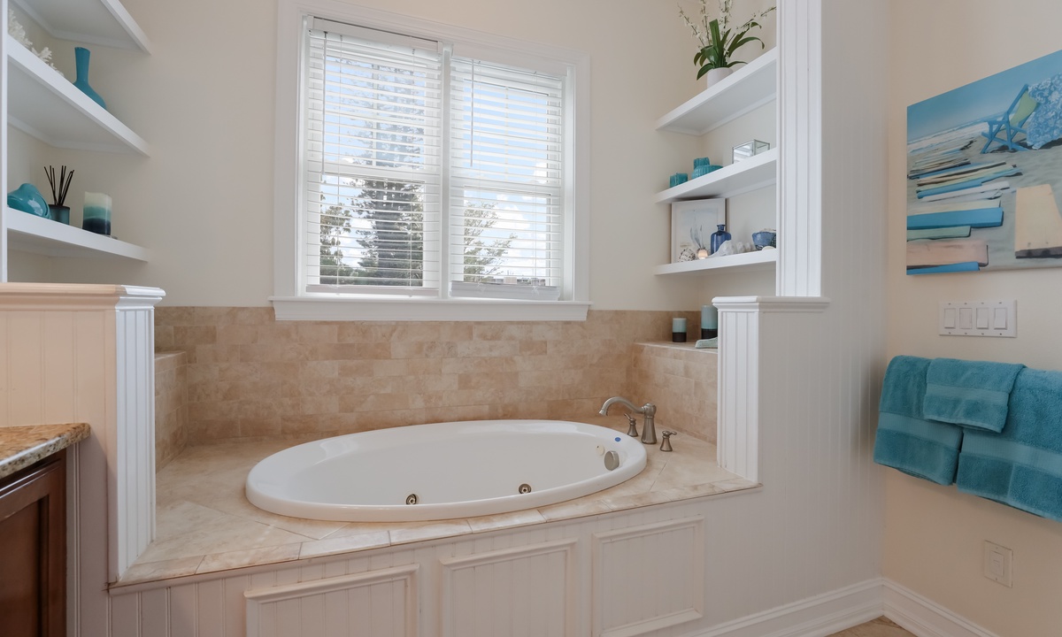 Primary Suite (2nd Floor): King bed with private balcony access, a flat-screen TV, an ensuite bathroom featuring a jacuzzi tub and walk-in shower.