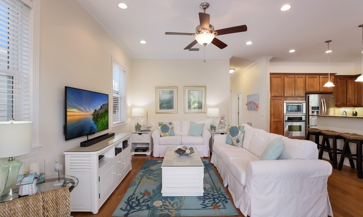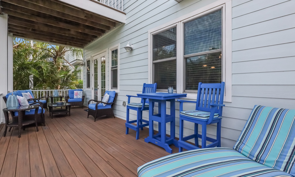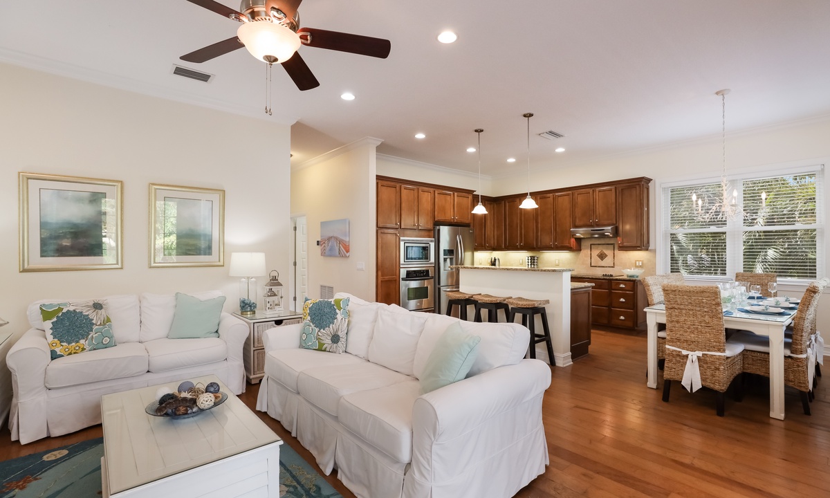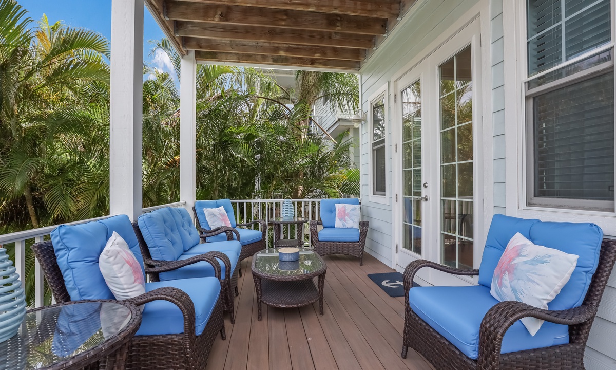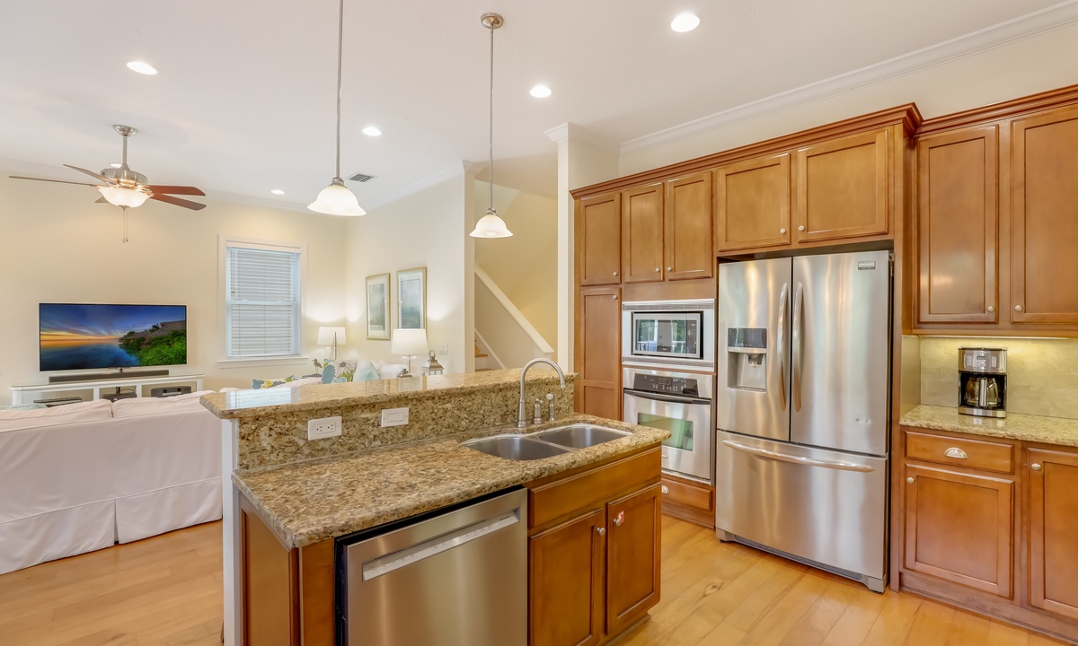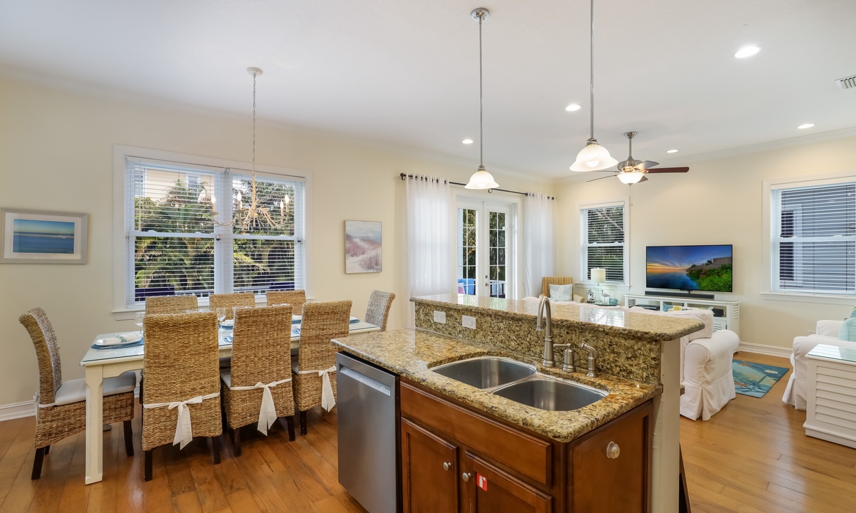 The living area is bright, open, and super inviting, with comfy seating and French doors that lead out to a stunning second-floor patio. The kitchen is fully stocked and ready for whatever you’re cooking up, with lots of counter space and an island for quick snacks. Gather around the dining table for meals, then take your dessert out to the balcony to enjoy the breeze on plush outdoor seating.