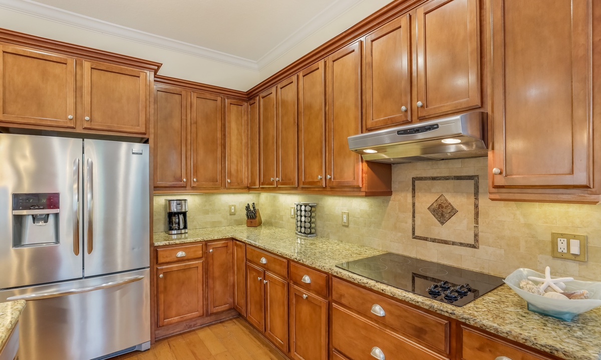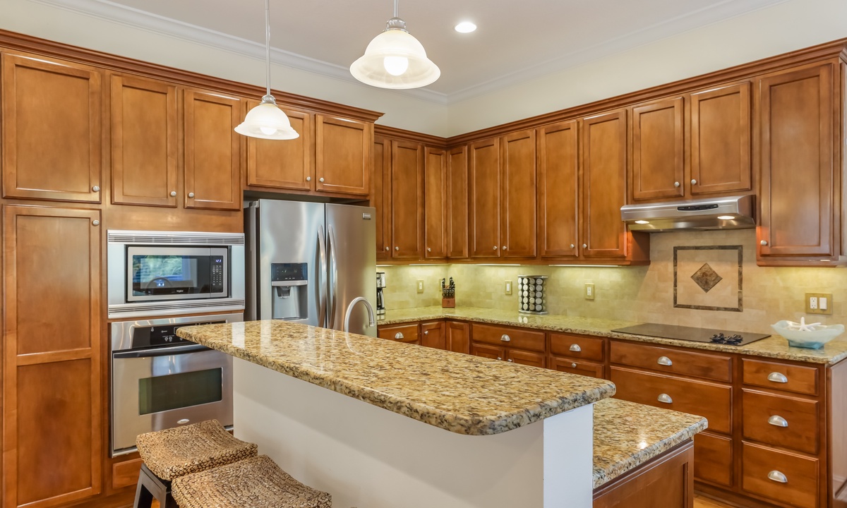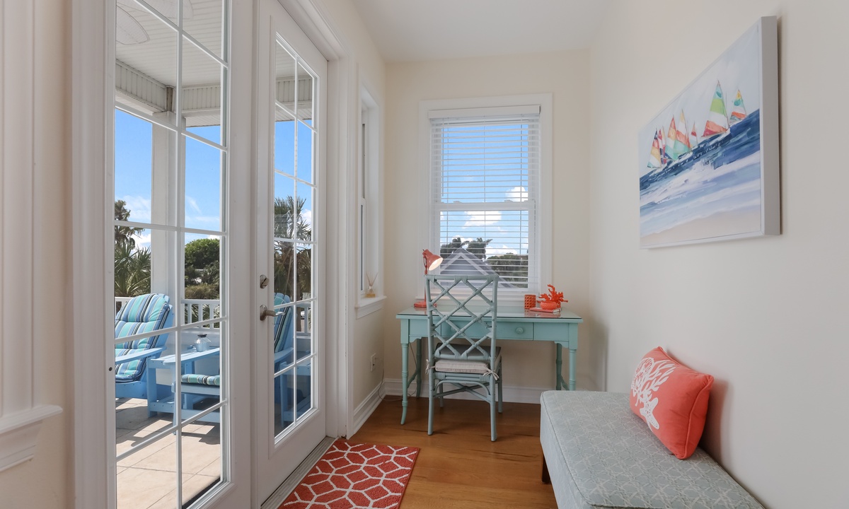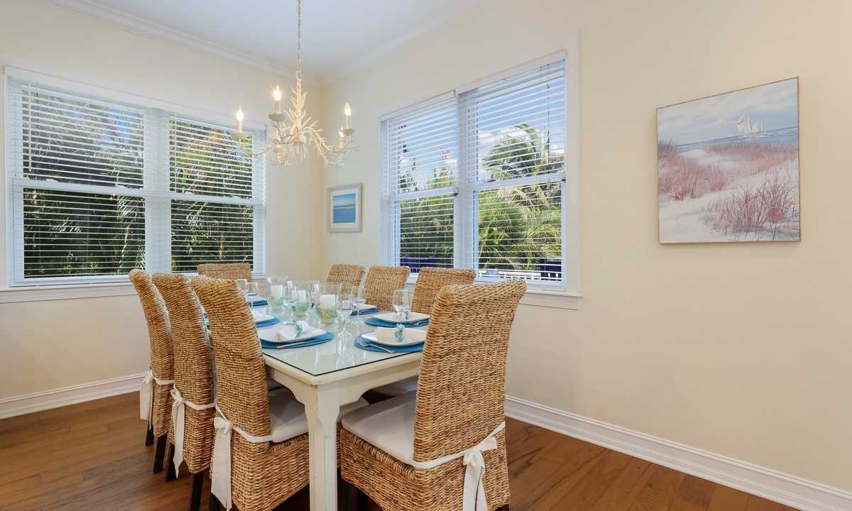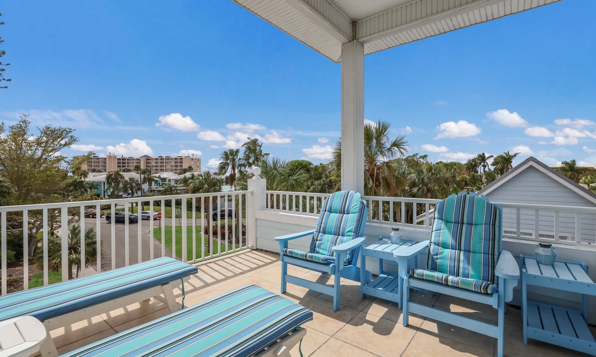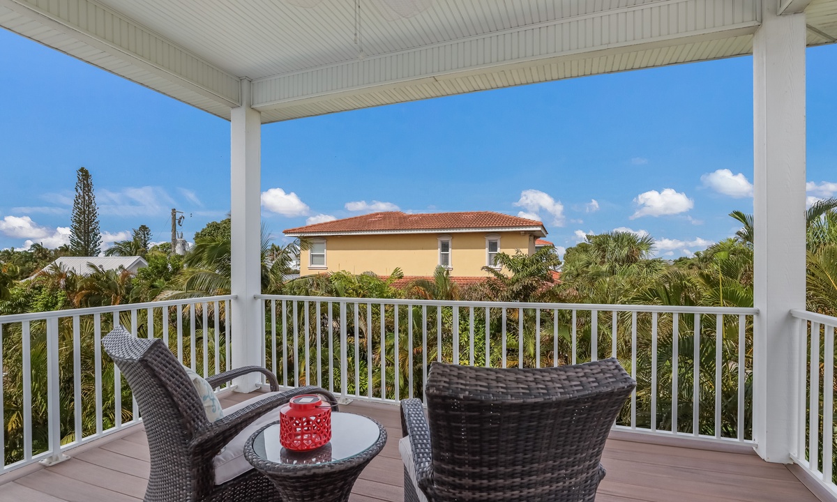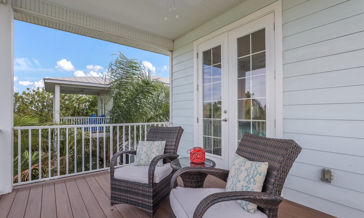 The living area is bright, open, and super inviting, with comfy seating and French doors that lead out to a stunning second-floor patio. The kitchen is fully stocked and ready for whatever you’re cooking up, with lots of counter space and an island for quick snacks. Gather around the dining table for meals, then take your dessert out to the balcony to enjoy the breeze on plush outdoor seating.