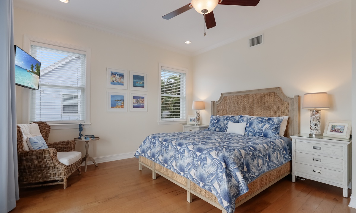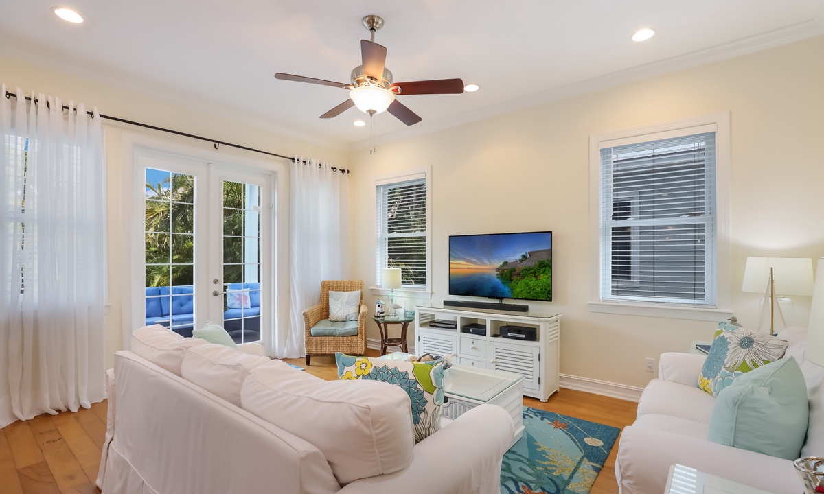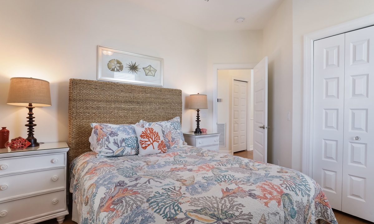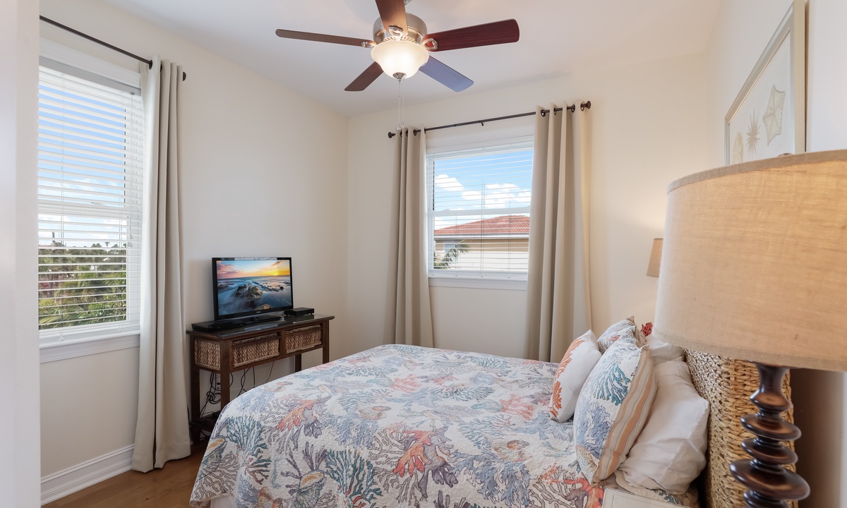 The primary bedroom is a dreamy retreat, complete with its own private balcony for catching the ocean breeze and a nice walk-in closet. The spa-like ensuite bathroom has a jacuzzi tub and walk-in shower to help you unwind in style. The second bedroom has a chill coastal vibe and its own private balcony, while the third bedroom lets you fall asleep to the sound of rustling palms. The fourth bedroom is great for kids, with room to play and plenty of charm. And if you need extra space, the living room has a queen sleeper sofa ready to go.