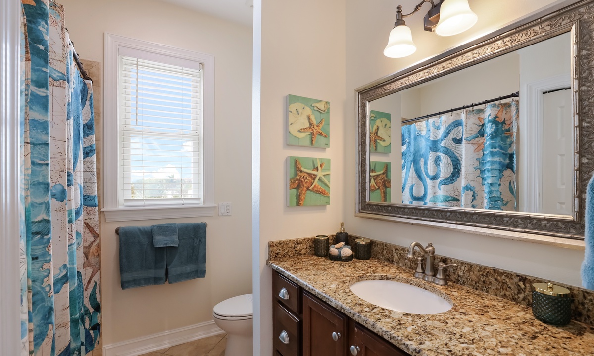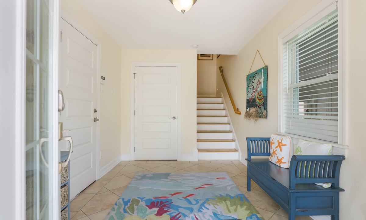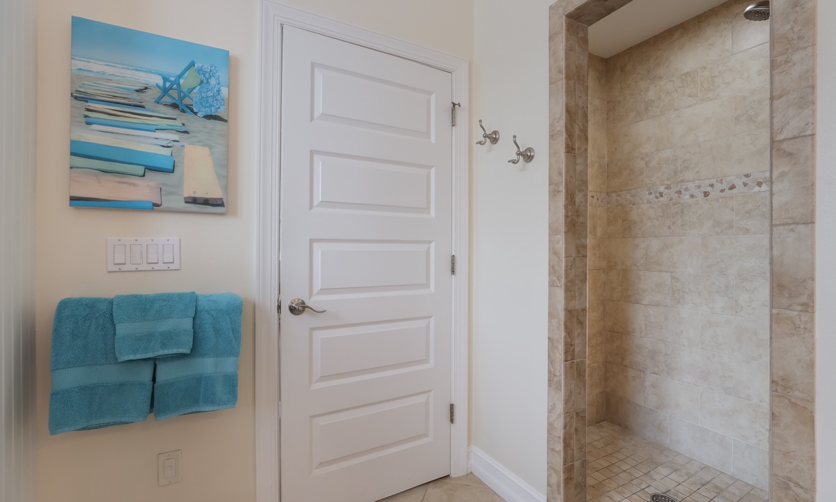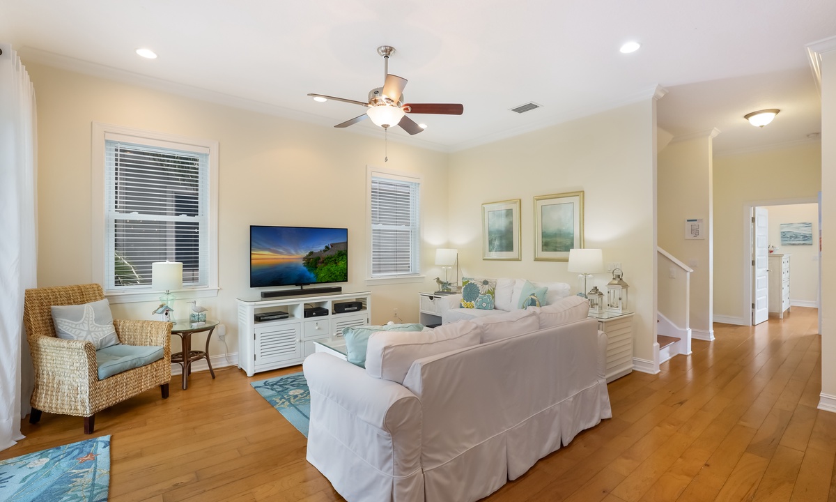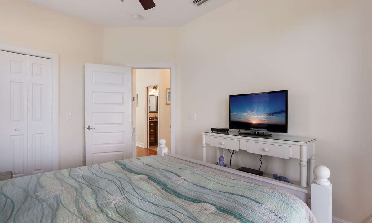 The primary bedroom is a dreamy retreat, complete with its own private balcony for catching the ocean breeze and a nice walk-in closet. The spa-like ensuite bathroom has a jacuzzi tub and walk-in shower to help you unwind in style. The second bedroom has a chill coastal vibe and its own private balcony, while the third bedroom lets you fall asleep to the sound of rustling palms. The fourth bedroom is great for kids, with room to play and plenty of charm. And if you need extra space, the living room has a queen sleeper sofa ready to go.