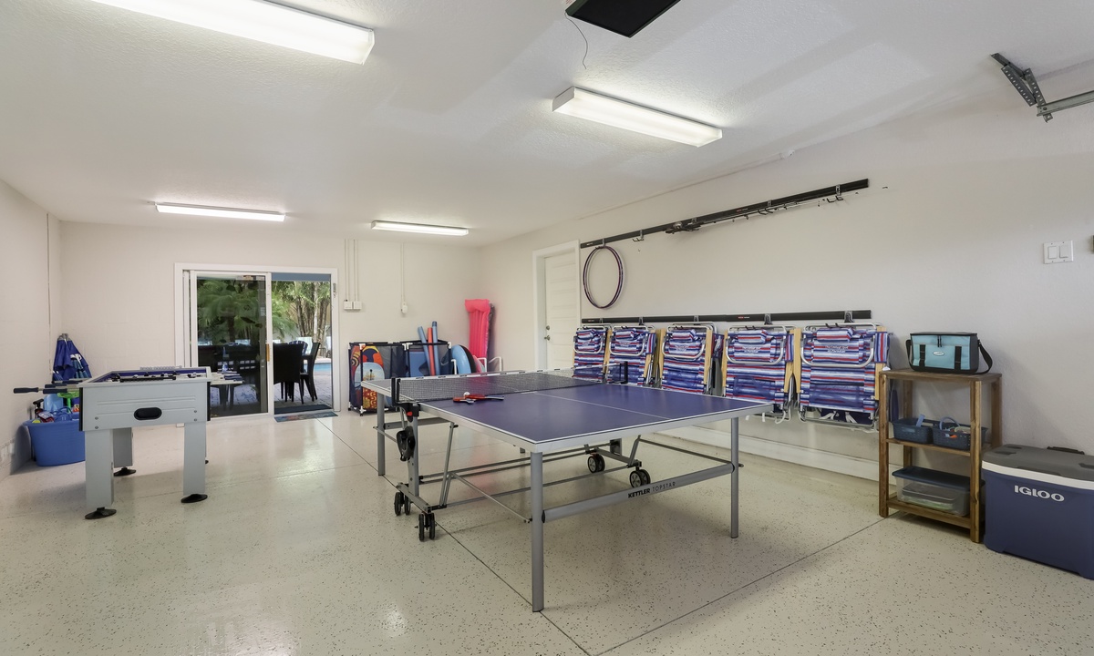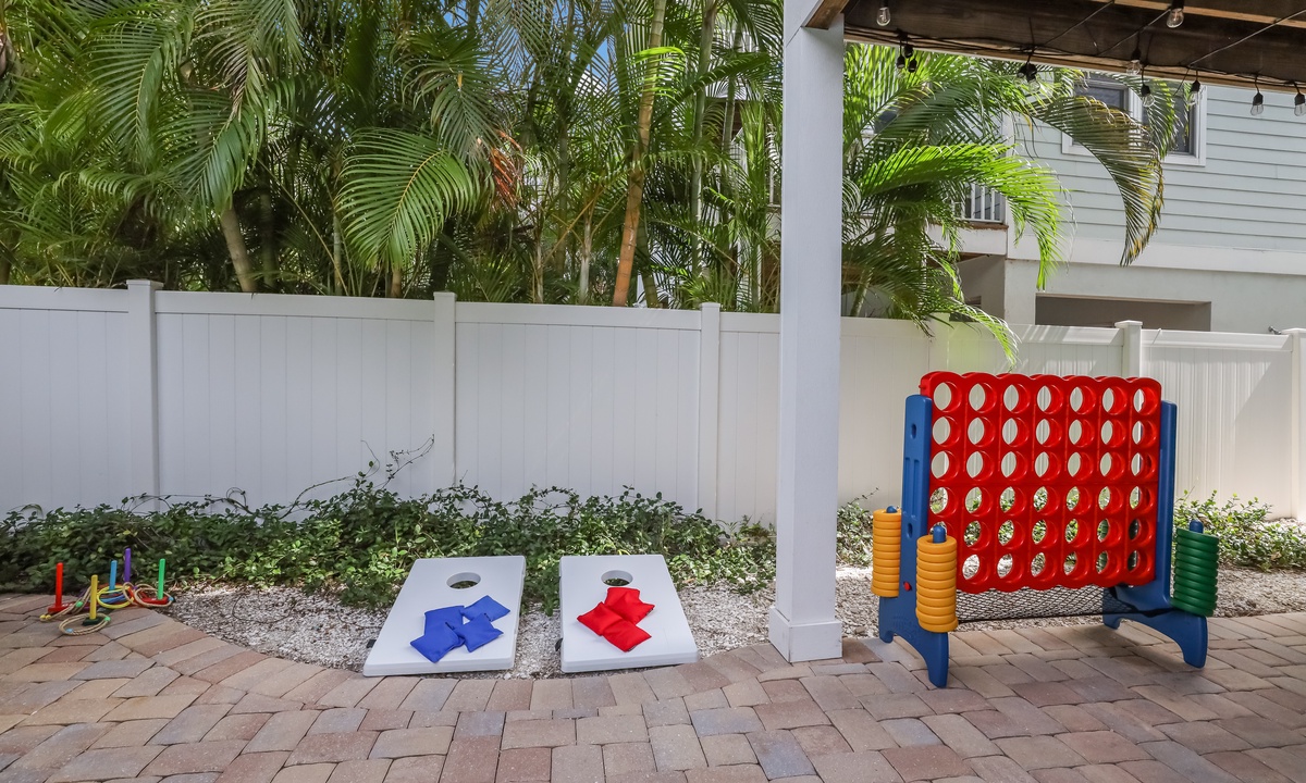 Now let’s talk about the backyard—it’s a showstopper. The pool has a swim-up tiki table (hello, vacation vibes!), and there’s a hot tub for ultimate relaxation. The covered patio has tons of seating and an outdoor kitchen with stainless steel appliances and a bar area that’s perfect for entertaining. For fun, the game room has everything from ping pong and foosball to corn-hole, Connect Four, and even axe throwing. You’ll never run out of things to do here! Fairwinds isn’t just a vacation rental—it’s your new happy place.