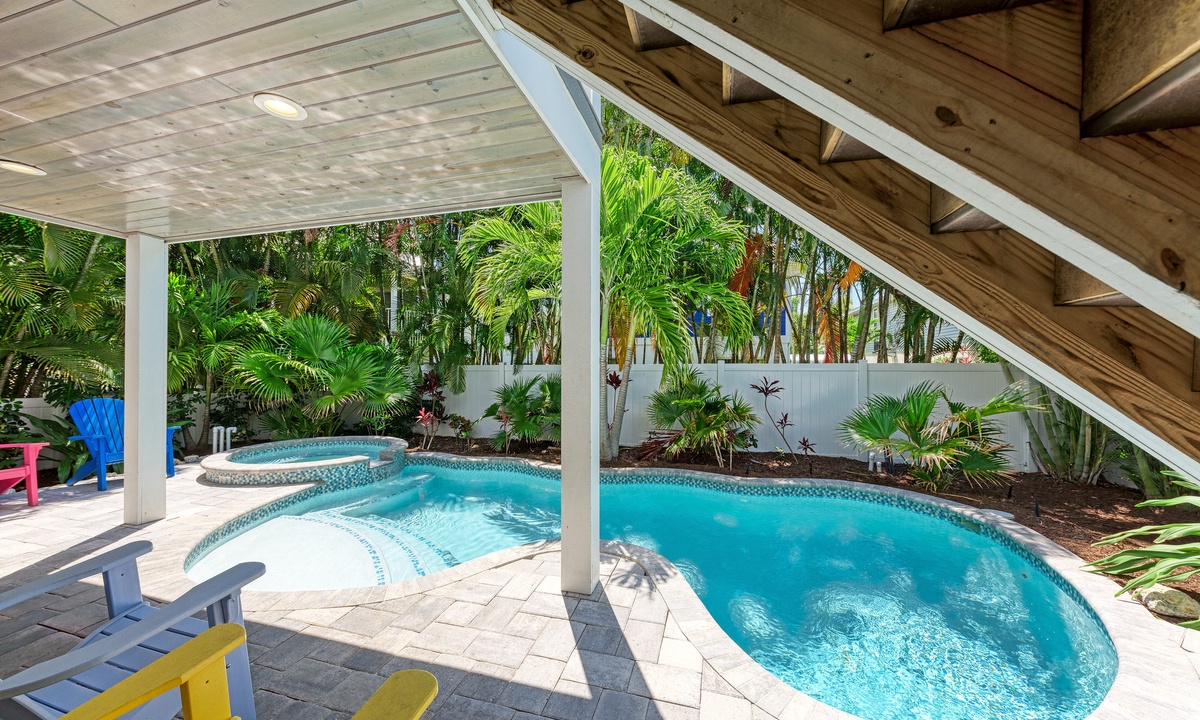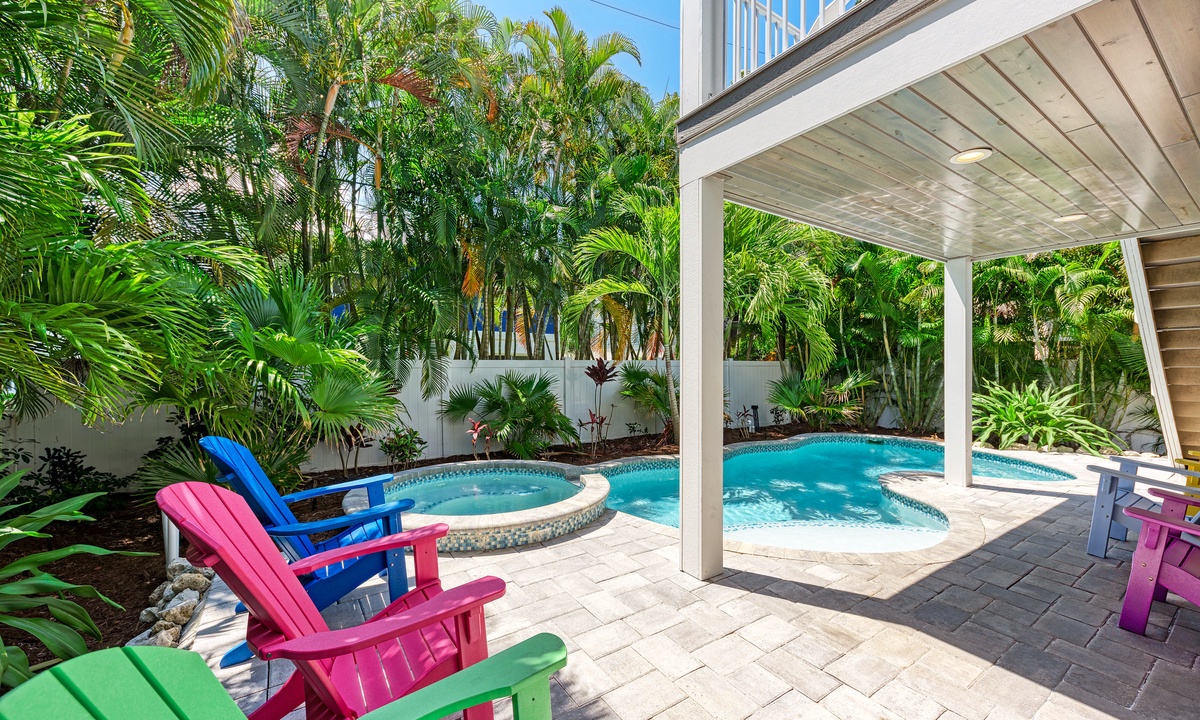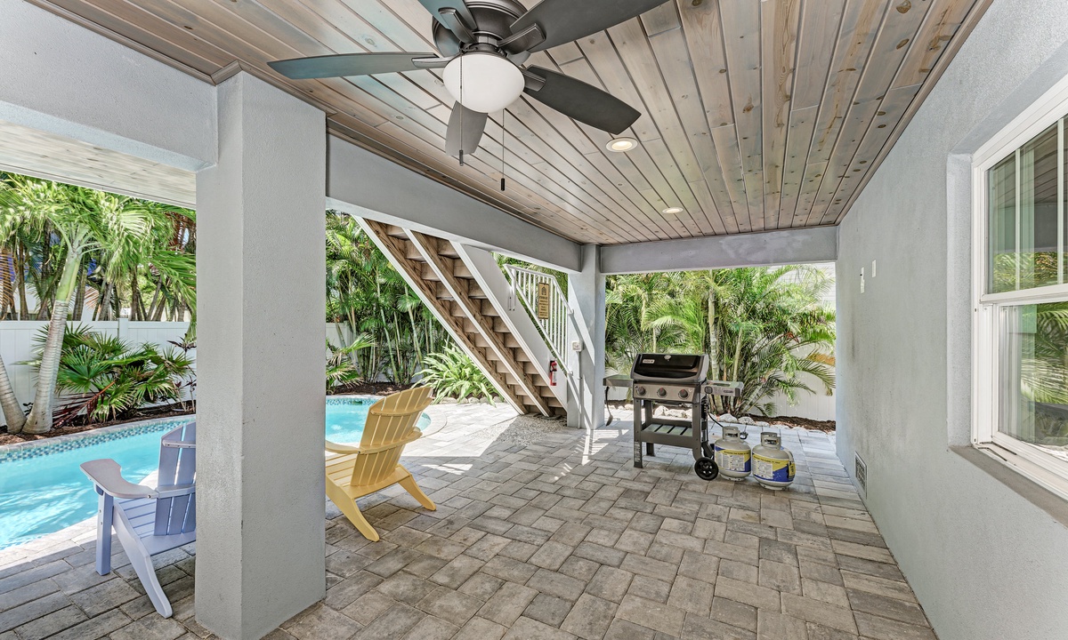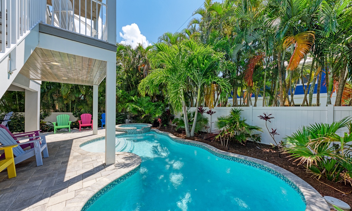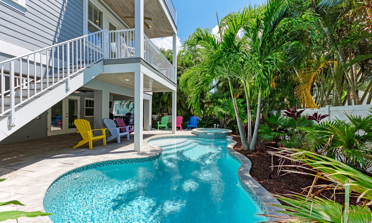 Before stepping outside to the outdoor oasis, find yourself playing a round of ping pong in the game room downstairs that also has a mini fridge. Outside you will find yourself emerged in a true oasis with palms surrounding the tranquil pool and spa, outdoor shower, propane grill and seating area with a flat screen TV. The under-deck shade area has a TV and fan so it is the perfect area to take a break from the sun a cool down! You and your guests will find it difficult to leave this outside space.