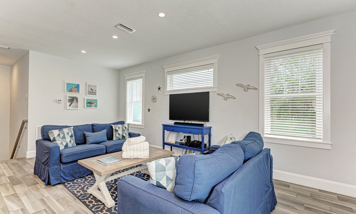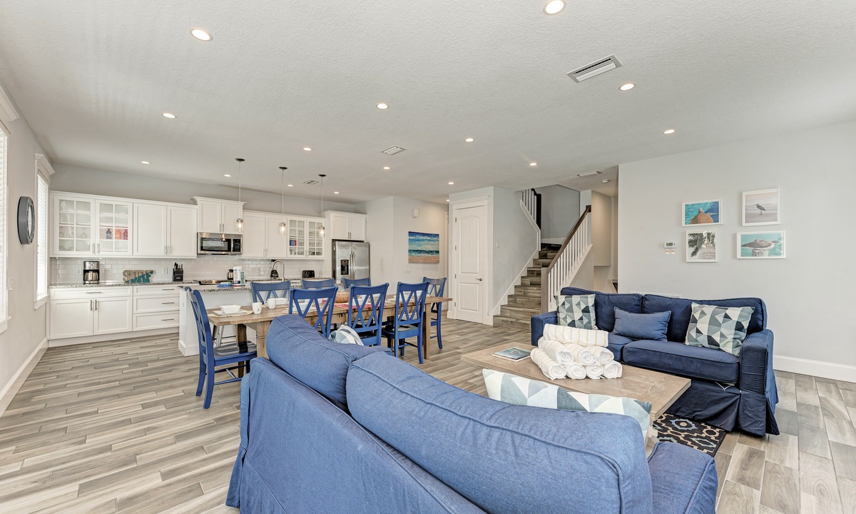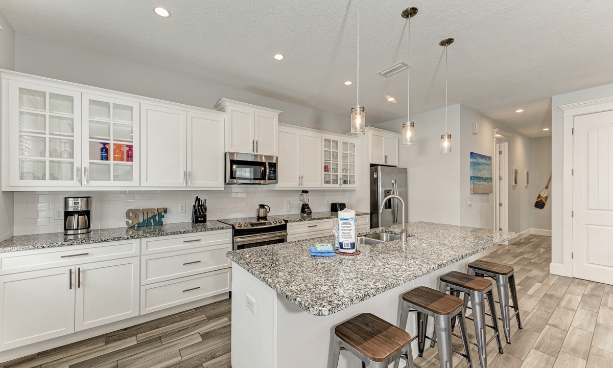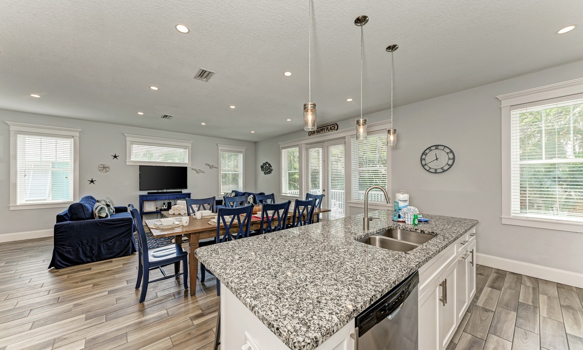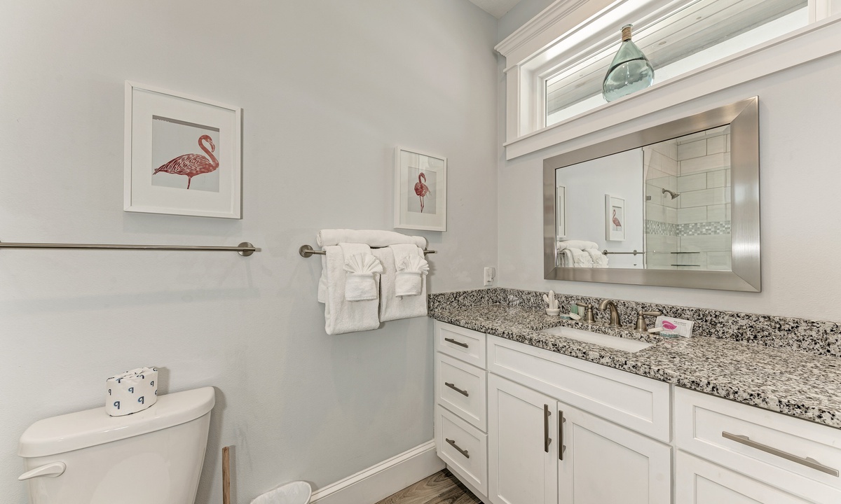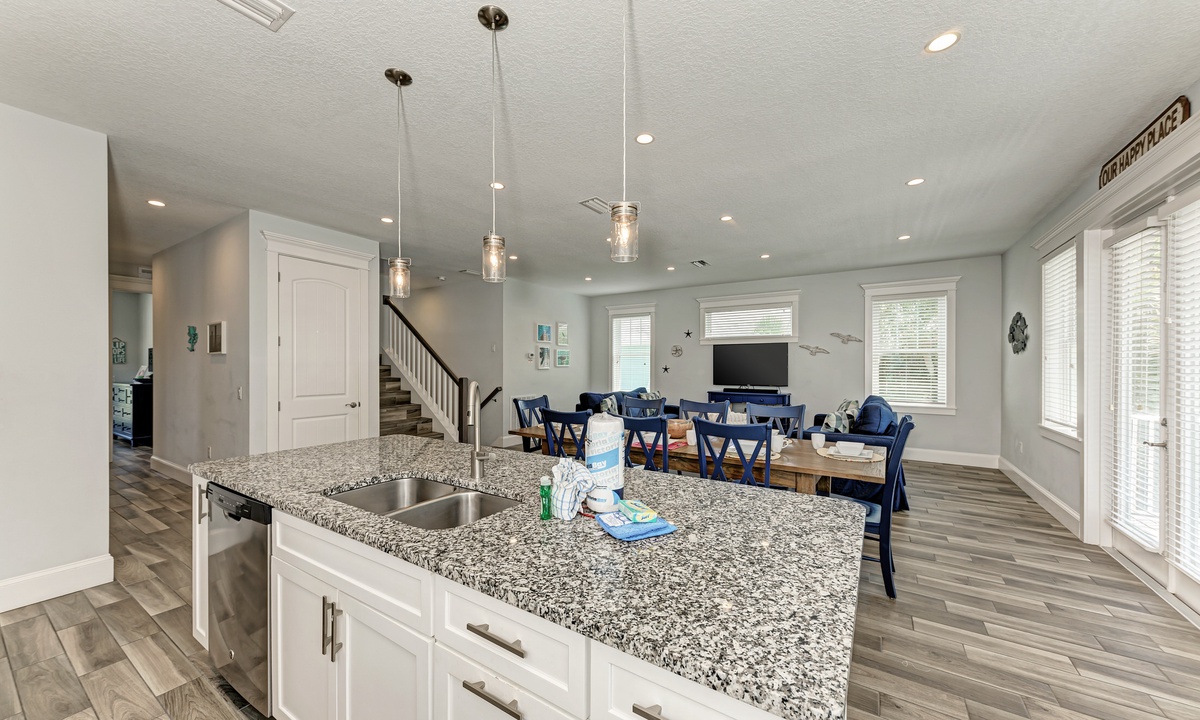 This home’s main living level offers an open-floor plan with ample seating options for everyone to catch up and wind down after a long beach day! The kitchen has granite countertops throughout, stainless steel appliances, and a large island with seating for 4. The large dining table can seat up to 8 and is conveniently located just off the kitchen. Just beyond that you will find seating with a flat screen TV that can be seen even from the kitchen, so everyone can cheer on your favorite team during the big game! This main living floor also has 2 bedrooms and 2 bathrooms, one with a Queen bed and one with a King and its own private bathroom.