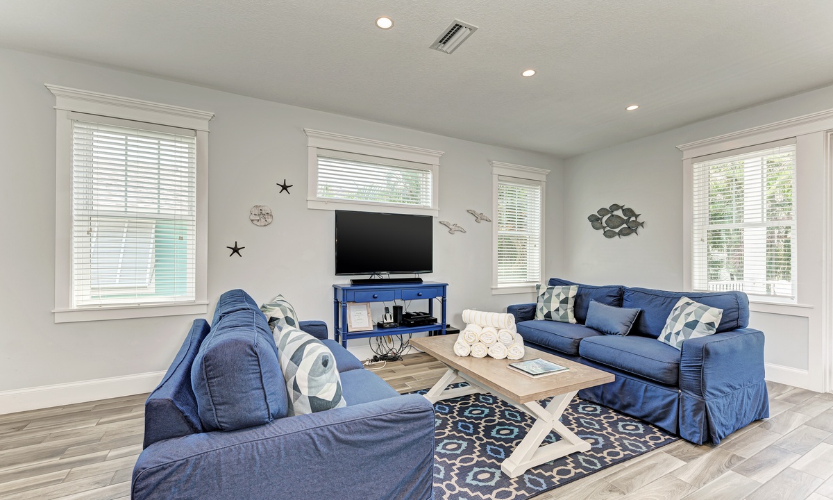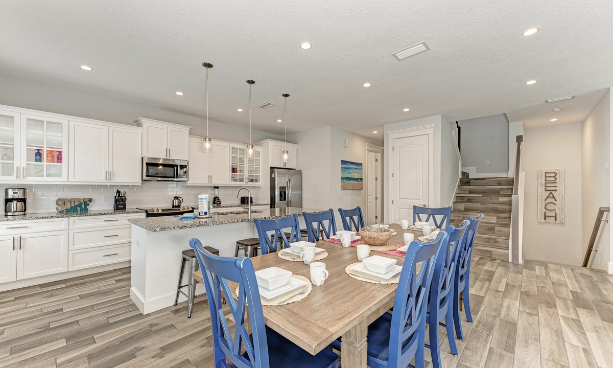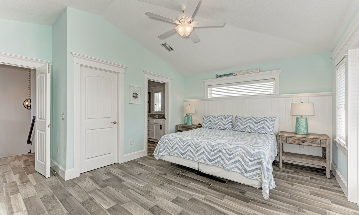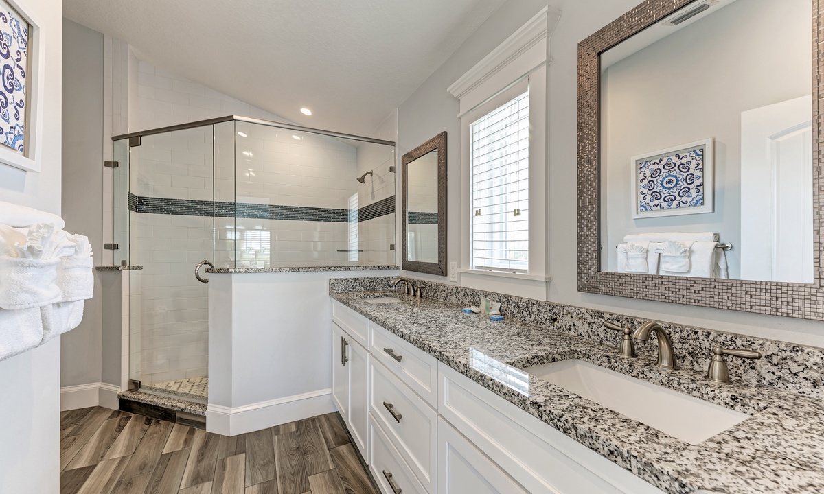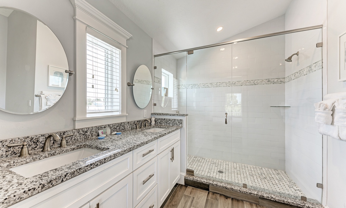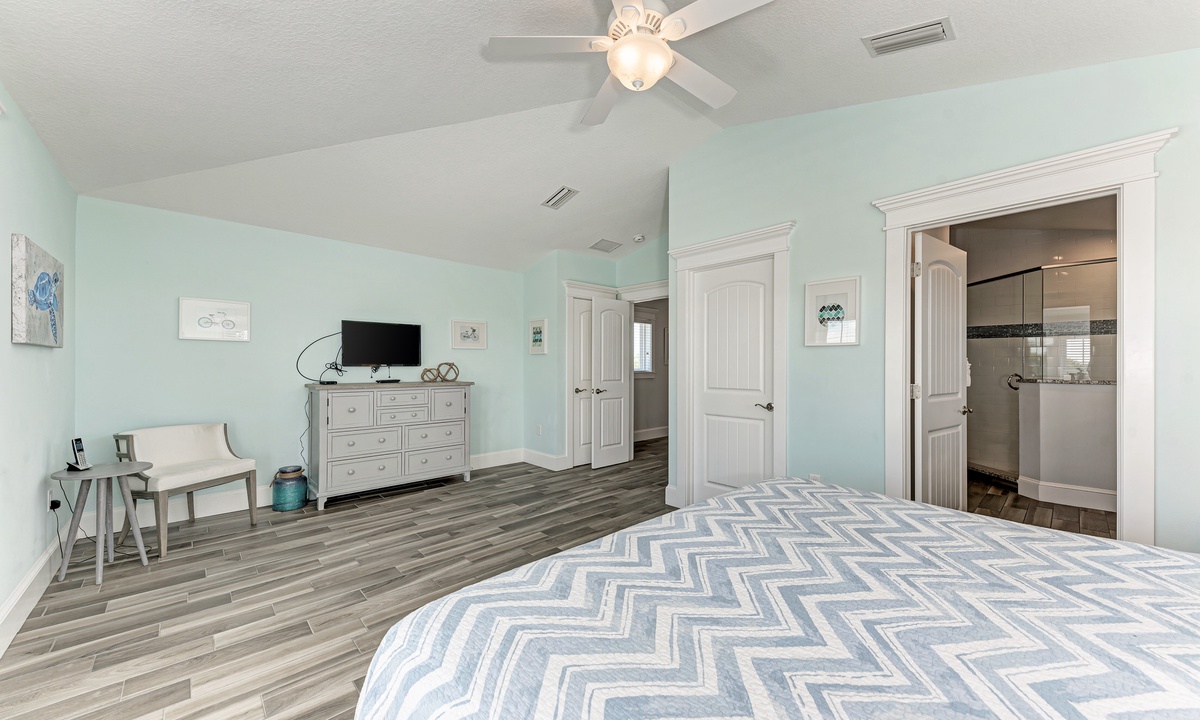 This home’s main living level offers an open-floor plan with ample seating options for everyone to catch up and wind down after a long beach day! The kitchen has granite countertops throughout, stainless steel appliances, and a large island with seating for 4. The large dining table can seat up to 8 and is conveniently located just off the kitchen. Just beyond that you will find seating with a flat screen TV that can be seen even from the kitchen, so everyone can cheer on your favorite team during the big game! This main living floor also has 2 bedrooms and 2 bathrooms, one with a Queen bed and one with a King and its own private bathroom.