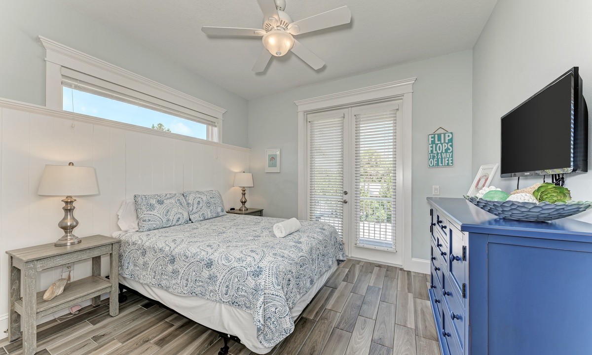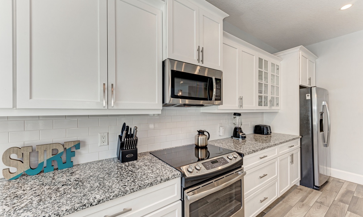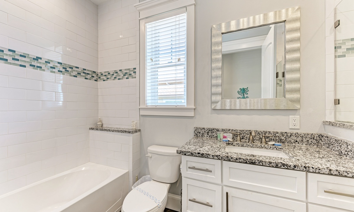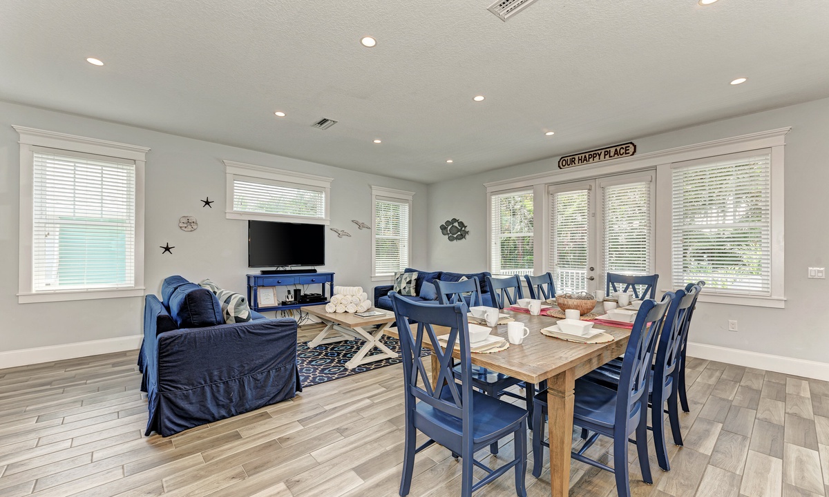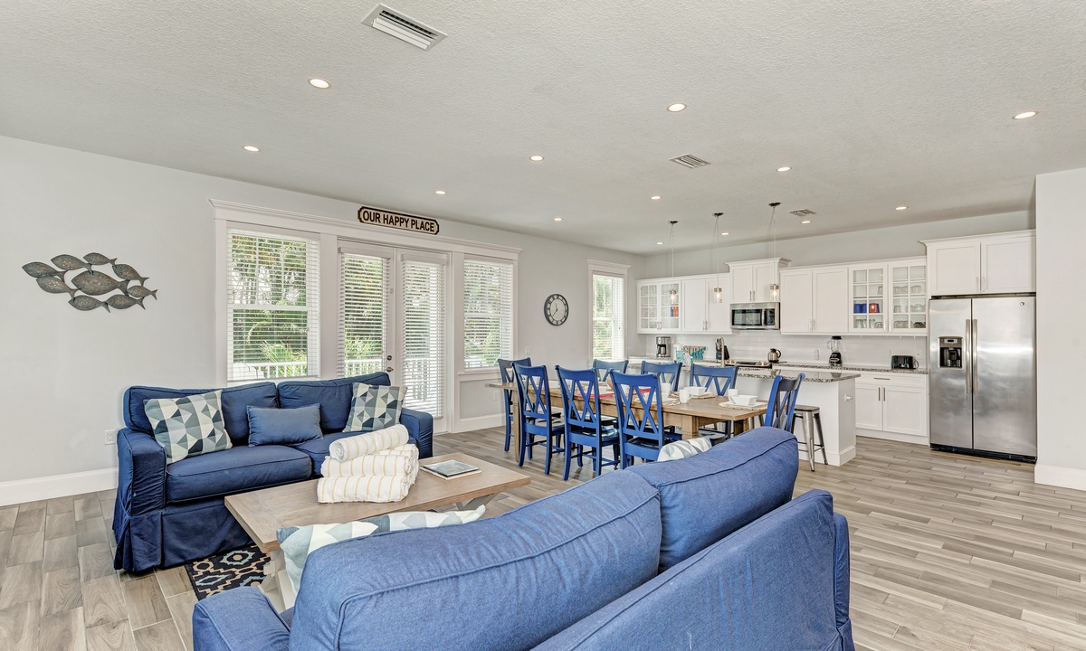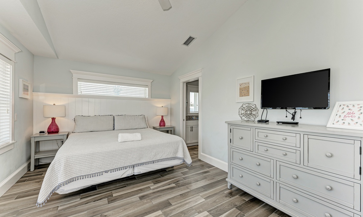 This home’s main living level offers an open-floor plan with ample seating options for everyone to catch up and wind down after a long beach day! The kitchen has granite countertops throughout, stainless steel appliances, and a large island with seating for 4. The large dining table can seat up to 8 and is conveniently located just off the kitchen. Just beyond that you will find seating with a flat screen TV that can be seen even from the kitchen, so everyone can cheer on your favorite team during the big game! This main living floor also has 2 bedrooms and 2 bathrooms, one with a Queen bed and one with a King and its own private bathroom.
