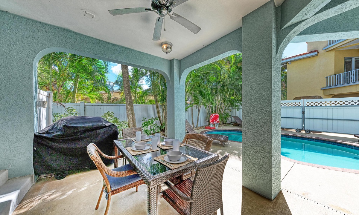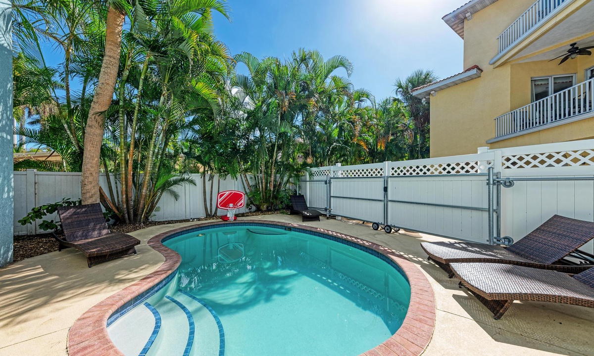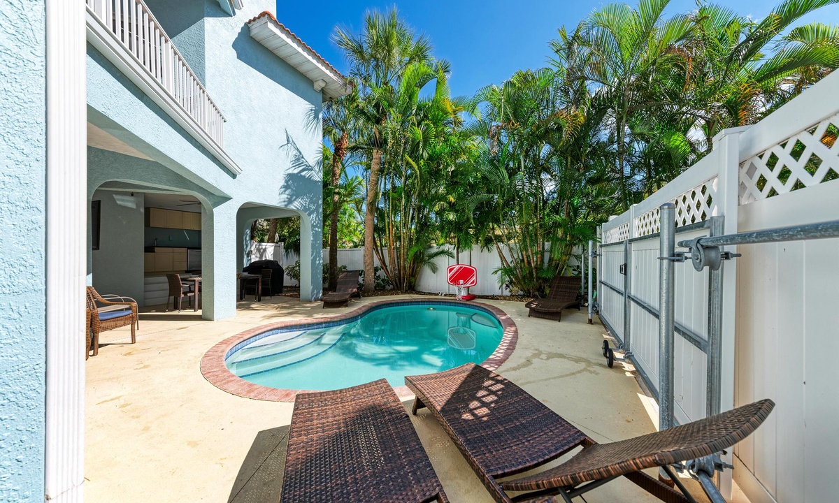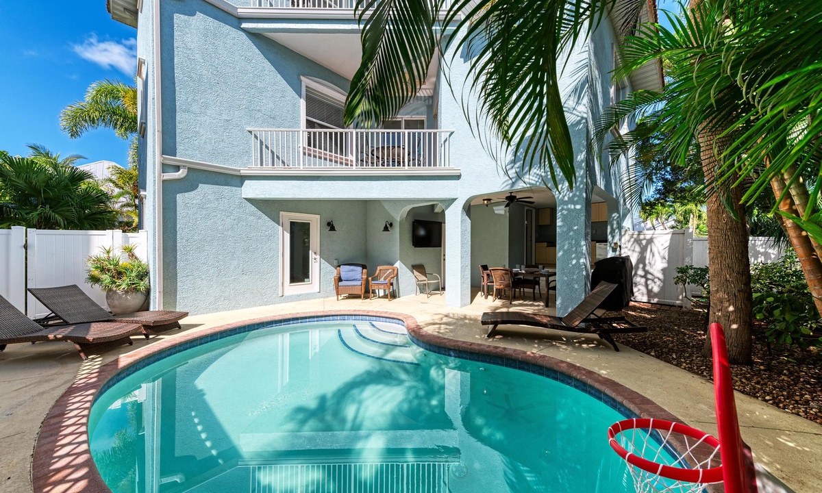This lovely perfectly home is located only one and a half blocks from white sand beaches and gorgeous sunsets, and is also a short walk to many, favorite local restaurants, bars and shopping. Or just head out back to your own private heated pool and patio oasis with fenced backyard. You will enjoy hours of outdoor fun in the poolside lounge area. Grill by the pool and enjoy the outdoor shaded wet bar, mini-fridge, and full bathroom with shower. There is even a fun basketball Pop-o-Shot game and beach equipment for guests to enjoy.