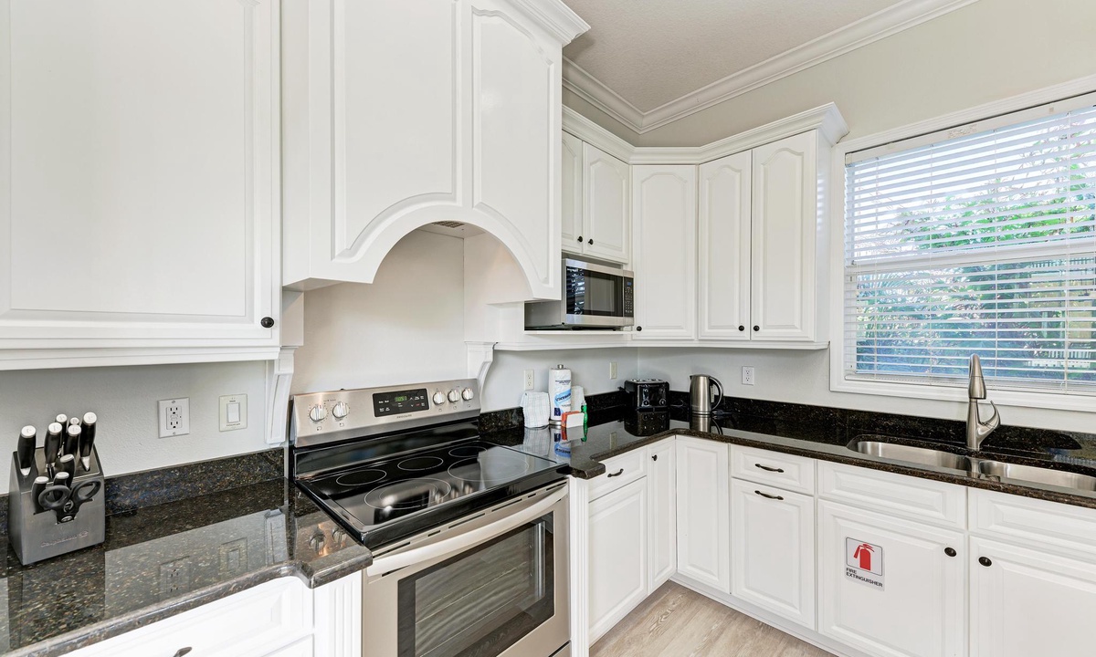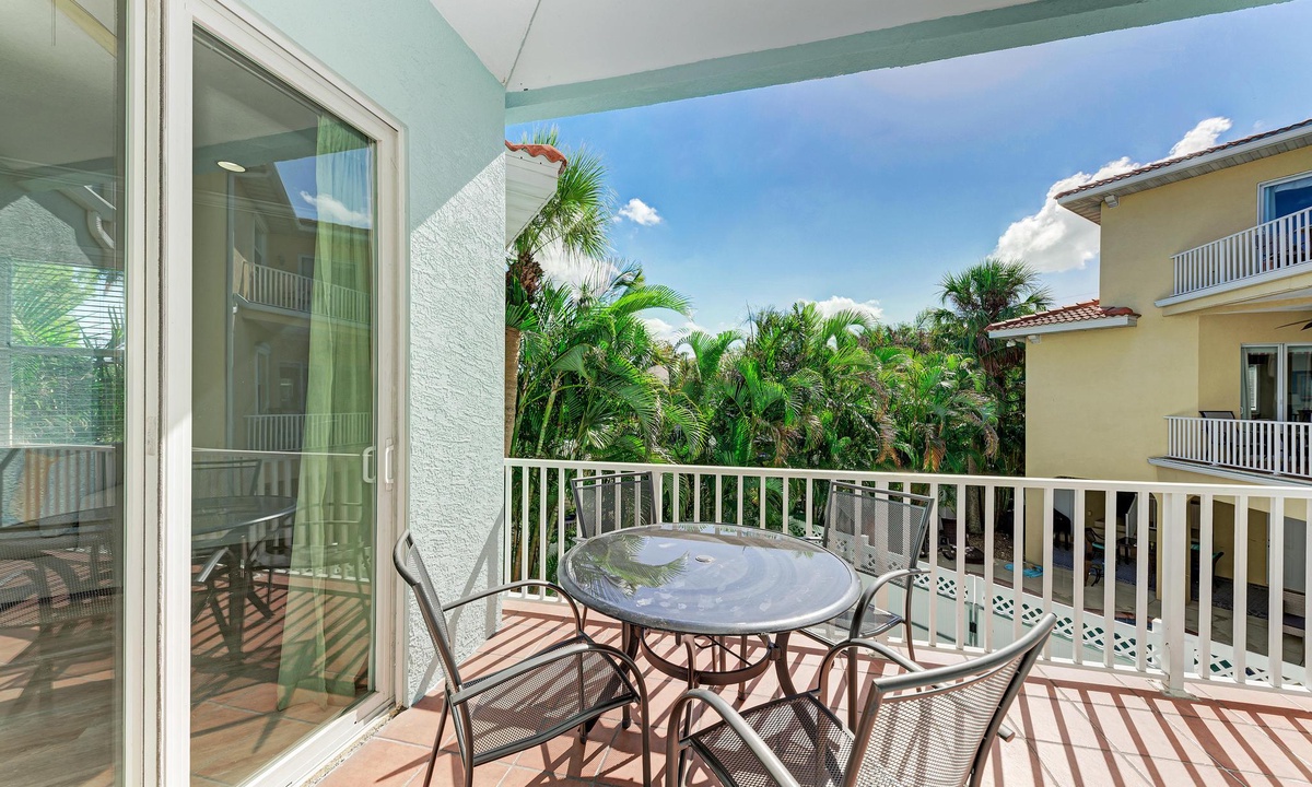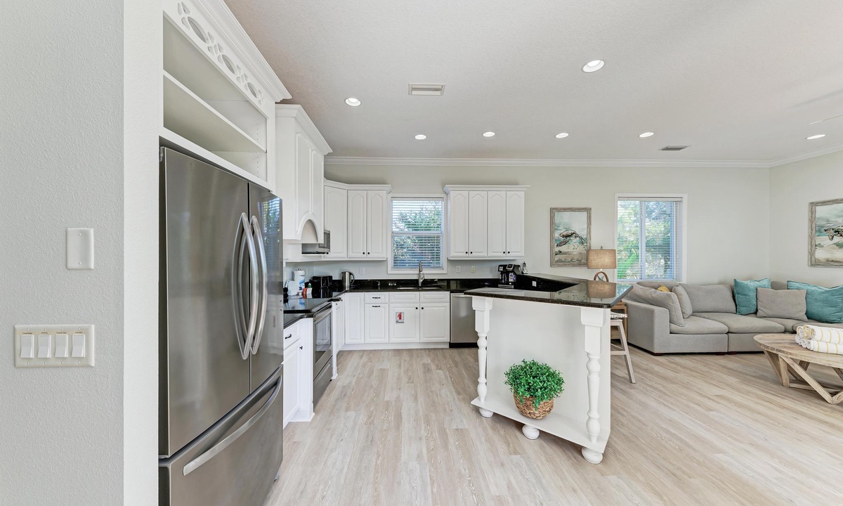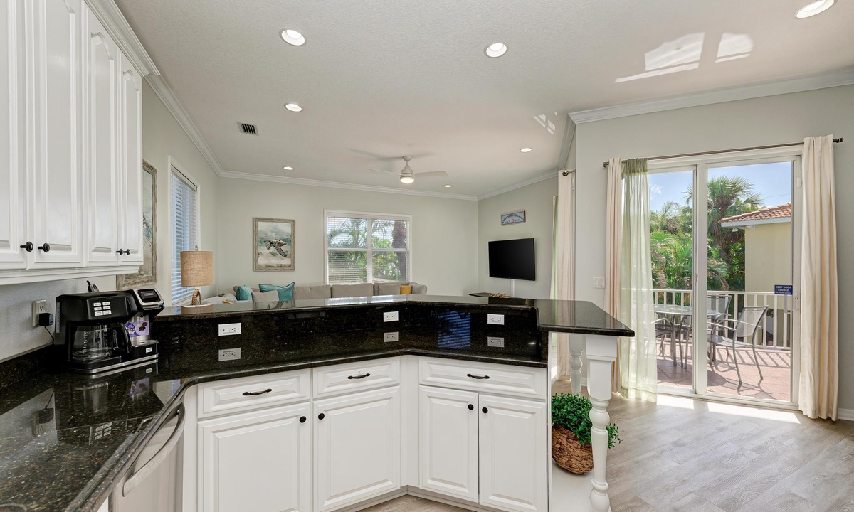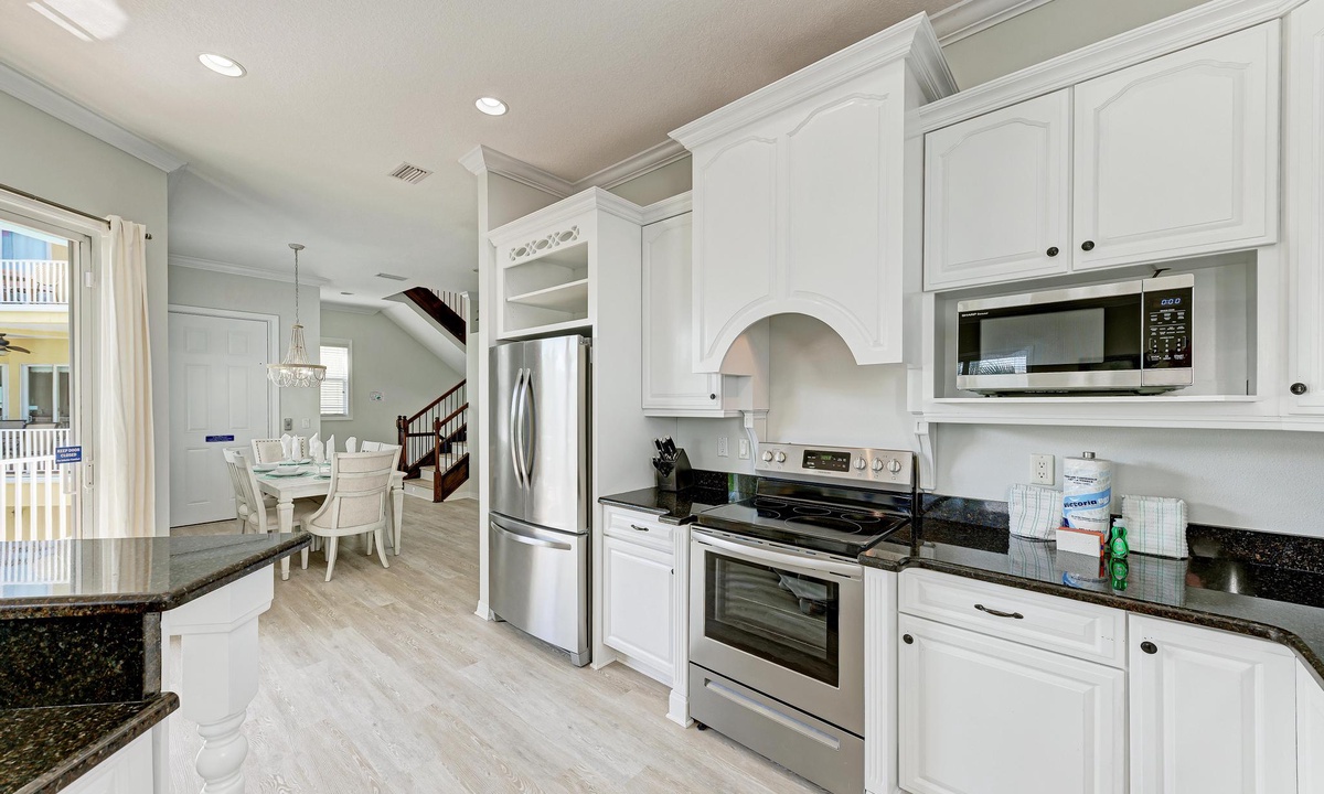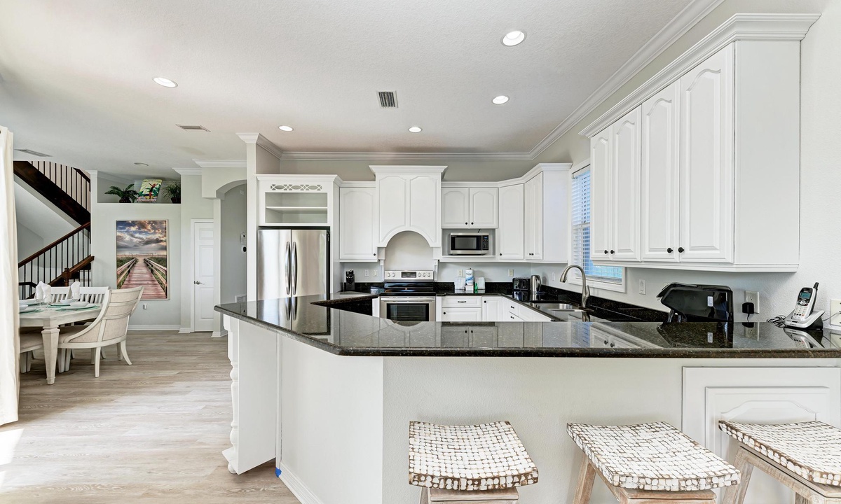 From the bright and airy entrance on the main level, take the elevator, if you choose, upstairs to the dining area featuring vaulted ceilings and open living space. The open kitchen hosts granite countertops, new stainless appliances and is fully equipped for all your needs including extras like a crockpot, blender, toaster and a coffee pot/Keurig. The kitchen leads to bar top seating and sectional seating in the living room, adjacent to the dining room table. The view overlooks the pool, with more balcony seating for coffee or cocktails.