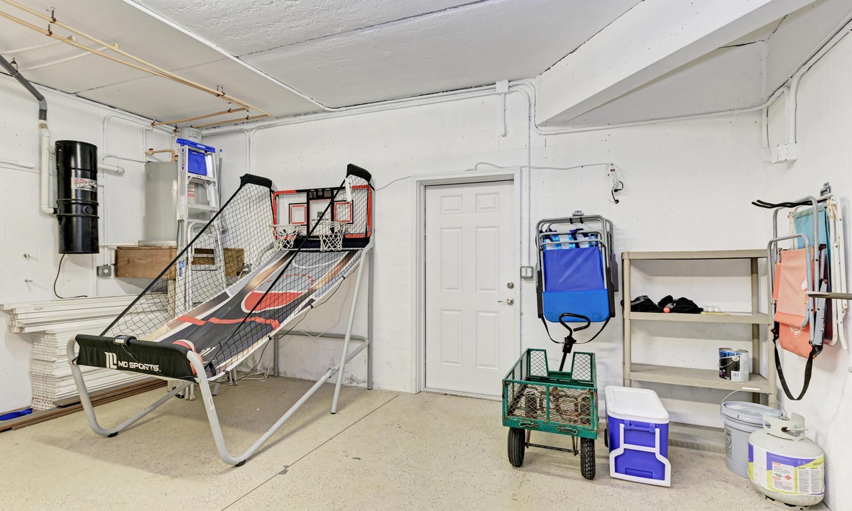 The garage is stocked with beach chairs and a wagon, a pop-o-shot basketball game and there is an outdoor shower to wash the sand off before hopping in the pool. The garage has room for 2 cars, and there are 2 additional parking spaces in front of the house.