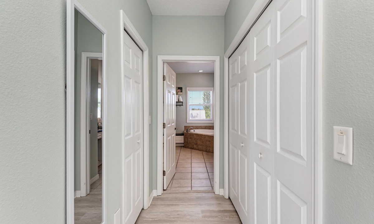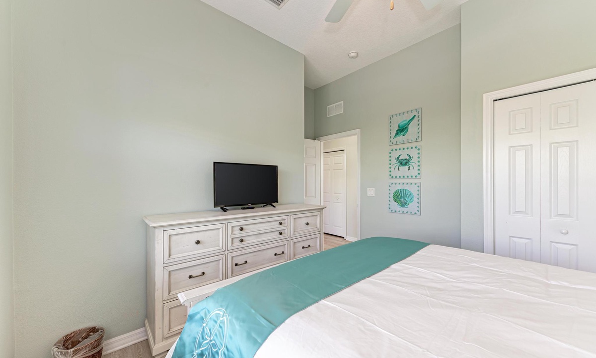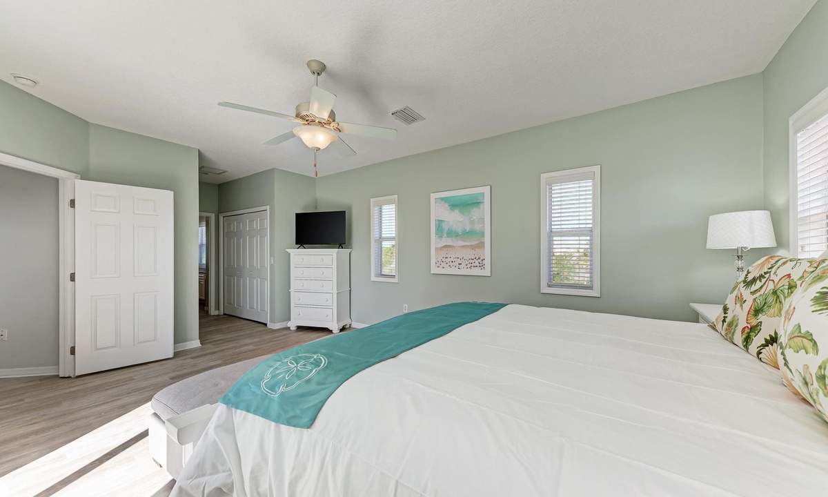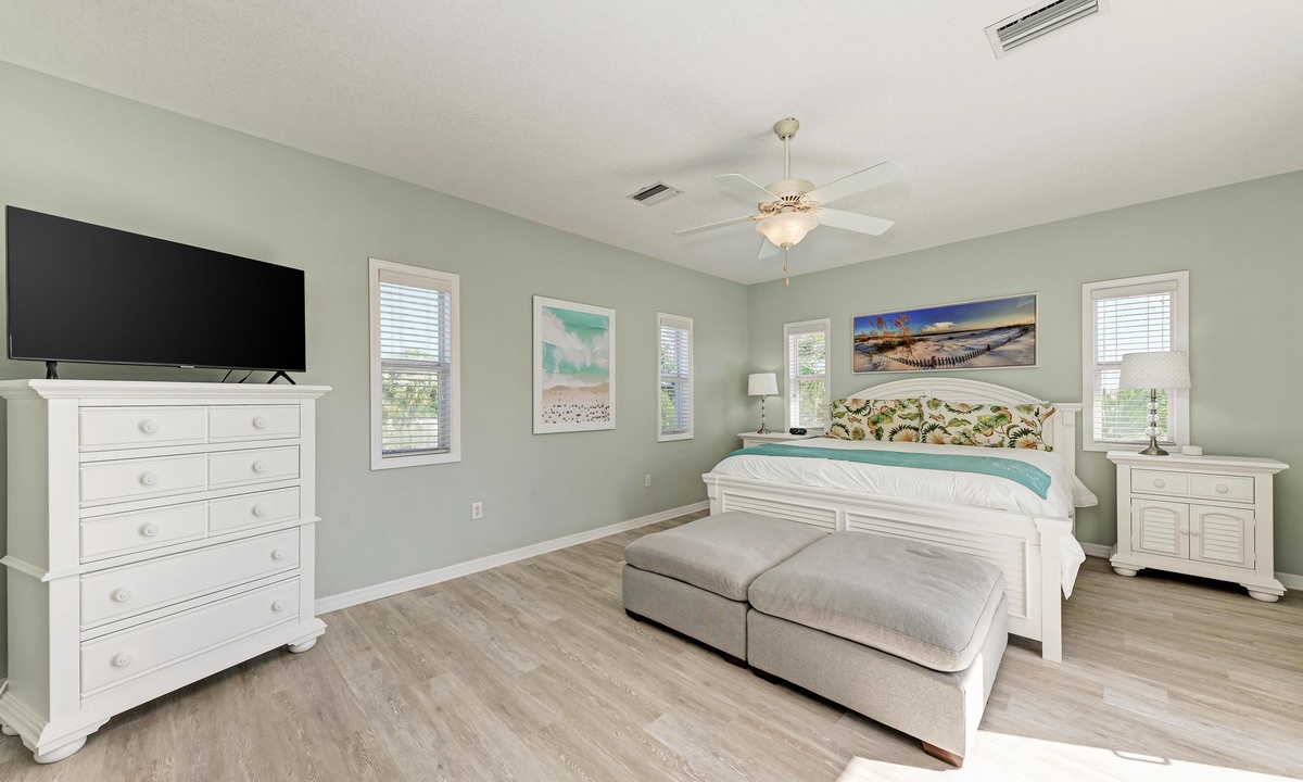 The third level opens into the luxurious Primary Bedroom. Feel like royalty in this enormous suite with a king bed, lounging area, and 43" smart TV. Soothe your cares away in the garden tub or walk-in shower. The spacious floor plan has double separated sinks and a private toilet room. Off of this bedroom is a desk in case you need to sneak in an email. For your convenience, there is a full-size laundry room and ironing station on this floor as well.