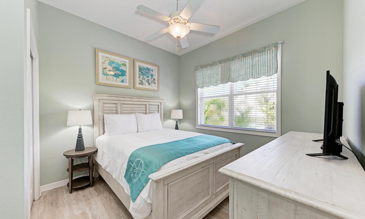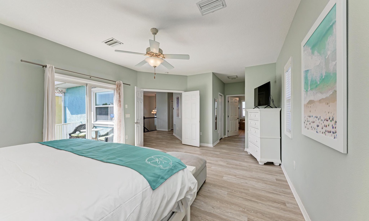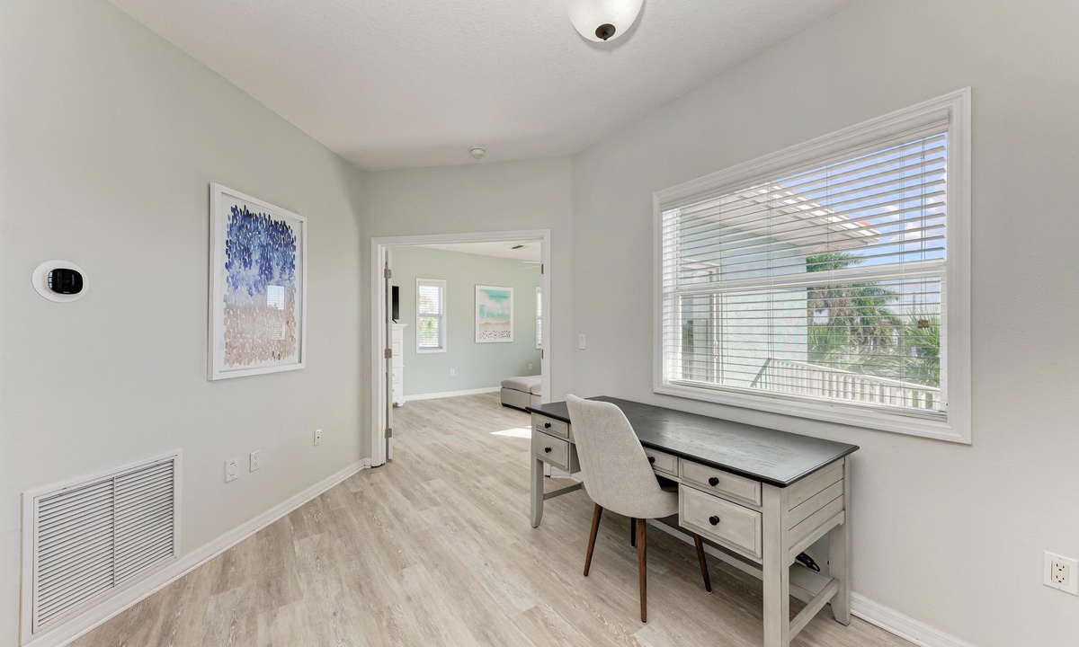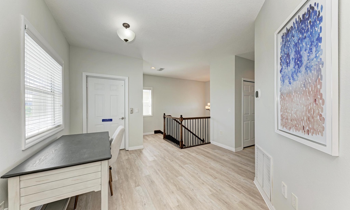 The third level opens into the luxurious Primary Bedroom. Feel like royalty in this enormous suite with a king bed, lounging area, and 43" smart TV. Soothe your cares away in the garden tub or walk-in shower. The spacious floor plan has double separated sinks and a private toilet room. Off of this bedroom is a desk in case you need to sneak in an email. For your convenience, there is a full-size laundry room and ironing station on this floor as well.