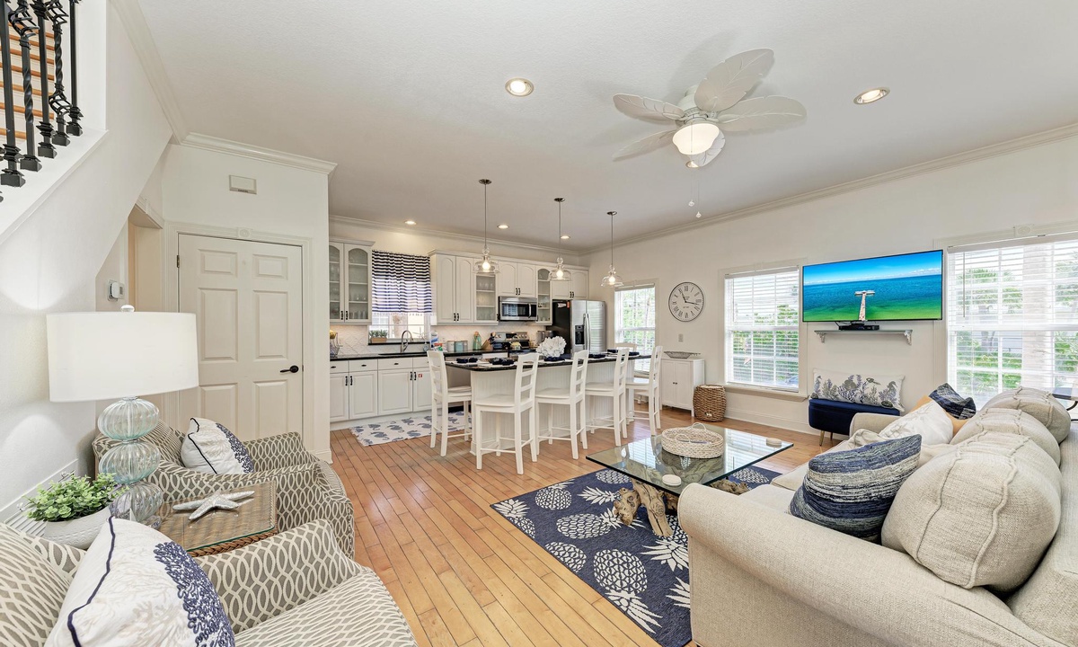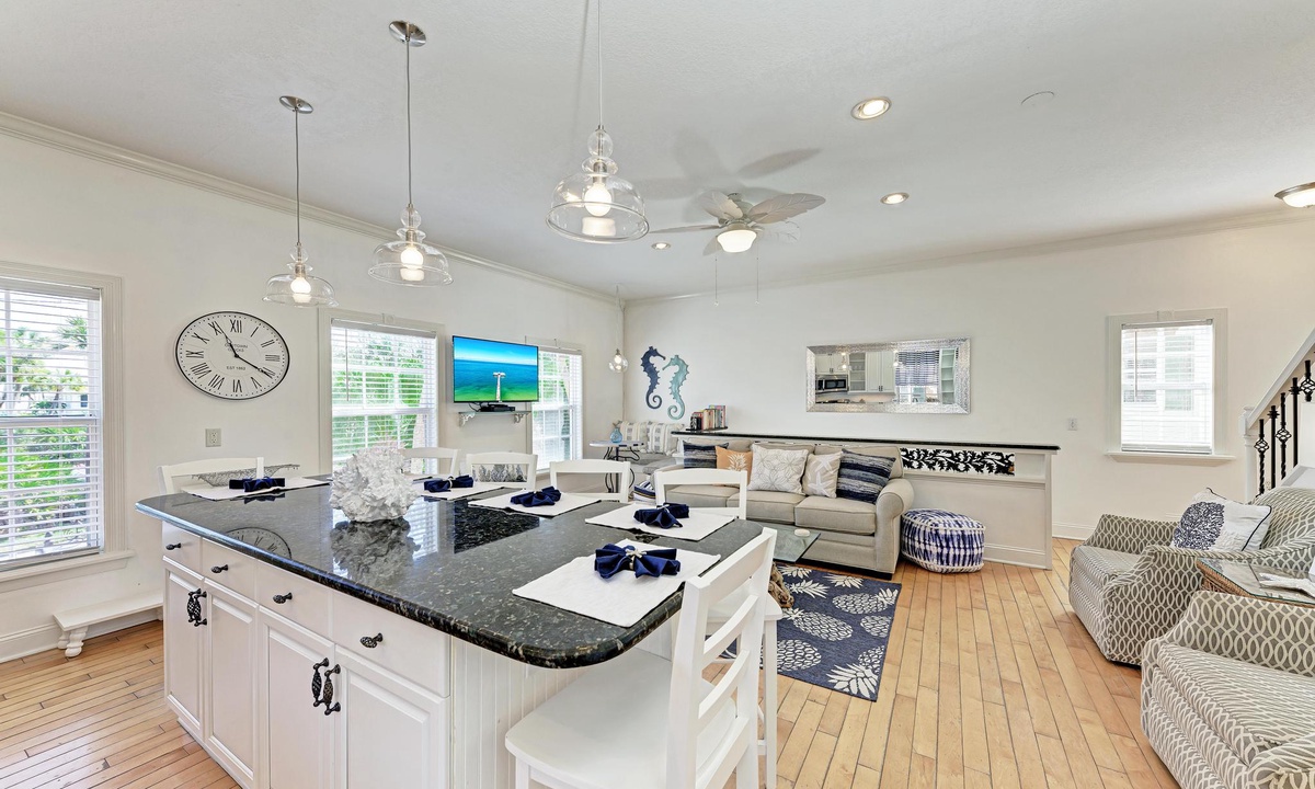The main living area is arranged in an open floor plan, which means no one must miss out on the fun while they grab a snack or make a drink. A DVD player is available in the living room, making it easy to have a movie night for the whole group.